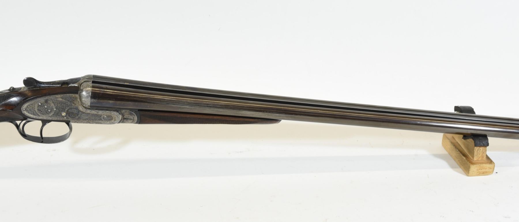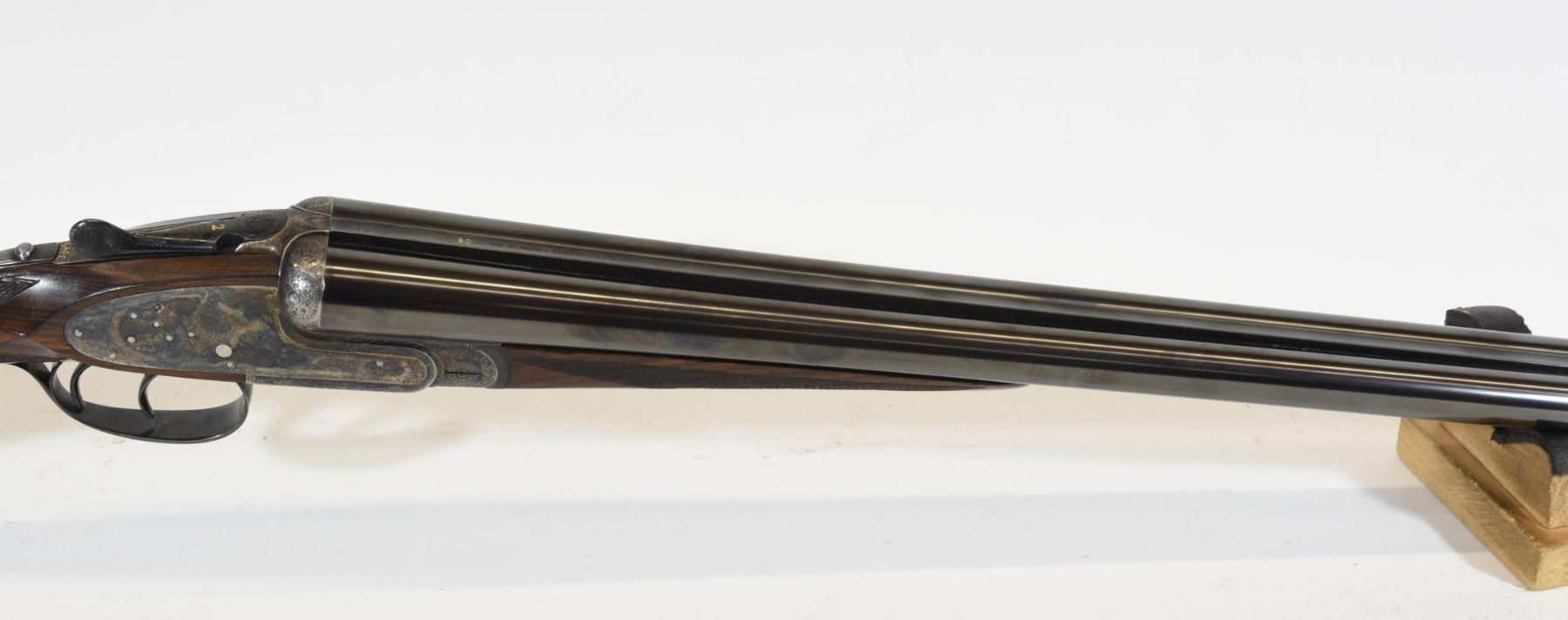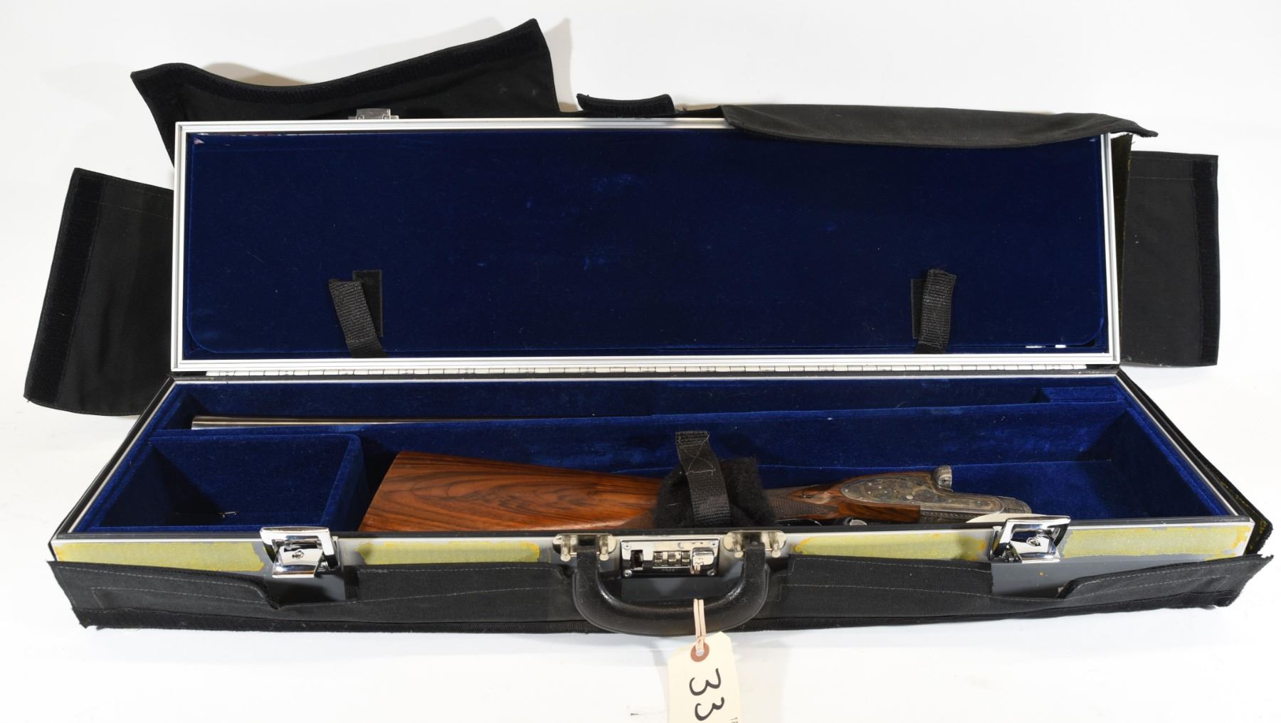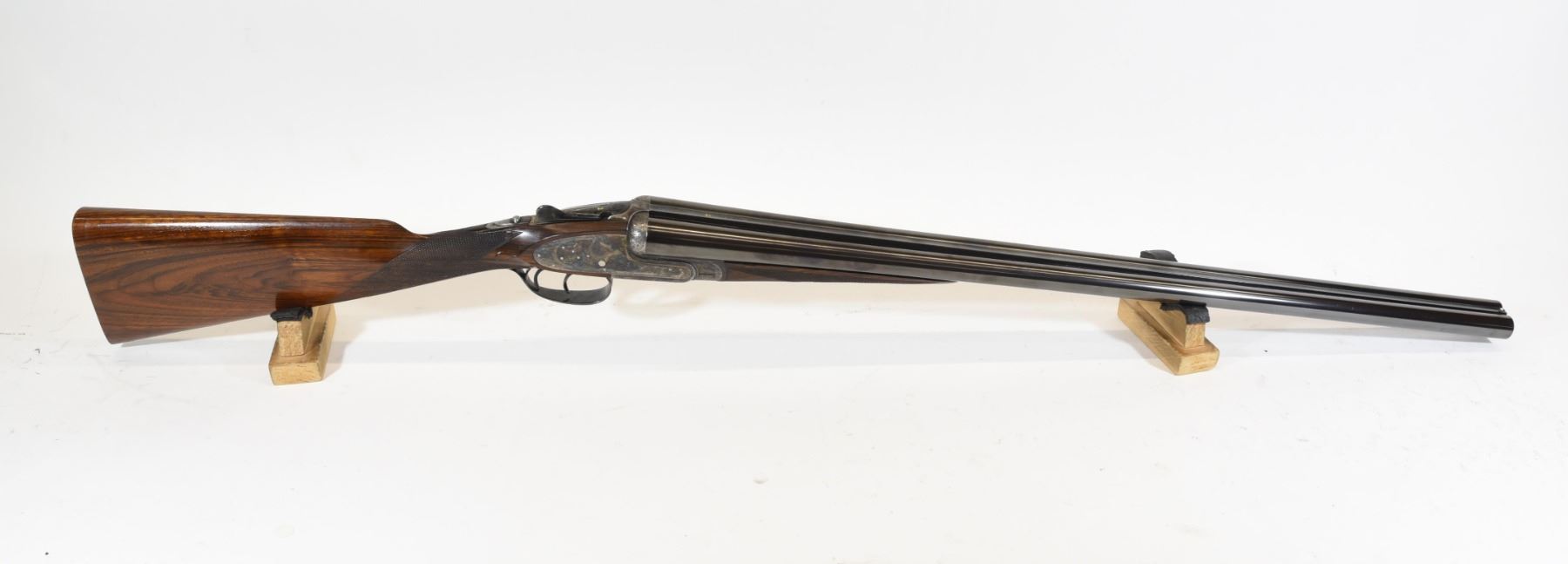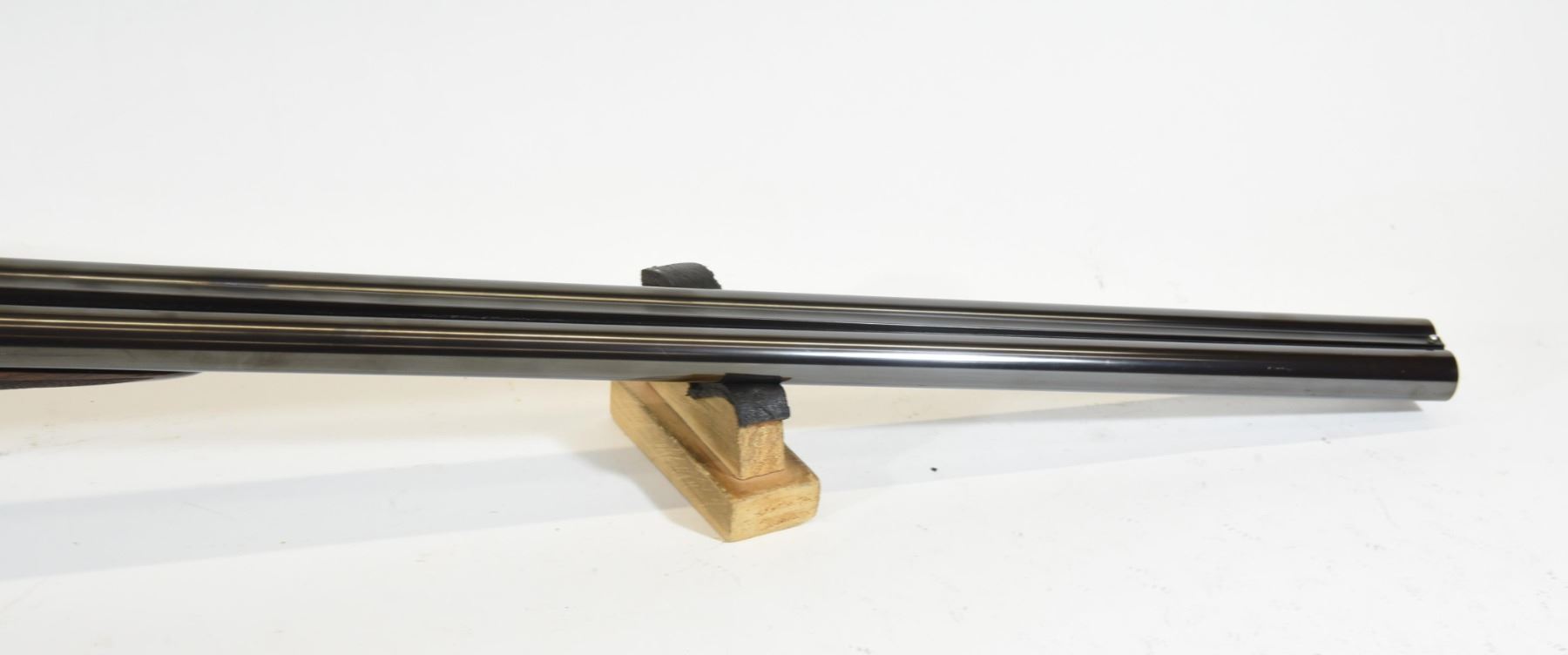 Non-restricted, multi-barrel, 12 Ga x 2 3/34", Set 1 - 28" barrels with fixed chokes (M, IC), Set 2 - 28" barrels with fixed chokes (F,M), SN 522147 and 497667. Wood has some marks and scratches, set 2 has a small crack and repair on right wrist, bluing is grey on set 1, very good on set 2, bores excellent. Nice fine engraving and hard case colors. Comes with takedown case, unknown combination - do not lock.