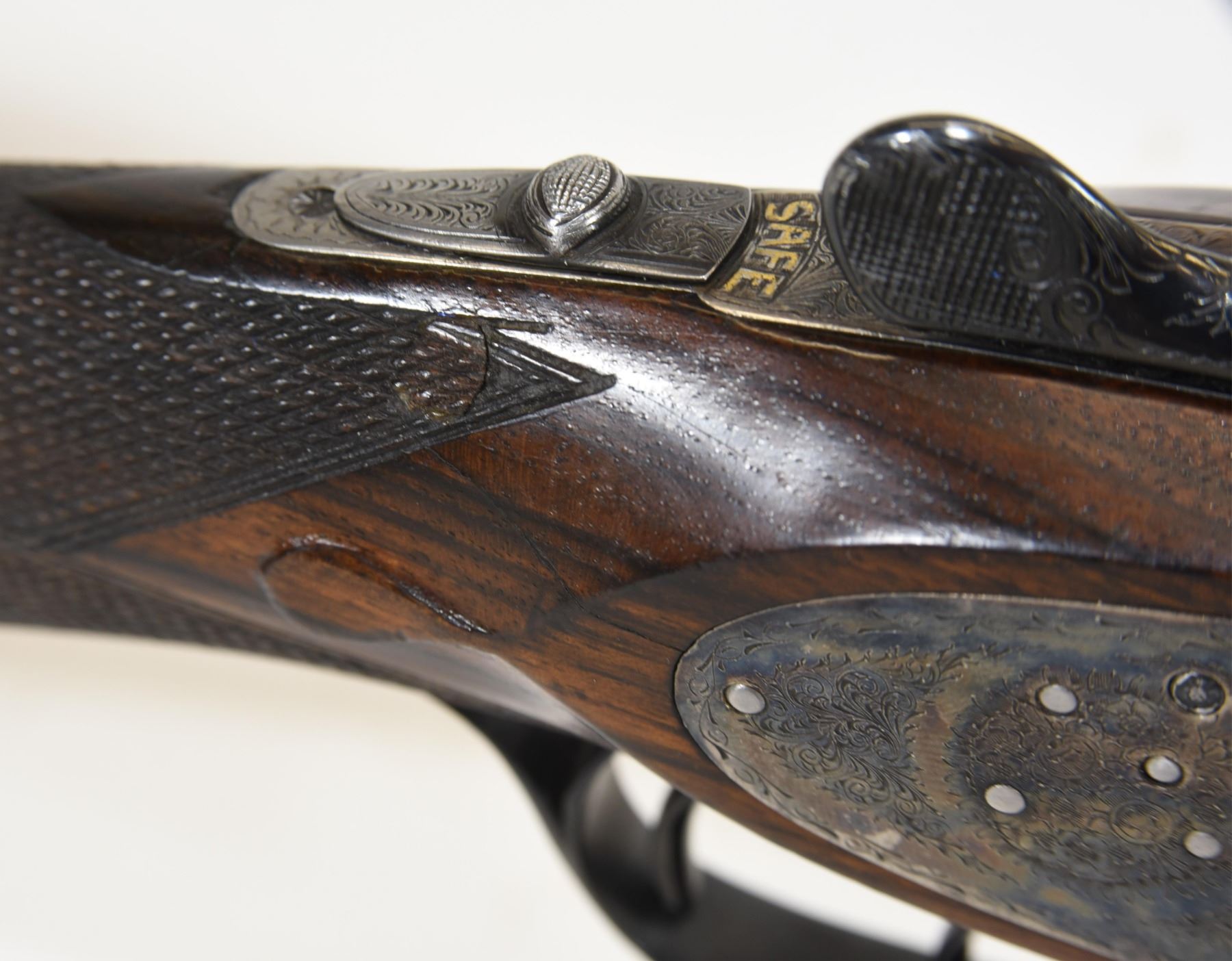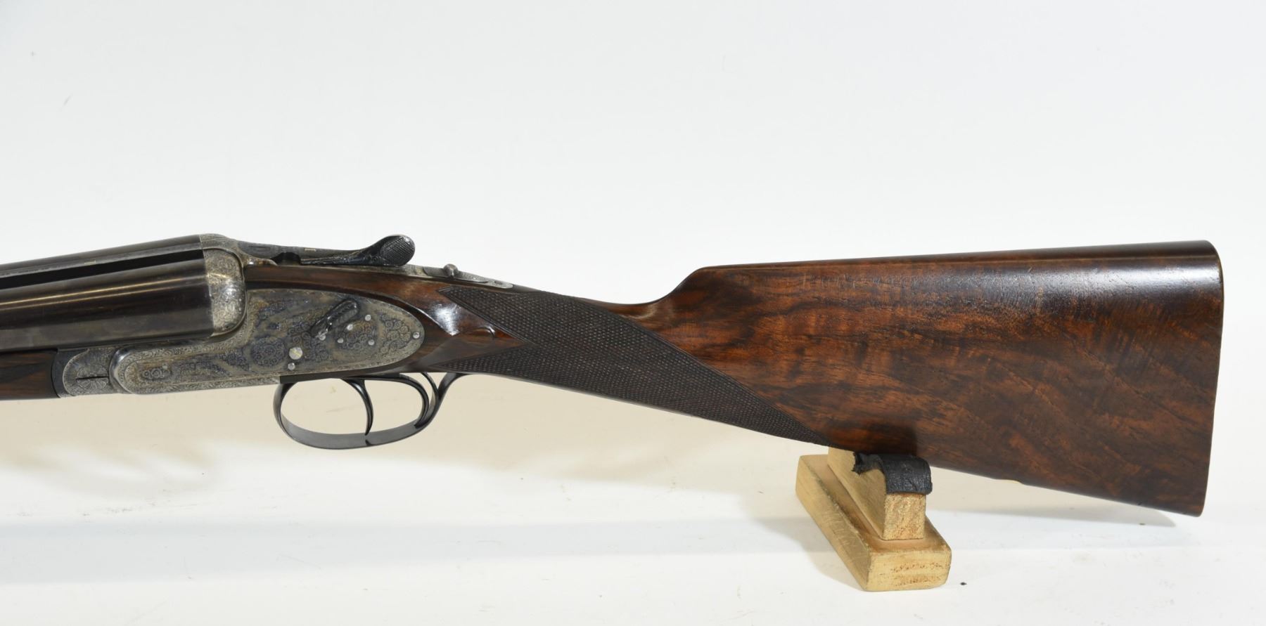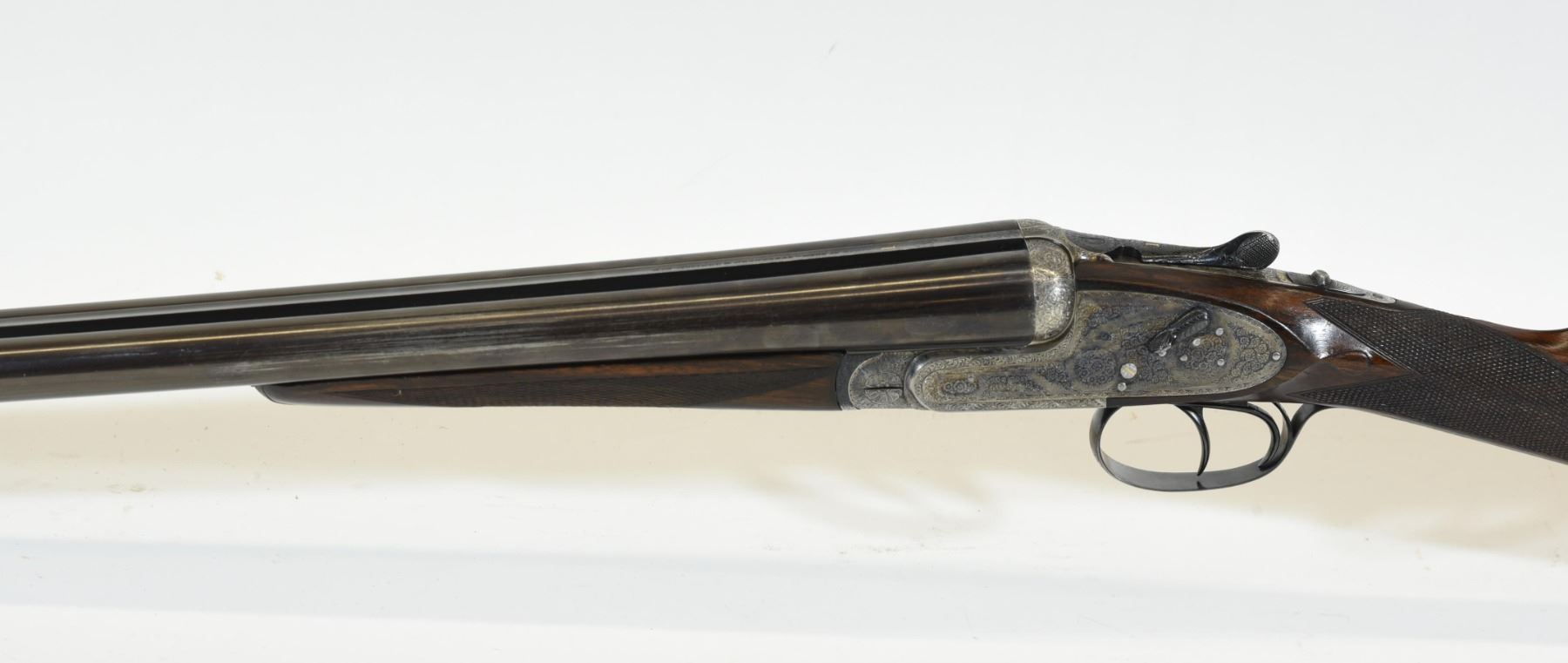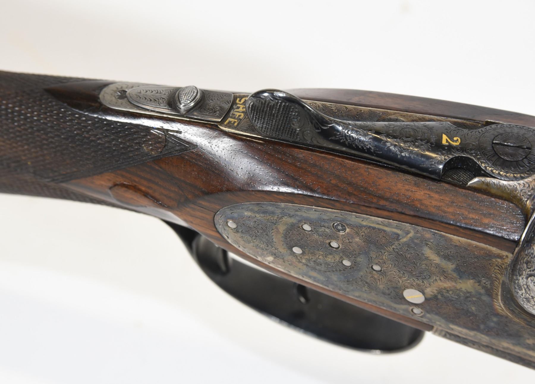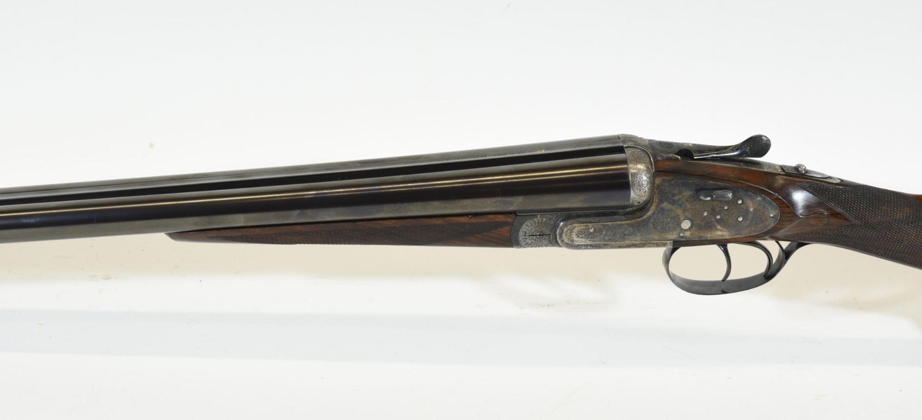 Non-restricted, multi-barrel, 12 Ga x 2 3/34", Set 1 - 28" barrels with fixed chokes (M, IC), Set 2 - 28" barrels with fixed chokes (F,M), SN 522147 and 497667. Wood has some marks and scratches, set 2 has a small crack and repair on right wrist, bluing is grey on set 1, very good on set 2, bores excellent. Nice fine engraving and hard case colors. Comes with takedown case, unknown combination - do not lock.