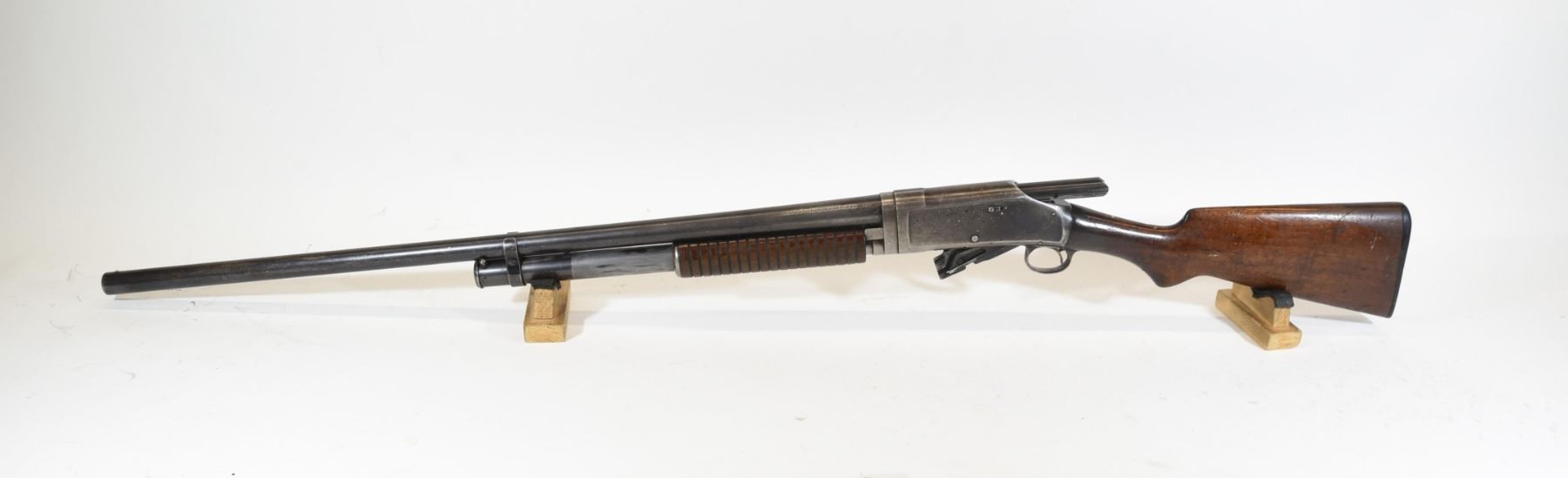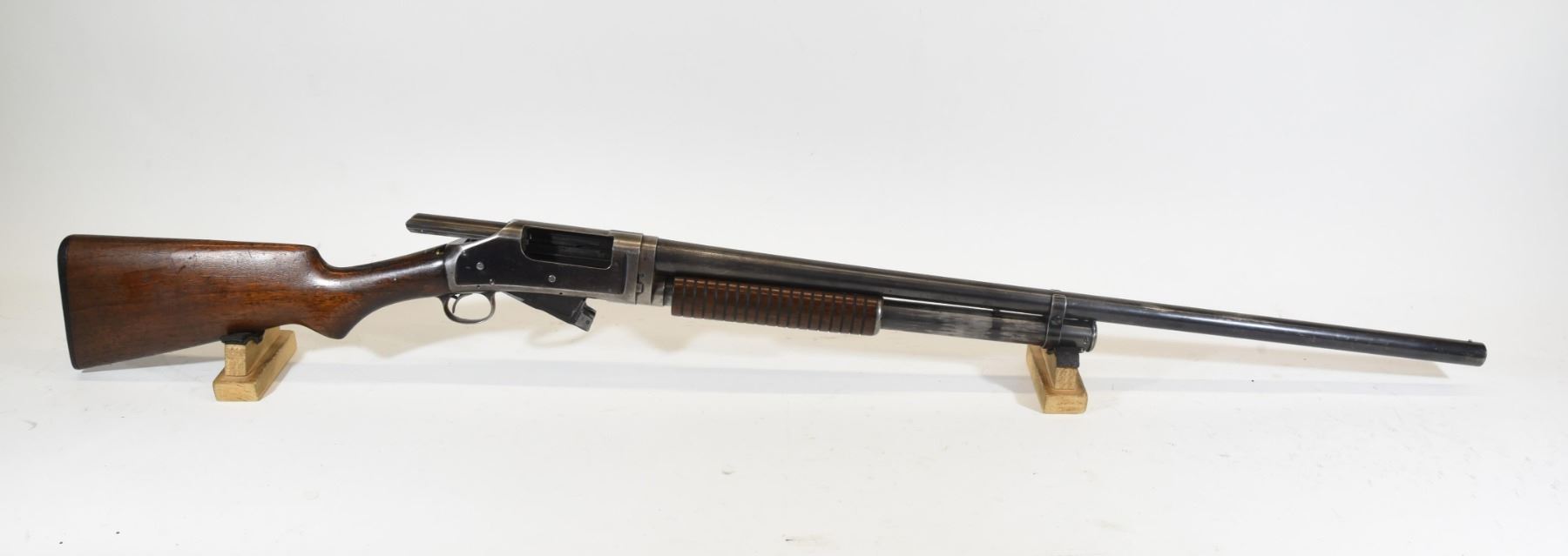 Non-restricted, pump action, 12 Ga x 2 3/4", 30" barrel with fixed full choke, SN E787327. Wood has scratches, dents and gouges, bluing almost all gone, numerous scratches, bore very good.
