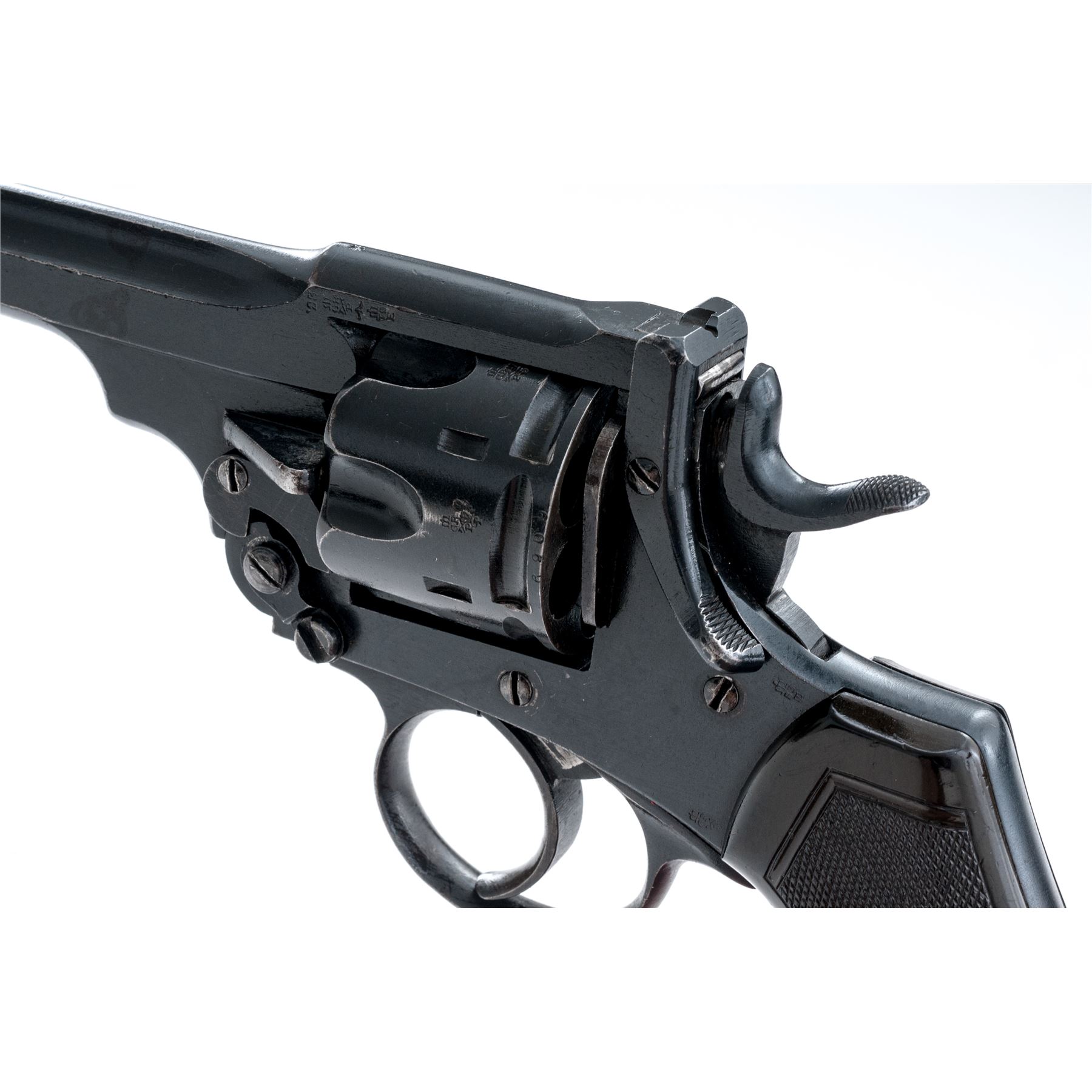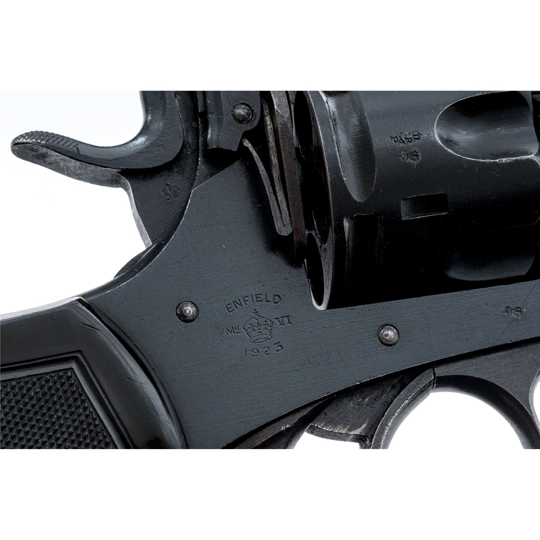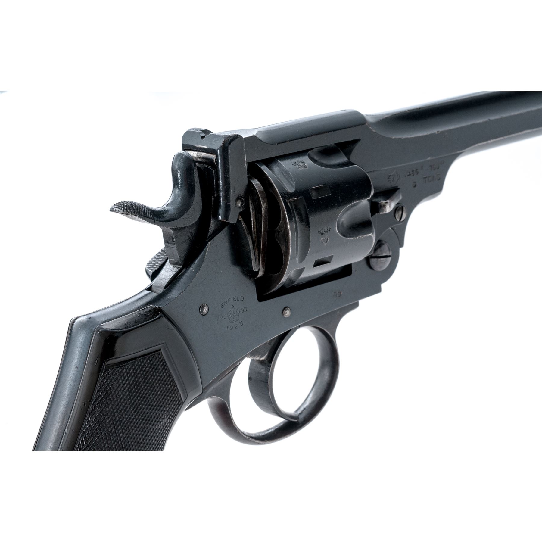 Enfield MK VI Double Action Revolver, #9495, .45 ACP cal., 6'' barrel, blued finish, plastic grips, blade front sight and notched rear sight. Marked on right side of frame ''ENFIELD Mk VI/(crown)/1923''. Grips are each marked ''M''. Left side barrel has Enfield proof and view stamps and a '''23'' in service date; right side barrel has London export proofmarks. Rear of cylinder has been shaved by importer to chamber .45 ACP cartridge. Asterisk stamped on top of barrel. Bottom of grip frame has light file marks. Condition overall is very good with over 90% finish remaining on the metal. Left side grip has a chip missing at the bottom and both grips are faded to a light brown, otherwise very good with small areas of flattening. Bore has an area of light frosting, otherwise bright and very good; chambers have a couple of spots that may clean better, otherwise clean. Lockup is stiff, action is smooth. Est.: $500-$650. (C&R/PPT)
