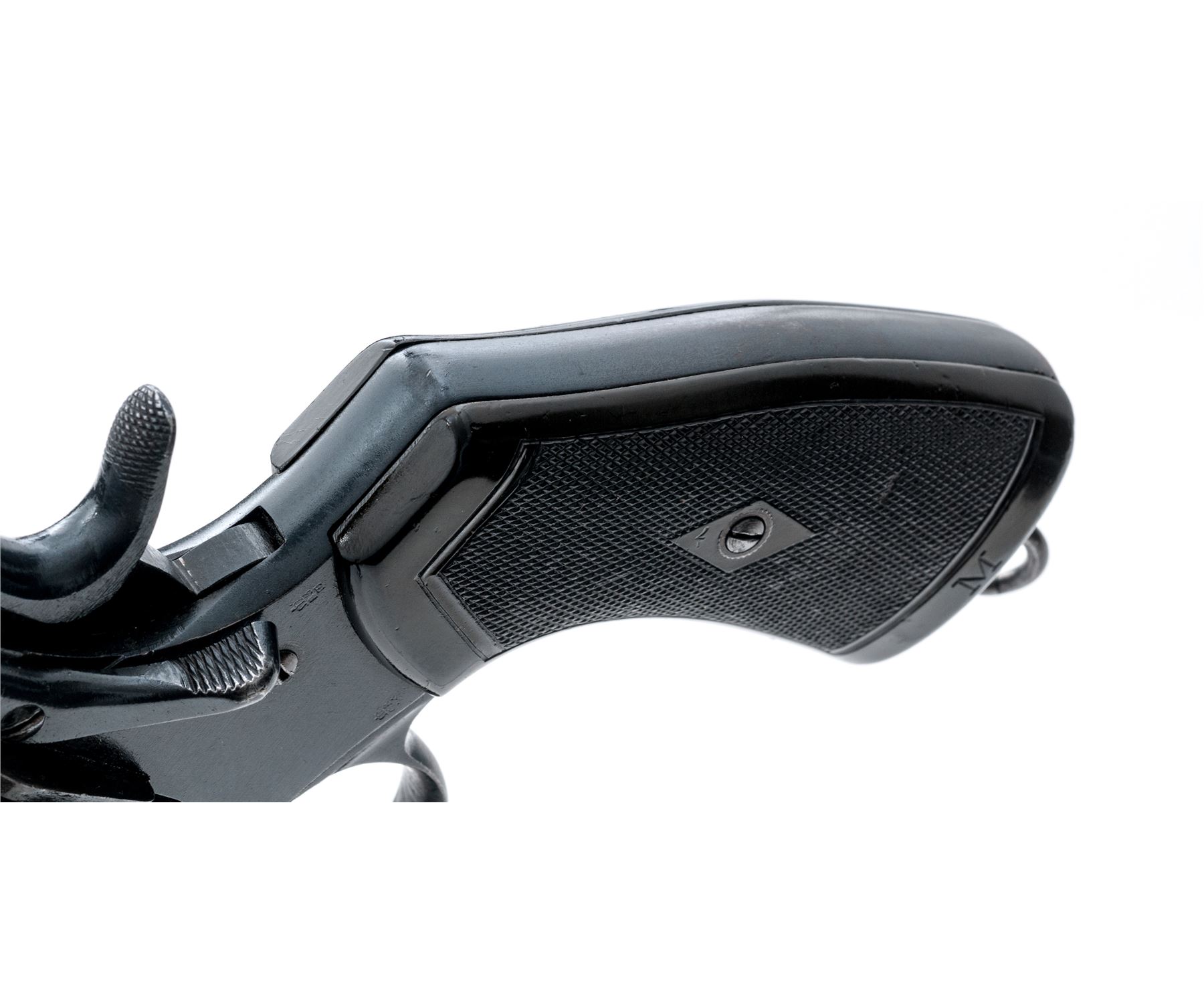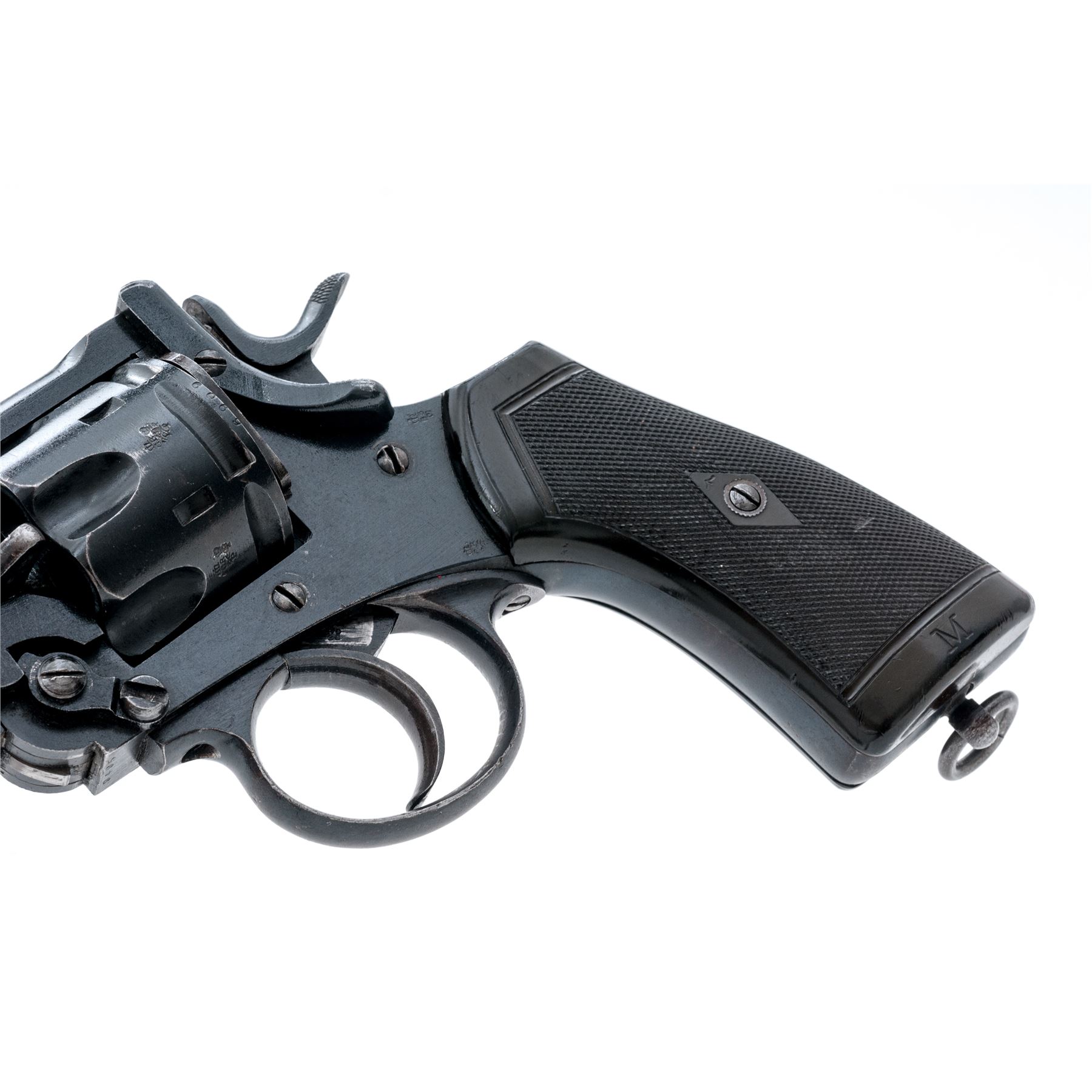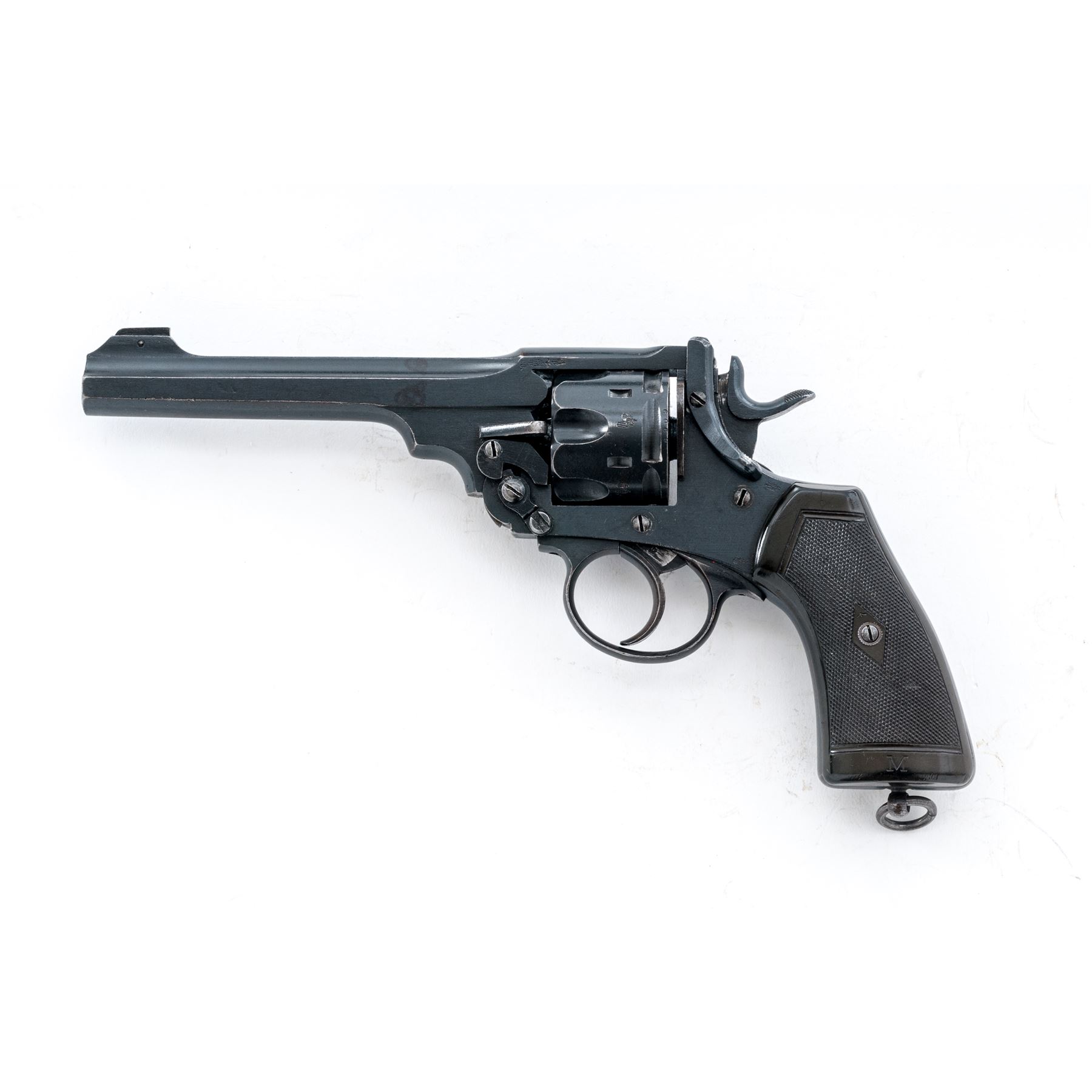 Enfield MK VI Double Action Revolver, #9495, .45 ACP cal., 6'' barrel, blued finish, plastic grips, blade front sight and notched rear sight. Marked on right side of frame ''ENFIELD Mk VI/(crown)/1923''. Grips are each marked ''M''. Left side barrel has Enfield proof and view stamps and a '''23'' in service date; right side barrel has London export proofmarks. Rear of cylinder has been shaved by importer to chamber .45 ACP cartridge. Asterisk stamped on top of barrel. Bottom of grip frame has light file marks. Condition overall is very good with over 90% finish remaining on the metal. Left side grip has a chip missing at the bottom and both grips are faded to a light brown, otherwise very good with small areas of flattening. Bore has an area of light frosting, otherwise bright and very good; chambers have a couple of spots that may clean better, otherwise clean. Lockup is stiff, action is smooth. Est.: $500-$650. (C&R/PPT)