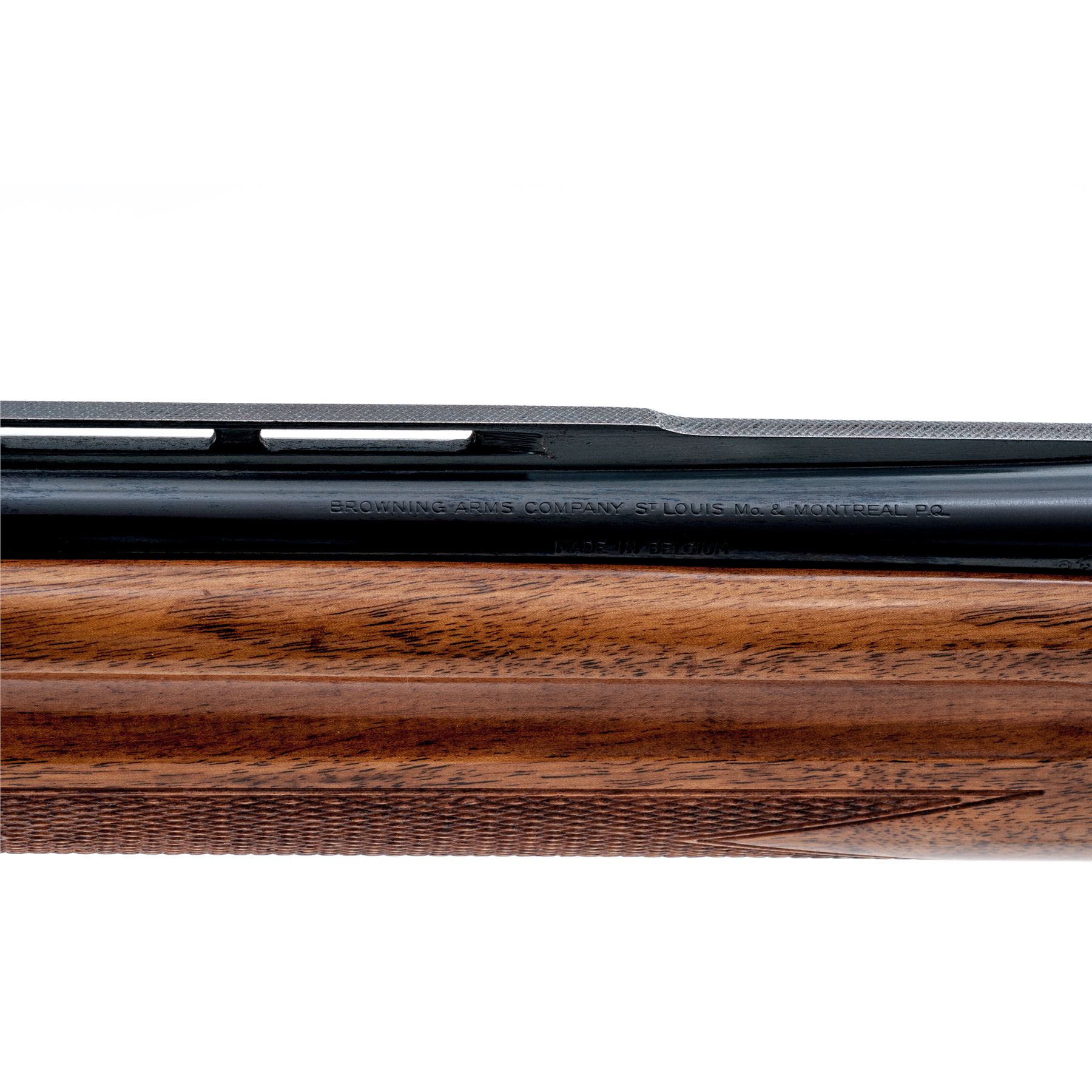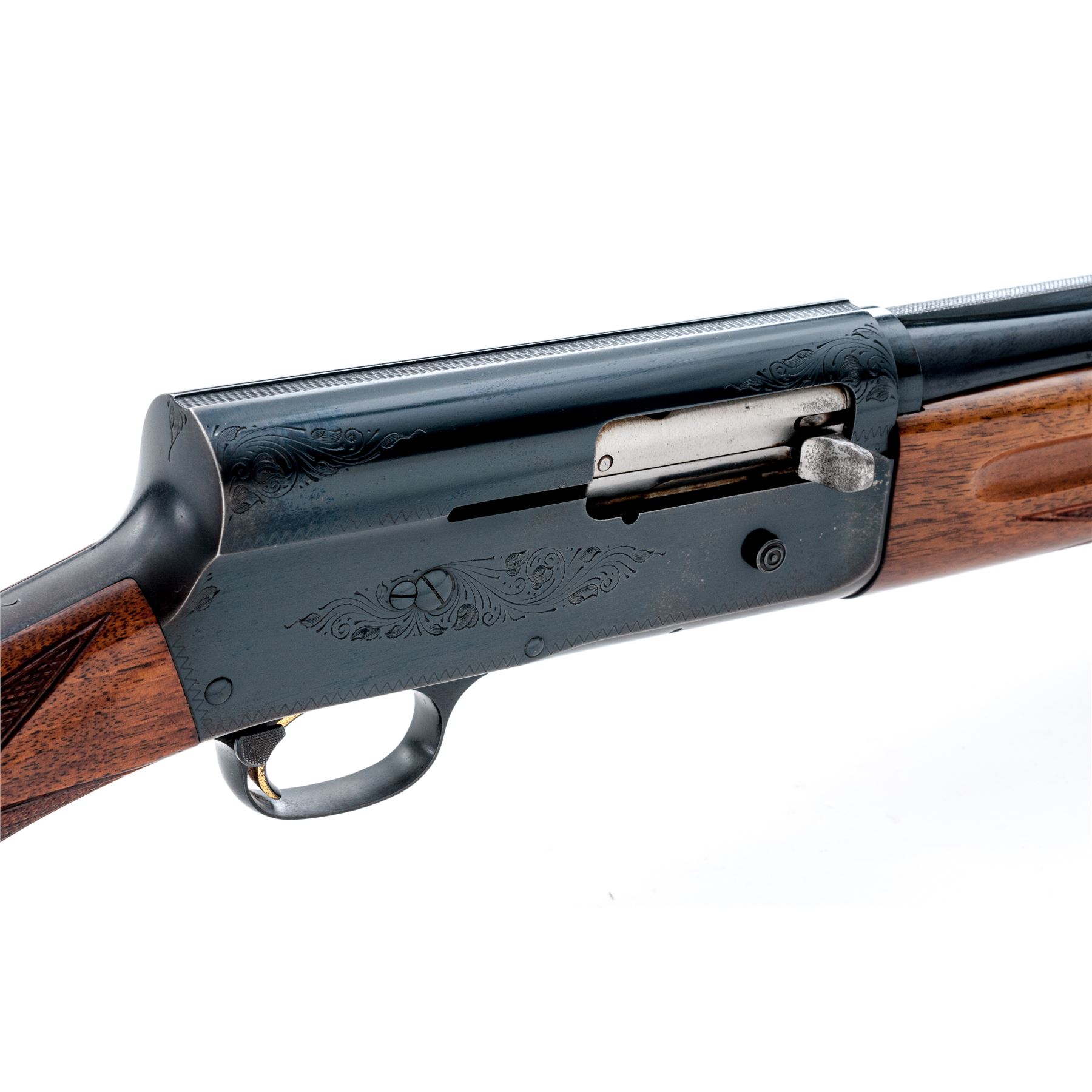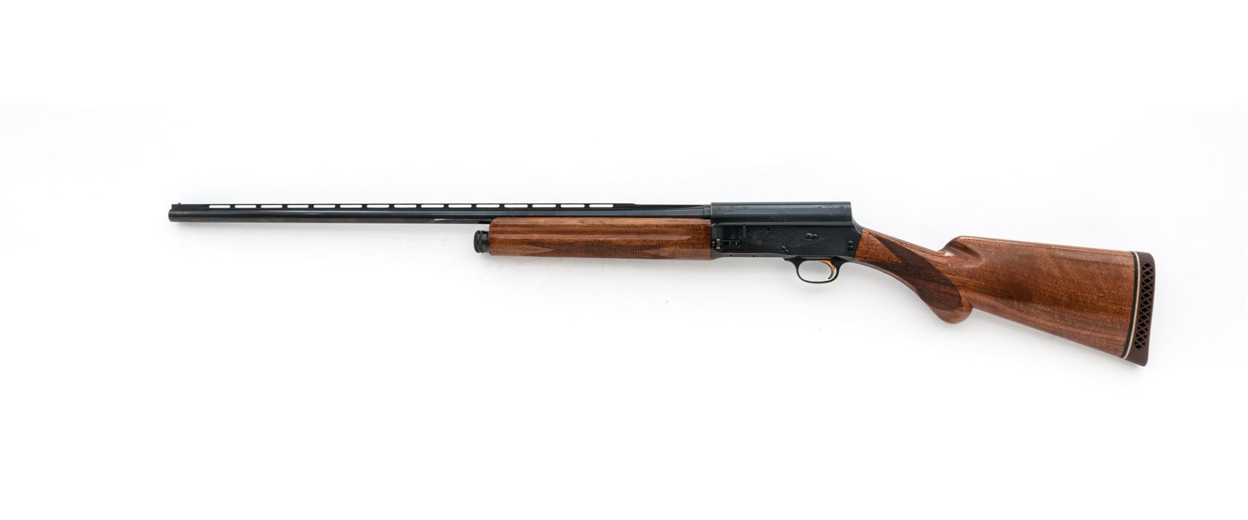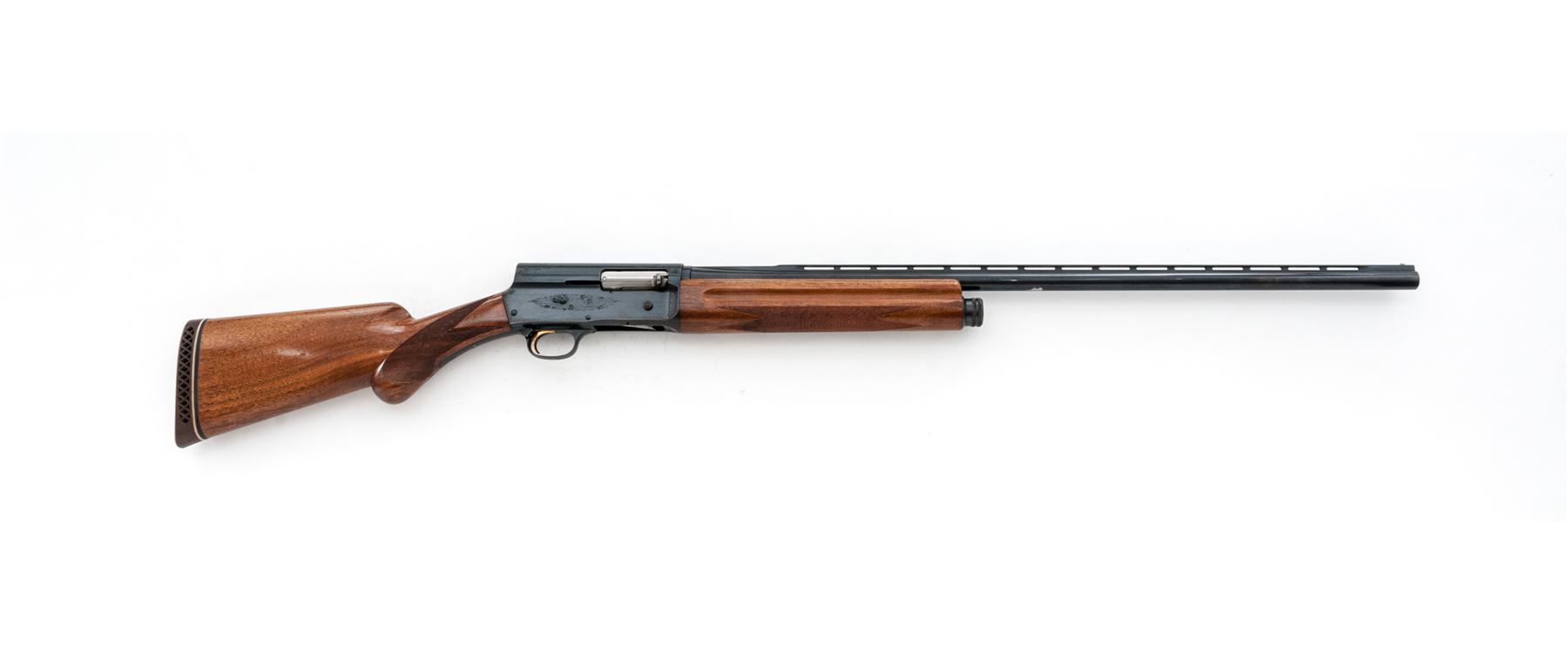 Browning Lightweight 20 Auto-5 Semi-Automatic Shotgun, #5Z97150. 20 ga. 27.5'' vent rib barrel has a 2-3/4'' chamber and is choked full. Standard grade receiver is lightly engraved, marked ''Twenty'', and has all the Browning Auto features. Slender forend and round-knob buttstock are light-toned walnut with high-gloss finish; Pachmayr Whiteline butt pad installed. Mfg'd 1965 by FN. Condition is very good, with few handling marks to buttstock and very small areas of frosting to receiver, but little wear to action, which still snaps tight and functions correctly. Bore is bright. Est.: $600-$800. (C&R)