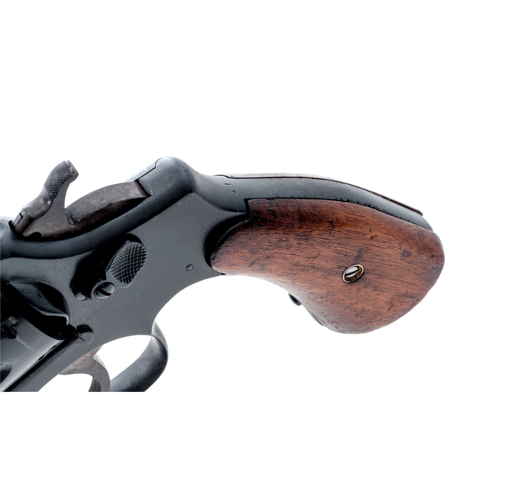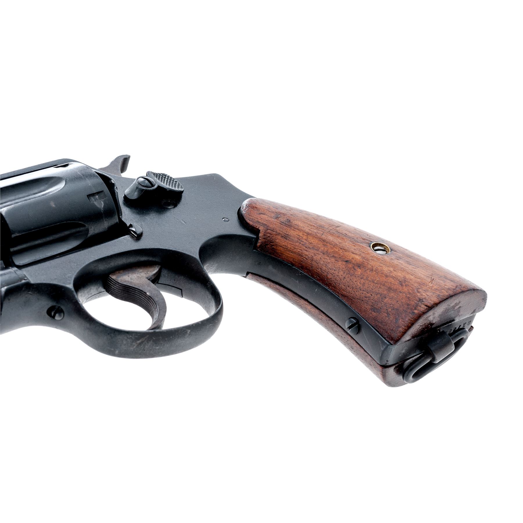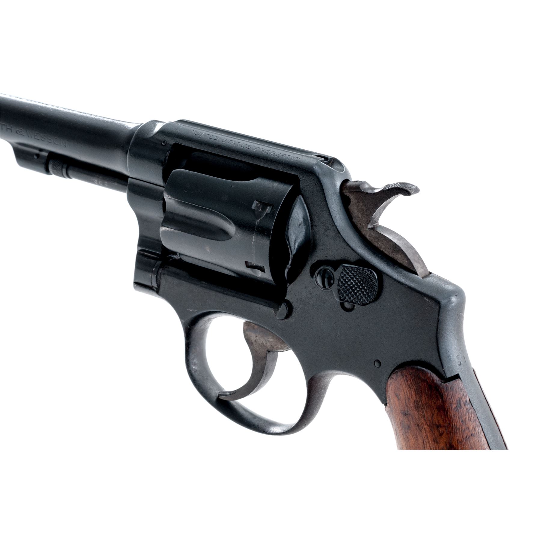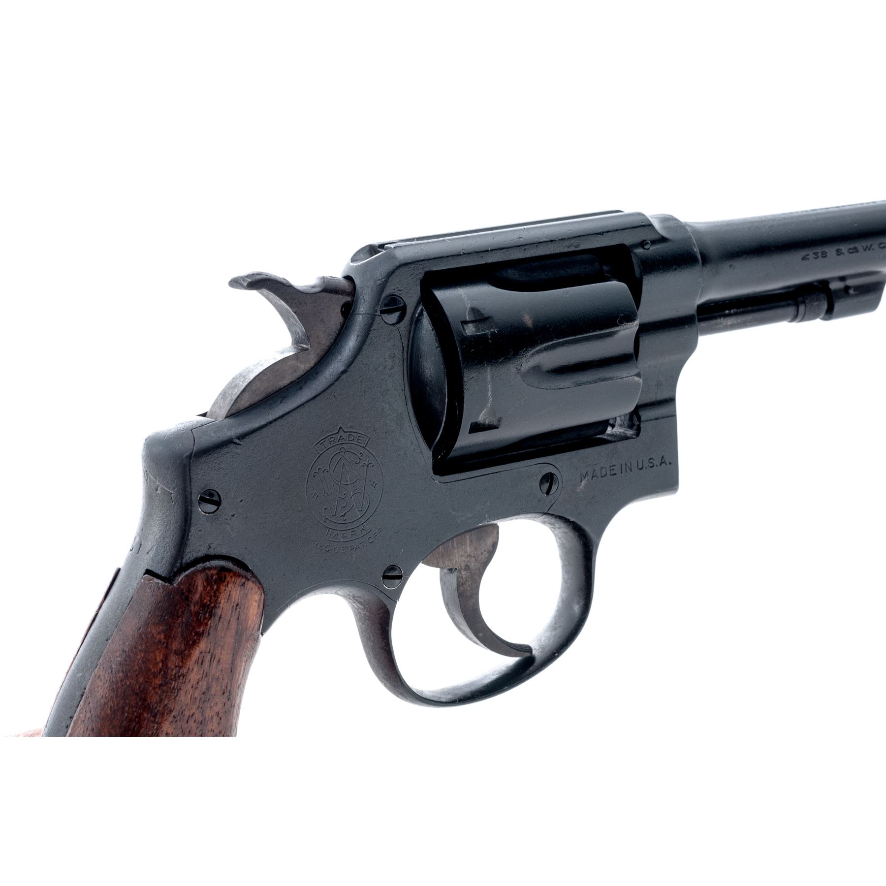 Smith & Wesson M&P Model Double Action Revolver, #917485, .38 S&W cal., 5'' barrel, matte finish, smooth walnut grips. Condition is very good as refinished, retaining approx. 96% later finish. Grips with light general bruising and fit somewhat oversized. Crisp action, bright bore. Est.: $250-$450. (C&R/PPT)