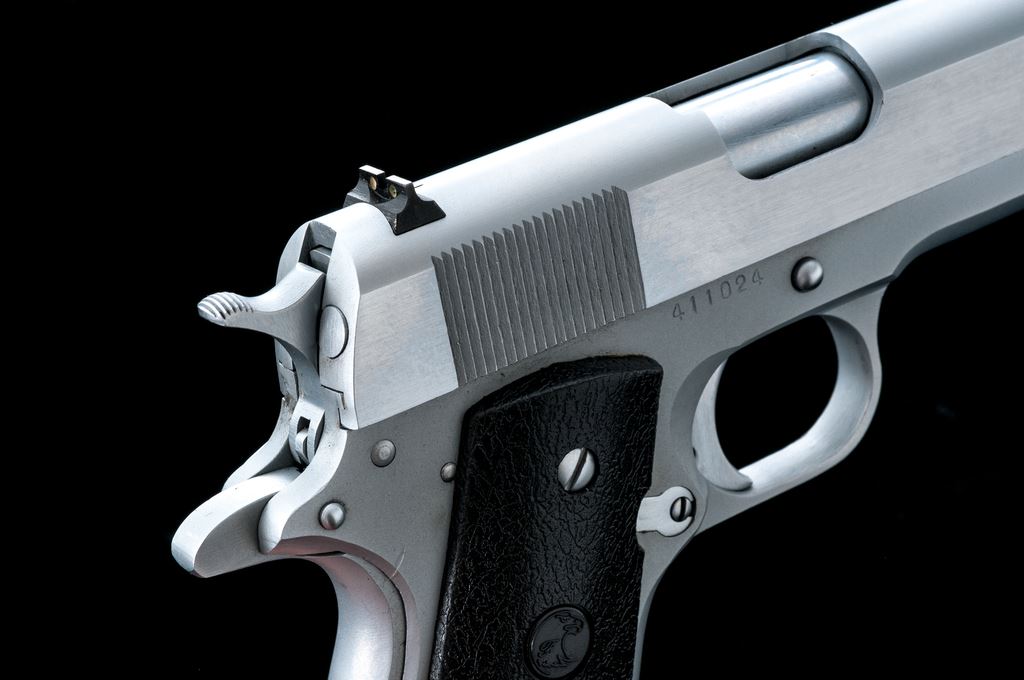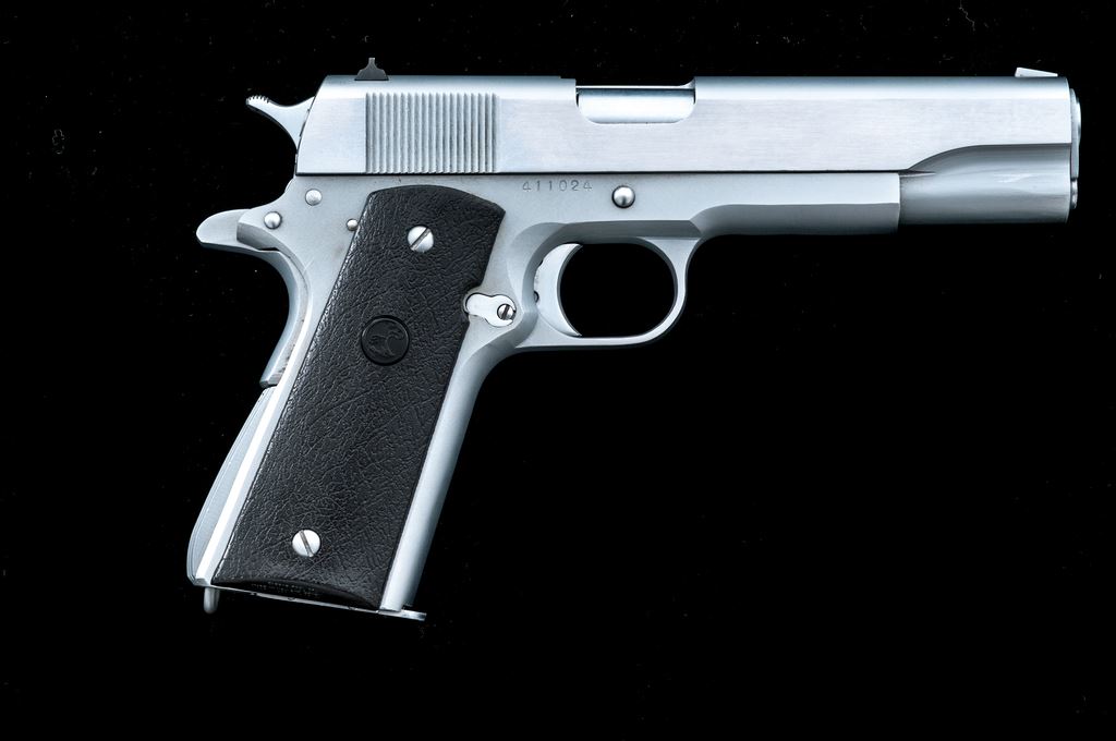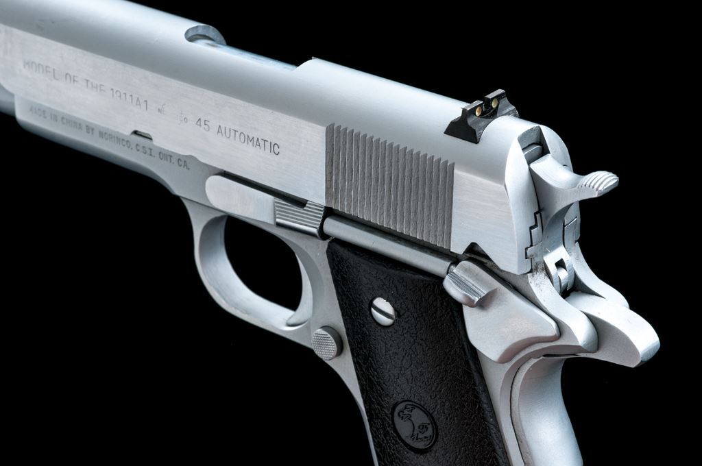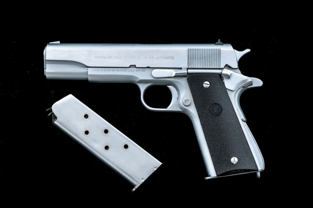 Norinco ''Model of the 1911-A1'' Semi-Automatic Pistol, #411024, .45 ACP cal., 5'' barrel, hard chrome finish, black rubber grips, arched mainspring with lanyard loop, three-dot sight system, with two (2) magazines and instruction sheet. Condition is excellent, showing little use. Est.: $500-$750. (Modern/PPT)