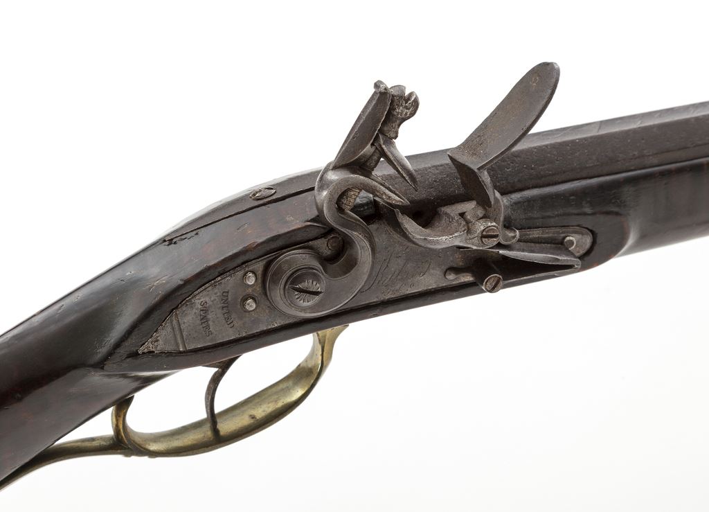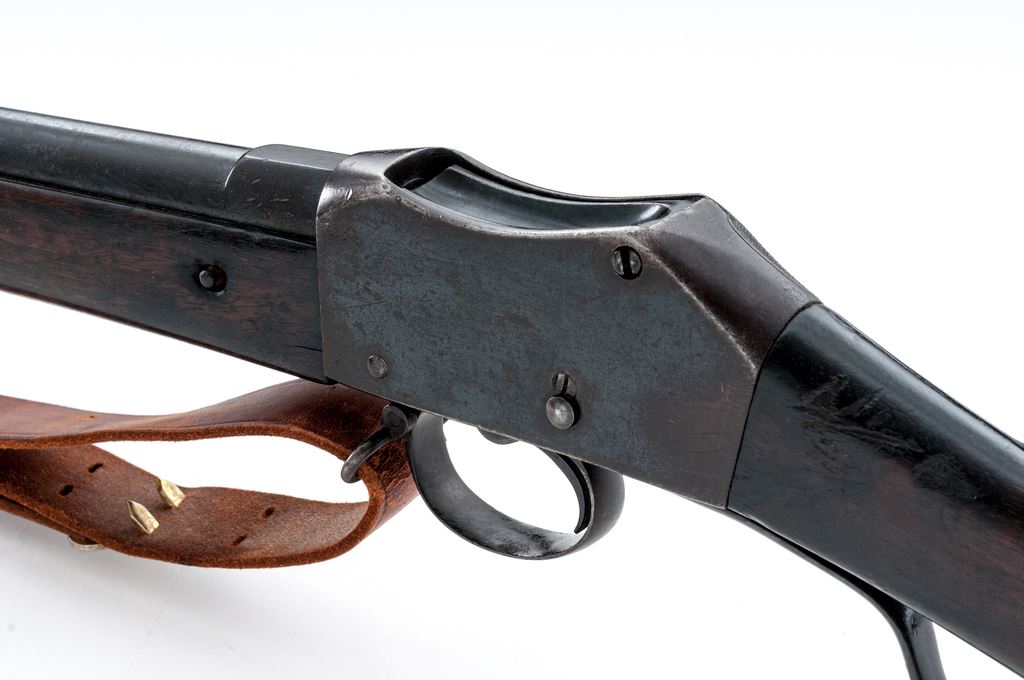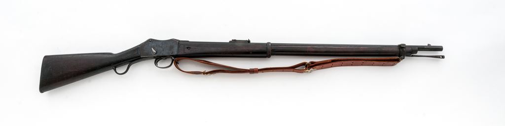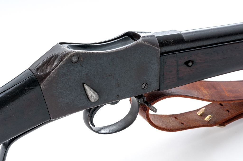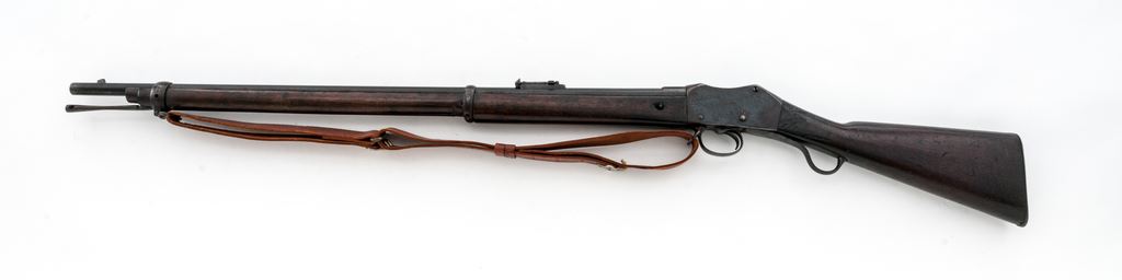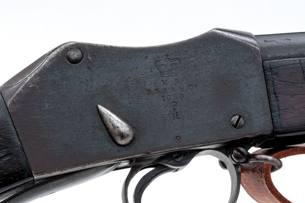 Antique British Martini-Henry Action Mark IV Fullstock Infantry Rifle, by BSA, with leather sling, NVSN, .577/450 CF cal., 33'' barrel with block-blade front and adjustable sliding leaf rear sights and two proofmarks at breech; blued steel receiver with distinctive ''thumbprint'' at right rear and operating lever that opens the dropping-block action (designed by American Henry O. Peabody) for cartridge loading/extraction/cleaning, marked on top ''S.X'' (strengthened extractor) and on right side ''(large crown)/V.R./B.S.A. & M. Co./1889/(crown)/Broad Arrow/IL/2''; blued steel triggerguard with front sling swivel; two steel barrel bands (front with sling swivel below and integral bayonet lug on right side); straight steel buttplate; slotted tulip-head ramrod; oil-finished two-piece hardwood stocks having numerous unit and other markings on butt. Condition is very good, the barrel with an overall bluish-brown patina and scattered light roughness, the receiver and triggerguard with perhaps 50% blue, the breechblock with most original blue, the buttplate dark and with moderate erosion. Stocks are solid with a long but secure crack at top wrist, numerous scrapes and dings from military use, and the aforementioned unit markings. Lower band is rusted and a likely replacement. Action is smooth and crisp; bore is clean with deep heptagonal rifling. Russet leather sling is very good showing light age and use. Est.: $600-$900. (Antique)