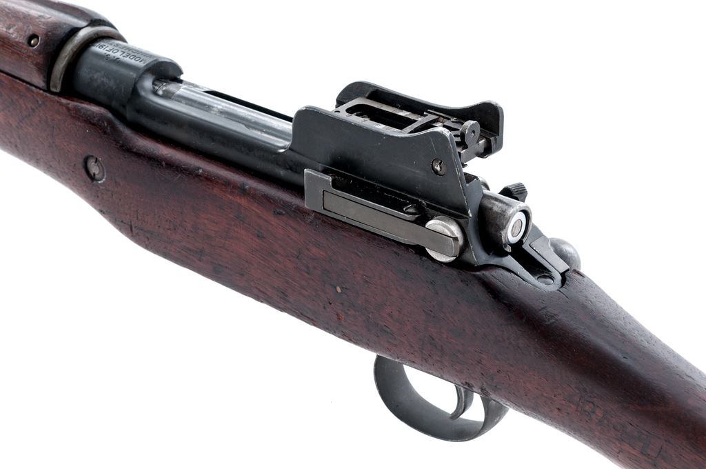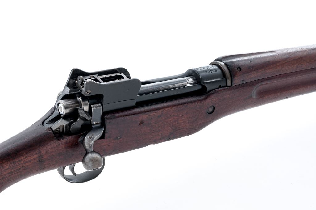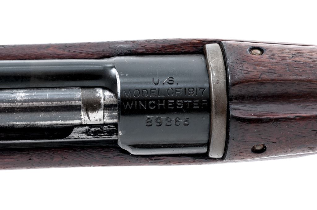 U.S. M1917 Enfield Bolt Action Rifle, #89365, .30-06 cal., 26'' barrel, blackened/phosphate finish, walnut stock, blade front sight with protecting ears and folding leaf rear sight with aperture. Marked on receiver ring ''U.S. MODEL OF 1917 WINCHESTER'', and on barrel behind front sight ''W/(flaming bomb)/12-17''. There is a circled five-pointed star on left side of receiver, and a ''W'' stamp on underside of bolt handle. Stock has a ''W'' stamp at tip of forend and a ''BA-WL'' cartouche on left side of wrist with a partial ''circle P'' firing proof on the underside of the wrist. Condition overall is very good with over 85% finish remaining on the metal, with thinning on the bolt and patina on the buttplate. Stock is very good with a few gouges and scratches and overall handling marks. Action is smooth, bright bore is excellent. No visible import stamps. Est.: $500-$750. (C&R)