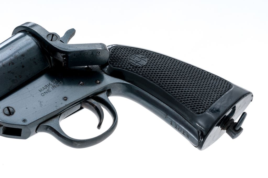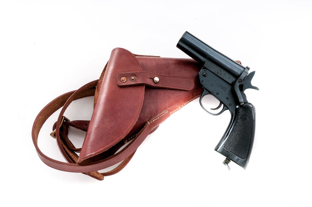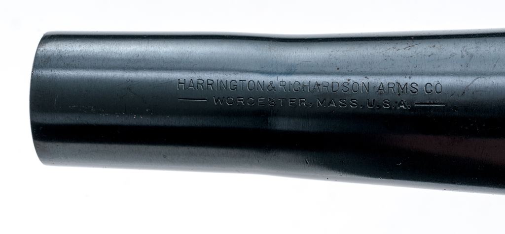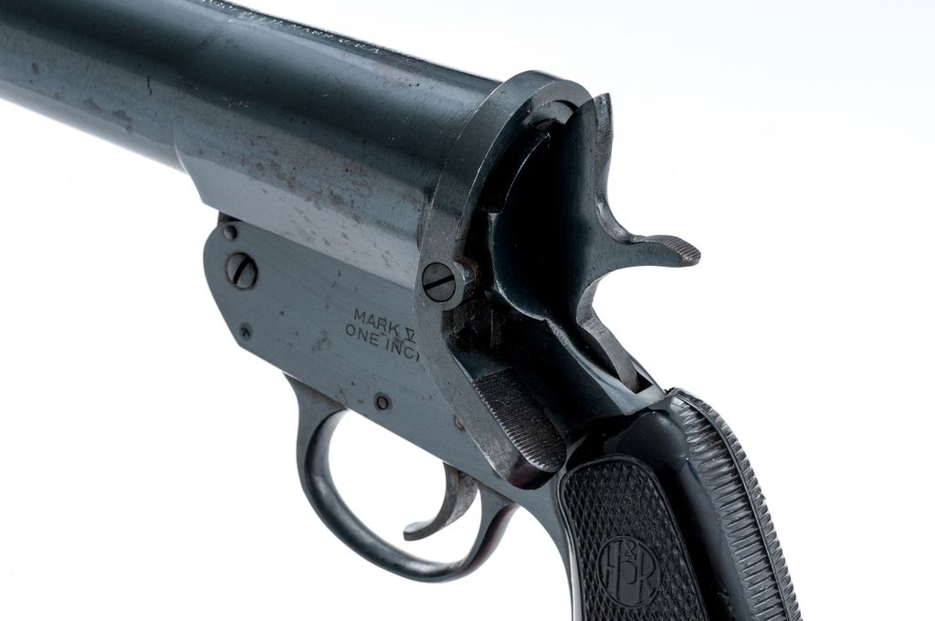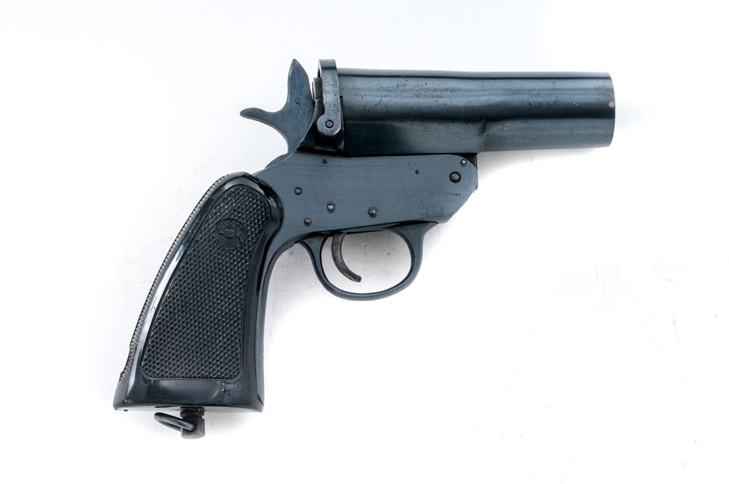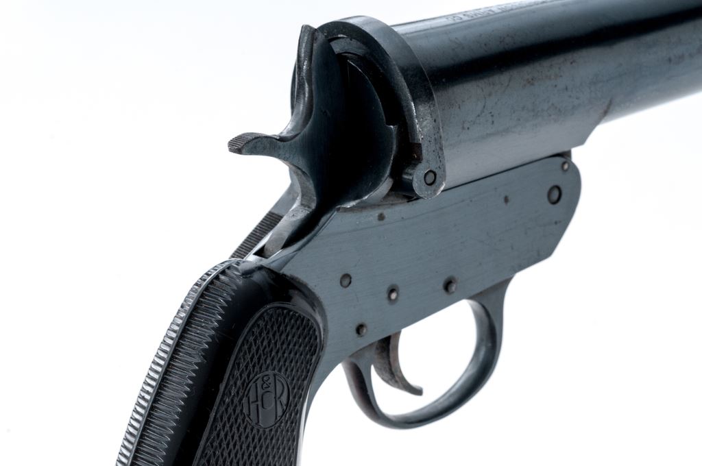 Harrington & Richardson Mark VI Flare Pistol, with holster, #11013, 4.5'' barrel, 1'' bore, dark blue finish, checkered black plastic H&R grips, lanyard ring, with side-latch. In an unmarked brown leather post-war holster with brass hardware. Condition is very good+ retaining approx. 97% blue finish. Metal with intermittent tiny specks of surface rust and a few spots of very fine corrosion. Maker's marks, etc. are clear and defined. Grips with normal handling marks to the smooth borders, checks are excellent, both grips are free of any chips or cracks. Good action and bore. Holster is near excellent with a small amount of light scuffs to the exterior, leather is pliable. Est.: $100-$200.