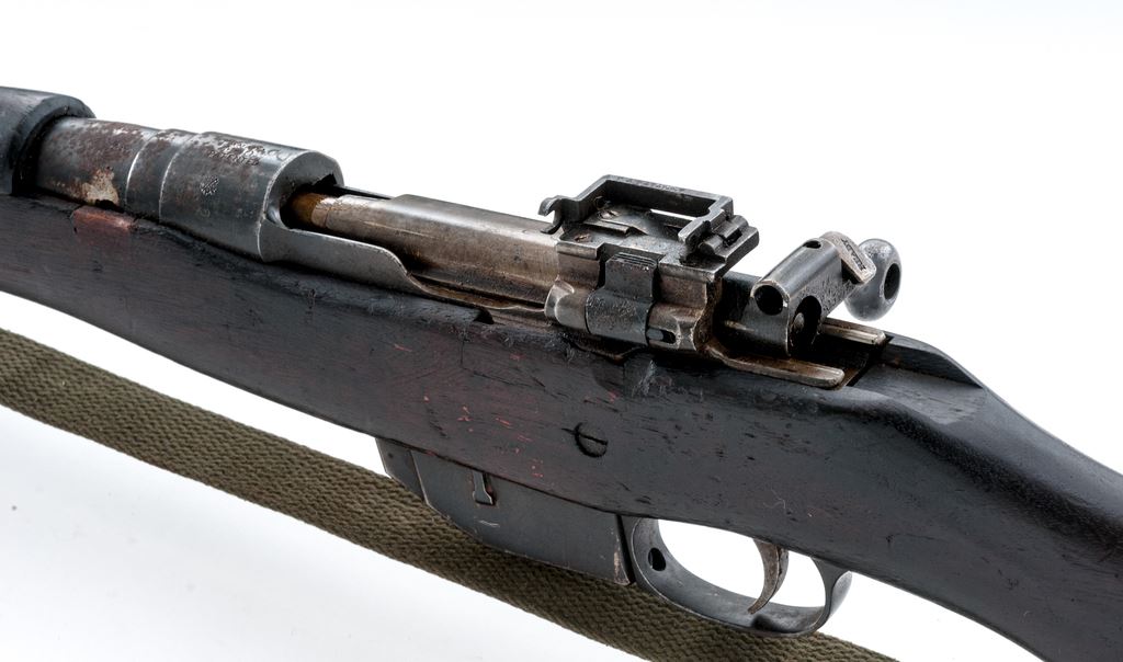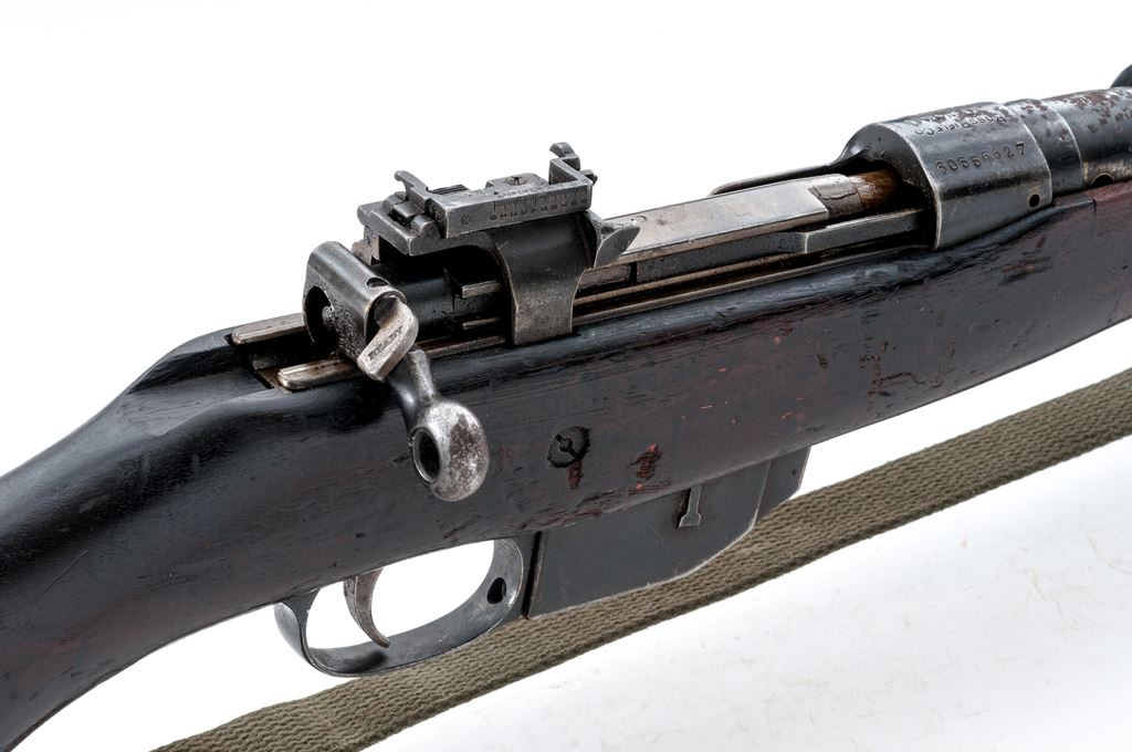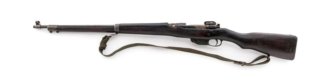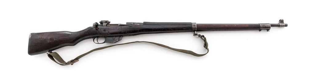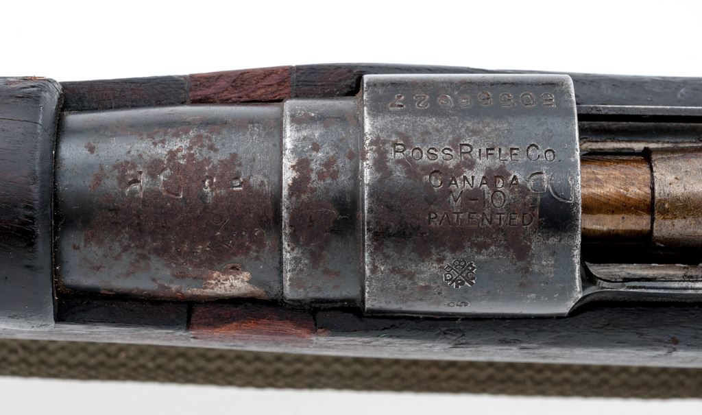 Canadian M-10 Ross Drill Purpose Straight-Pull Rifle, #50556627, .303 Brit. cal., 30.5'' barrel, blued finish, walnut stock, blade front sight with hood and folding rear sight frame missing slide. Marked on receiver ring ''ROSS RIFLE Co. CANADA M-10 PATENTED''. Right side buttstock stamps include ''2-8/1917'' and ''CLH 45''. Rifle has been converted into a Drill Purpose training model by drilling a large hole transversely through the barrel. There are remnants of red paint below the action indicating that it cannot be fired. Most major parts are stamped ''DP''. Condition overall is fair, with areas of rust and patina across the metal parts. Wood is fair with overall darkening, repaired areas, and many old and new gouges and scratches. Action operates smoothly, bore is unusable. Import stamped on right side of barrel. Includes a fair condition U.S. military green cotton sling. Est.: $300-$400. (C&R)