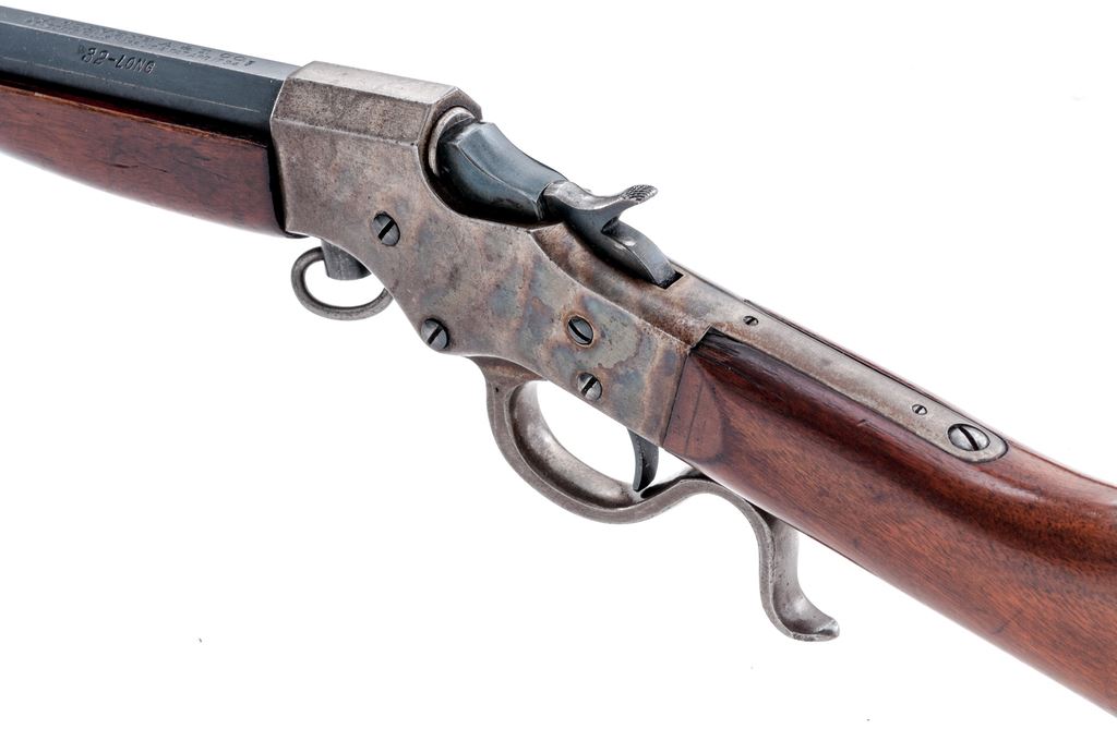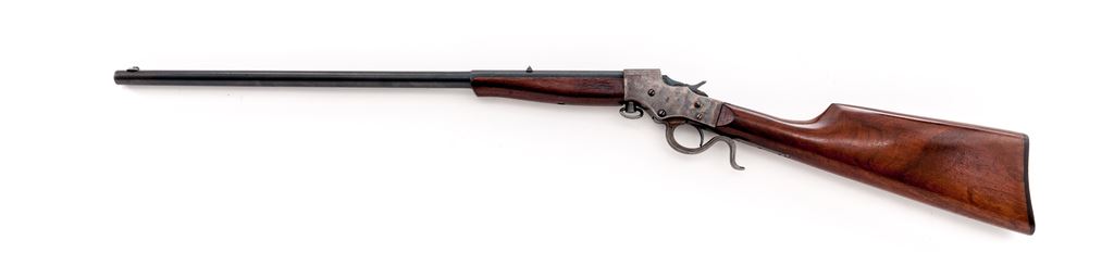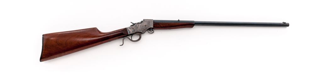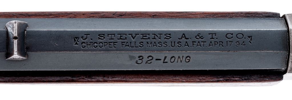 Stevens Favorite No. 17 Single Shot Takedown Boy's Rifle, #452, .32 Long RF cal., blued 22'' part-round part-octagonal barrel, with dovetailed low-blade front and notched rear sights, marked with maker's name, address and 1894 patent date on top flat, and ''32-Long'' at left breech; case hardened receiver has a large takedown thumbscrew underneath, and a serpentine operating lever that opens the dropping-block action with automatic extraction; varnished walnut forestock with semi-Schnabel nose, and matching buttstock having a checkered hard rubber buttplate with ''Stevens Favorite'' in a central ribbon. Mfg'd ca. 1893-1939. Condition is excellent. Barrel retains approx. 98% original blue, receiver with brilliant case colors. Stocks are sound and smooth, with minor handling marks and lovely grain and color; fancy buttplate with crisp checkering and lettering. Blued screw heads are unmarred; action is smooth and sure; bore is bright with sharp rifling. The Favorite offered the convenience of takedown and easily-changed calibers by substituting a different barrel and breechblock. Est.: $300-$500. (C&R)
