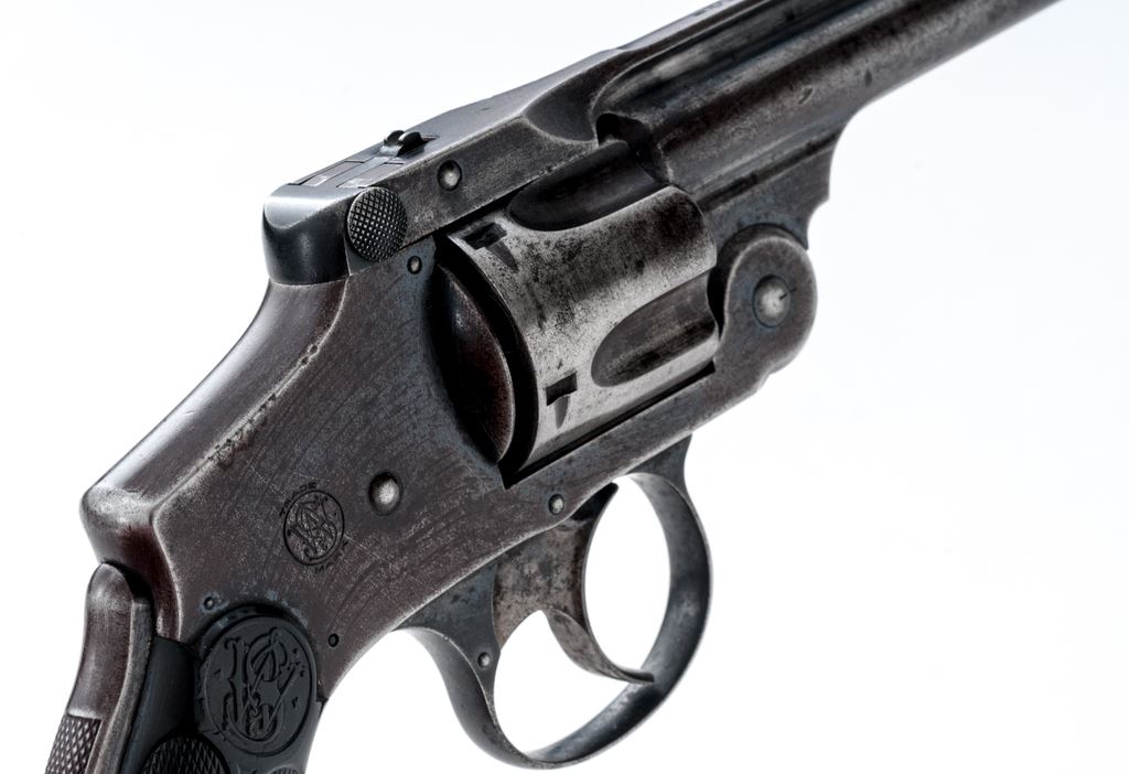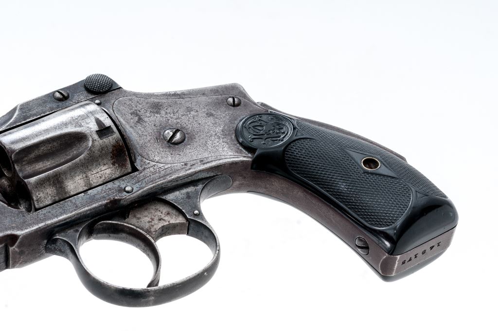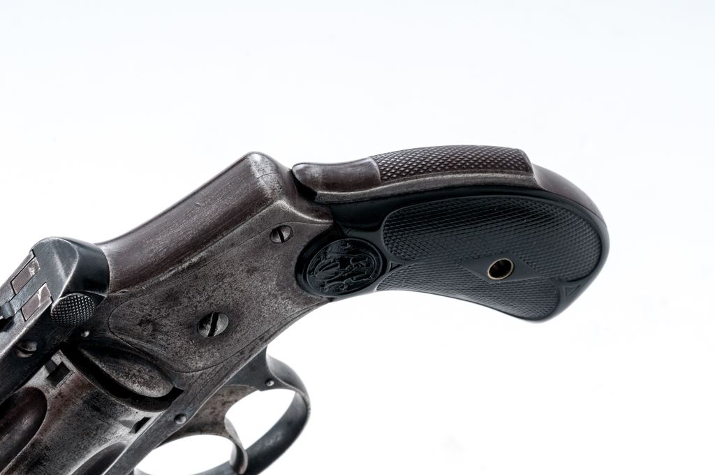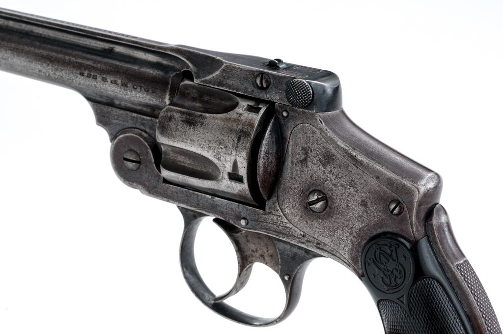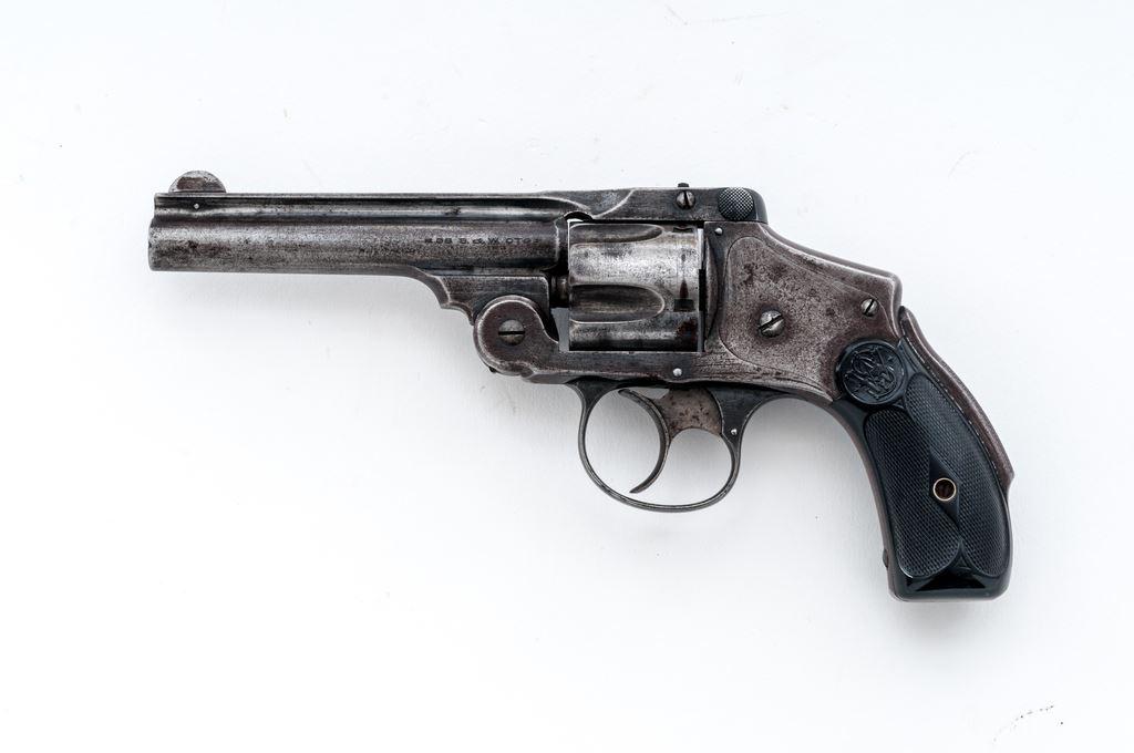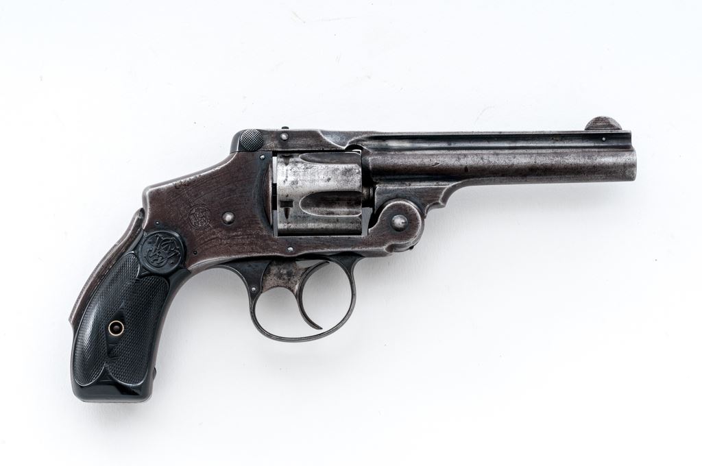 Smith & Wesson .38 Safety 4th Model Double Action Revolver, #149173, .38 S&W CF cal., 4'' round barrel, with pinned blade front and small grooved rear sights; marked with maker's name, address and 1883-85-89 patent dates on top rib; fluted 5-shot round cylinder; frame with circular S&W logo on right side, signature large front hinge, integral gripstraps and ''lemon squeezer'' safety bar in backstrap; finely-checkered two-piece black hard rubber grips with the entwined ''S&W'' logo in a raised panel at top. Mfg'd ca. 1898-1907. Condition is very good. Steel surfaces show an overall smooth gunmetal gray with good traces of original blue in protected areas and 80% blue on triggerguard. Grips are unchipped and have sharp checkering and detail. Barrel hinge and latch are sound; action is crisp; bore is clean with sharp rifling. Est.: $200-$300. (C&R/PPT)