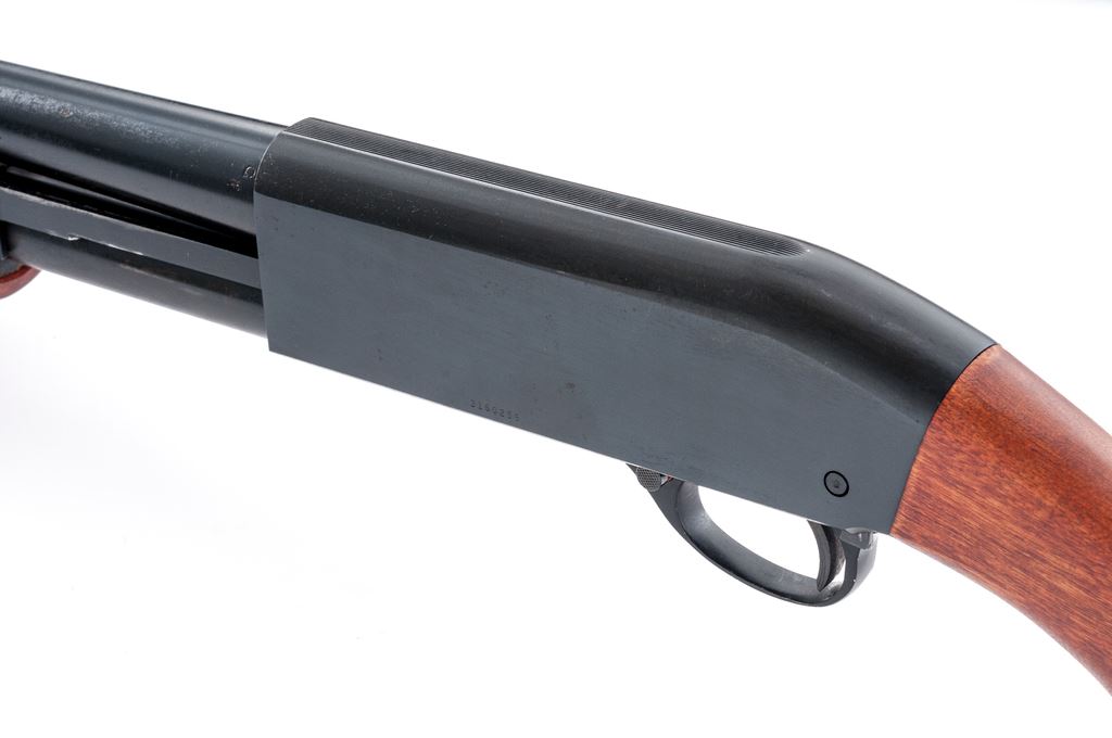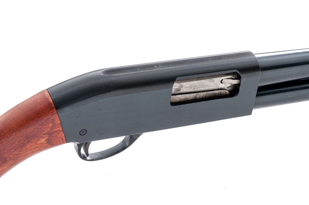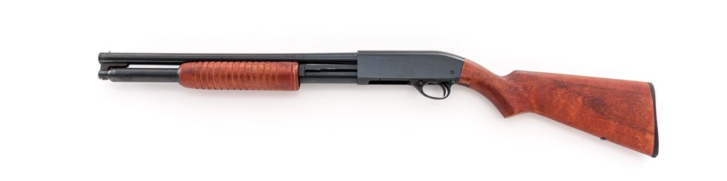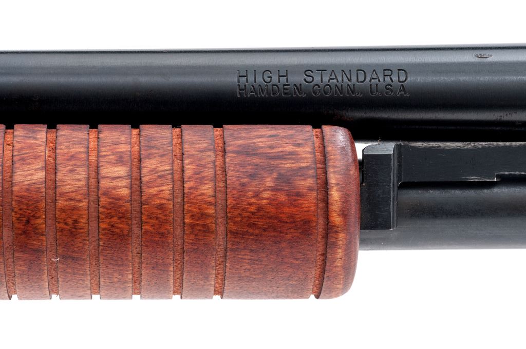 High Standard Flight King Riot-Length Slide-Action Shotgun, #3160255, 12 ga., 18'' barrel, 2-3/4'' chamber, Cyl bore, blue finish, smooth pistol-grip hardwood stock and grooved forend, black plastic buttplate, and silver bead front sight. Condition is very good retaining approx. 97% original blue finish. Metal with scattered frosted spots and specks of mild surface rust that should clean. Wood shows very little handling wear. Excellent crisp action, bore is bright with a few spots of fouling. Est.: $150-$250. (Modern)