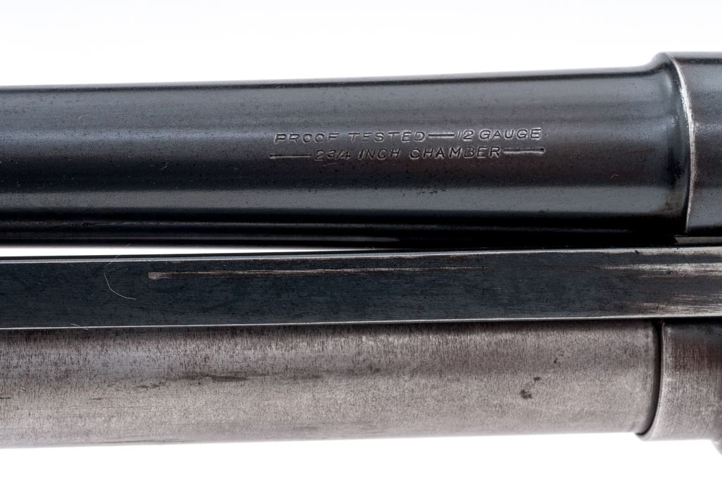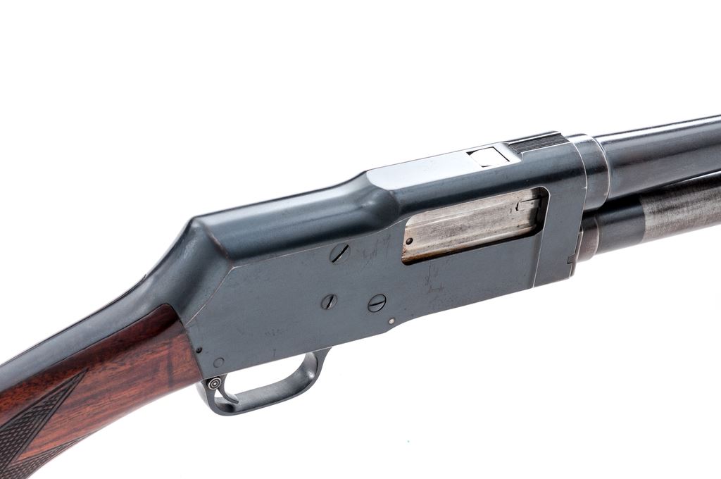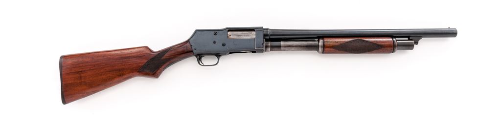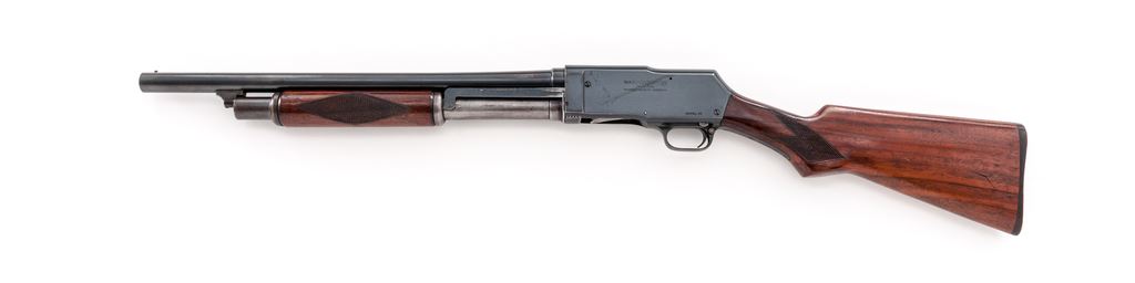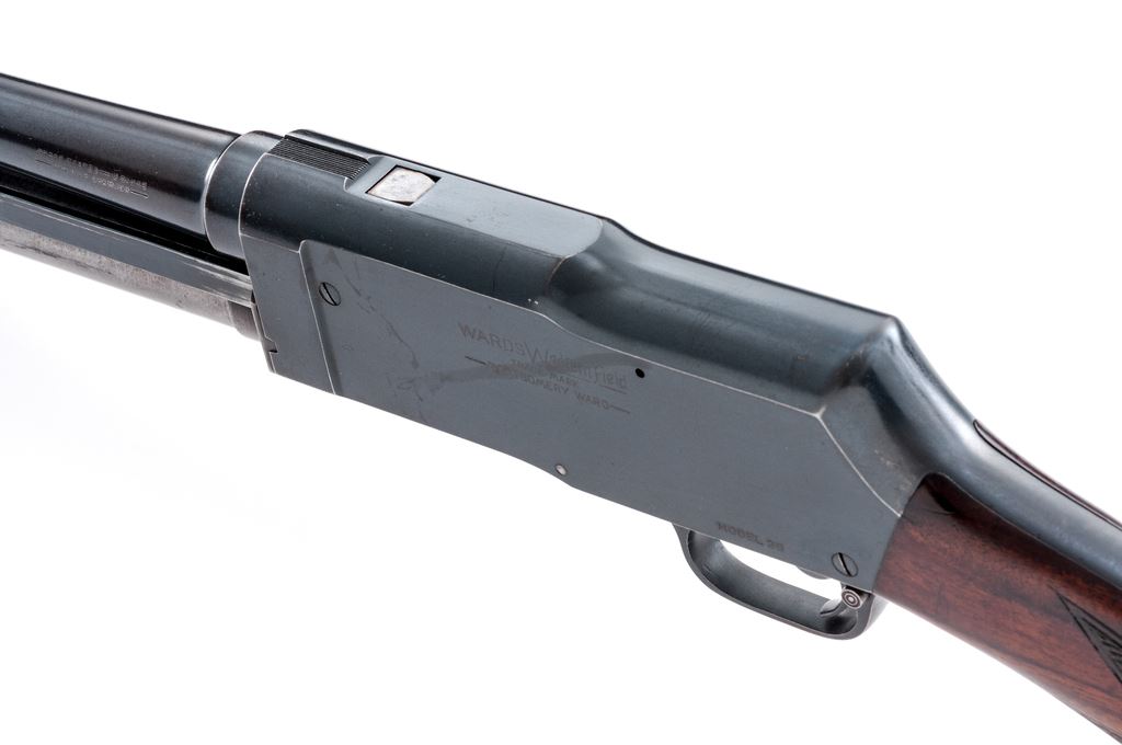 Wards Western Field Model 35 Pump Action Shotgun, #U123583, 12 ga., 18.5'' barrel choked Cyl., 2-3/4'' chamber, blue finish, checkered walnut stock, with bright bead front sight. Originally made for Wards by Stevens and called a Model 520. Condition is fine retaining approx. 94% blue to barrel and frame; 75% blue to mag tube, with losses in operating areas. Stocks are excellent with just light impressions. Action is crisp, bore is bright. Est.: $200-$300. (C&R)
