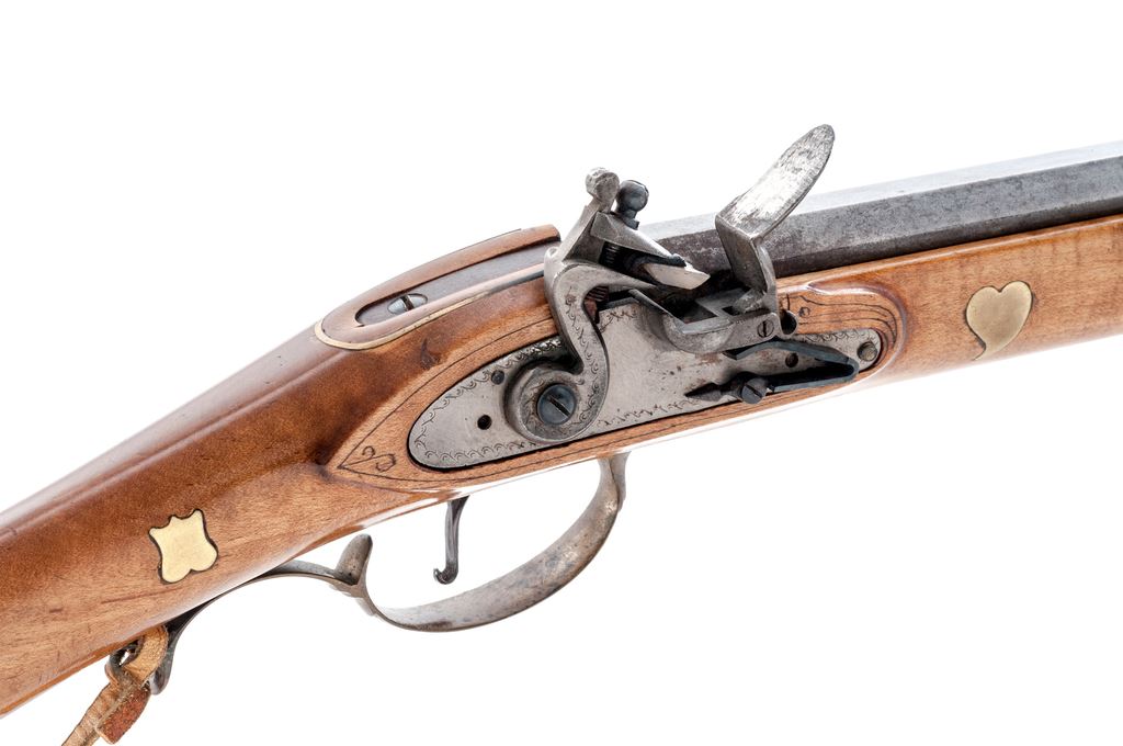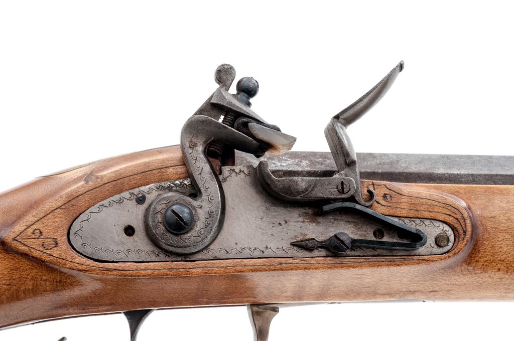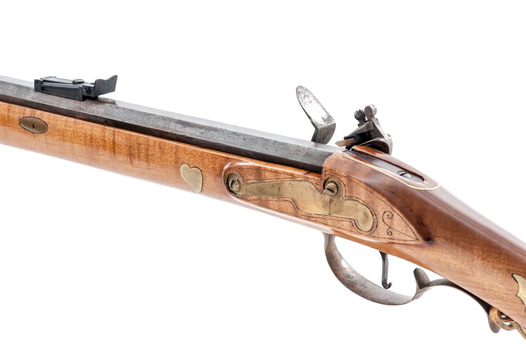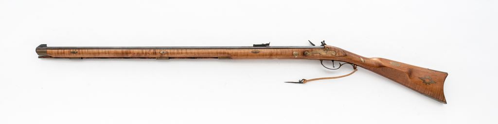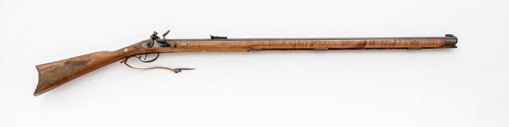 Reproduction Fullstock Kentucky Flintlock Rifle, NVSN, .36 cal., ''bright'' 39-1/4'' octagonal barrel, with large bead-blade front and adjustable open rear sights unmarked as to maker; ''bright'' border engraved flat lockplate is likewise unmarked; trigger having early-style curled tail; brass furniture includes serpentine sideplate, triggerguard with finger-rest, patchbox with hinged door opening to butt trap, crescent buttplate, nosecap, and three ferrules holding the brass-tipped hickory ramrod; varnished maple stock with 12 brass inlays, brass barrel tang surround, and light line carving on both sides of lock. Finishing suggests hobbyist workmanship. Condition is very good, the ''bright'' steel surfaces showing patina and very light rust, the brass with patina (solder repair at juncture of buttplate/lower tang, filler at inletted top tang area), the fullstock with all varnish finish. Includes a handmade wrought-iron nipple pick. Action is smooth; bore is brilliant with defined rifling. Est.: $200-$400. (No FFL Required)