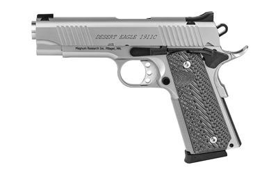 All Desert Eagle 1911 series 70 slide and frame rails are machined to aerospace tolerances, delivering accuracy that will match any custom gun. Offered in both Chrome Moly and Stainless and feature stainless match barrels, G-10 grips, light triggers with zero creep, and a stainless beavertail grip safety. The G (5" barrel) and C (4.33" barrel) models are equipped with fixed combat sights and the Undercover "U" (3" barrel) models come with an adjustable rear sight. Desert Eagle 1911s chambered in 45 ACP all have a traditional feed ramp machined into the frame, while all 9mm pistols have a ramped barrel with fully supported chamber. Only the 1911G models have a traditional barrel bushing in the slide. The 1911C and U models feature a bushingless slide and bull barrel. With the shorter slides of the C and U models, the bushingless slide allows for a longer recoil spring and ensures reliable function. Includes two 8-round magazines.