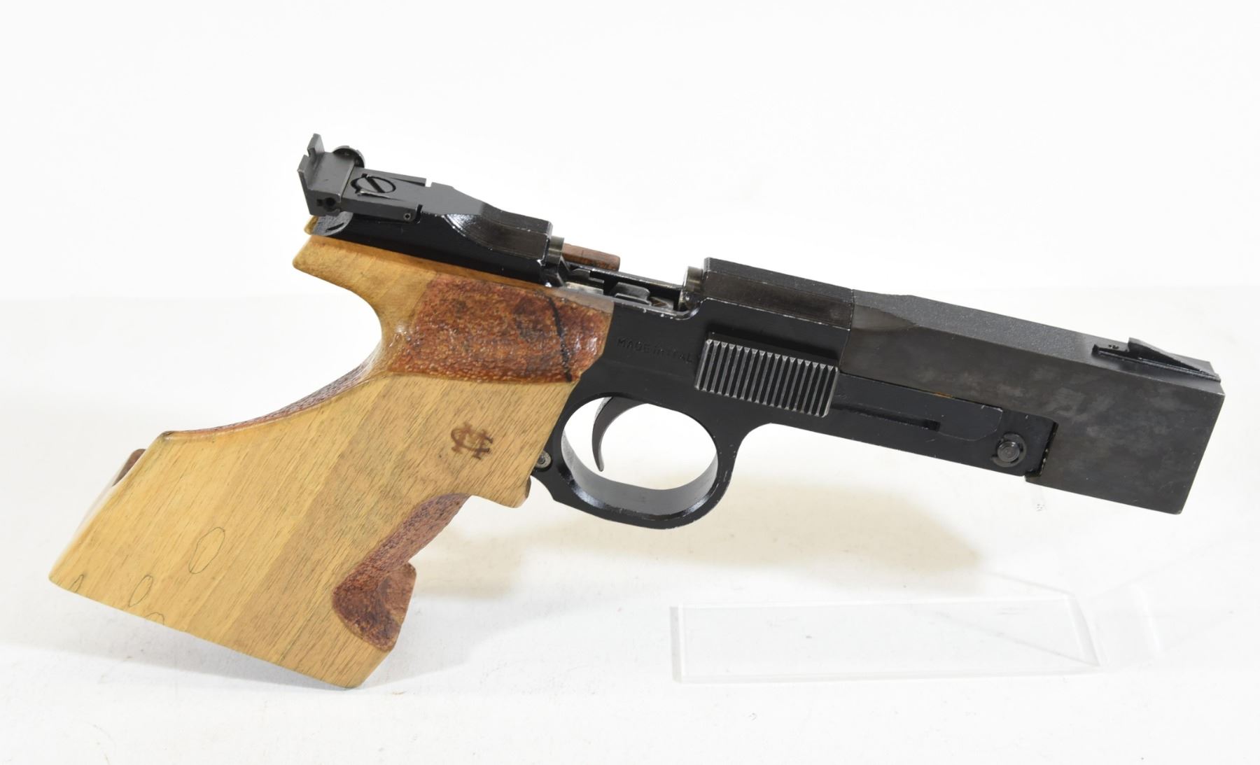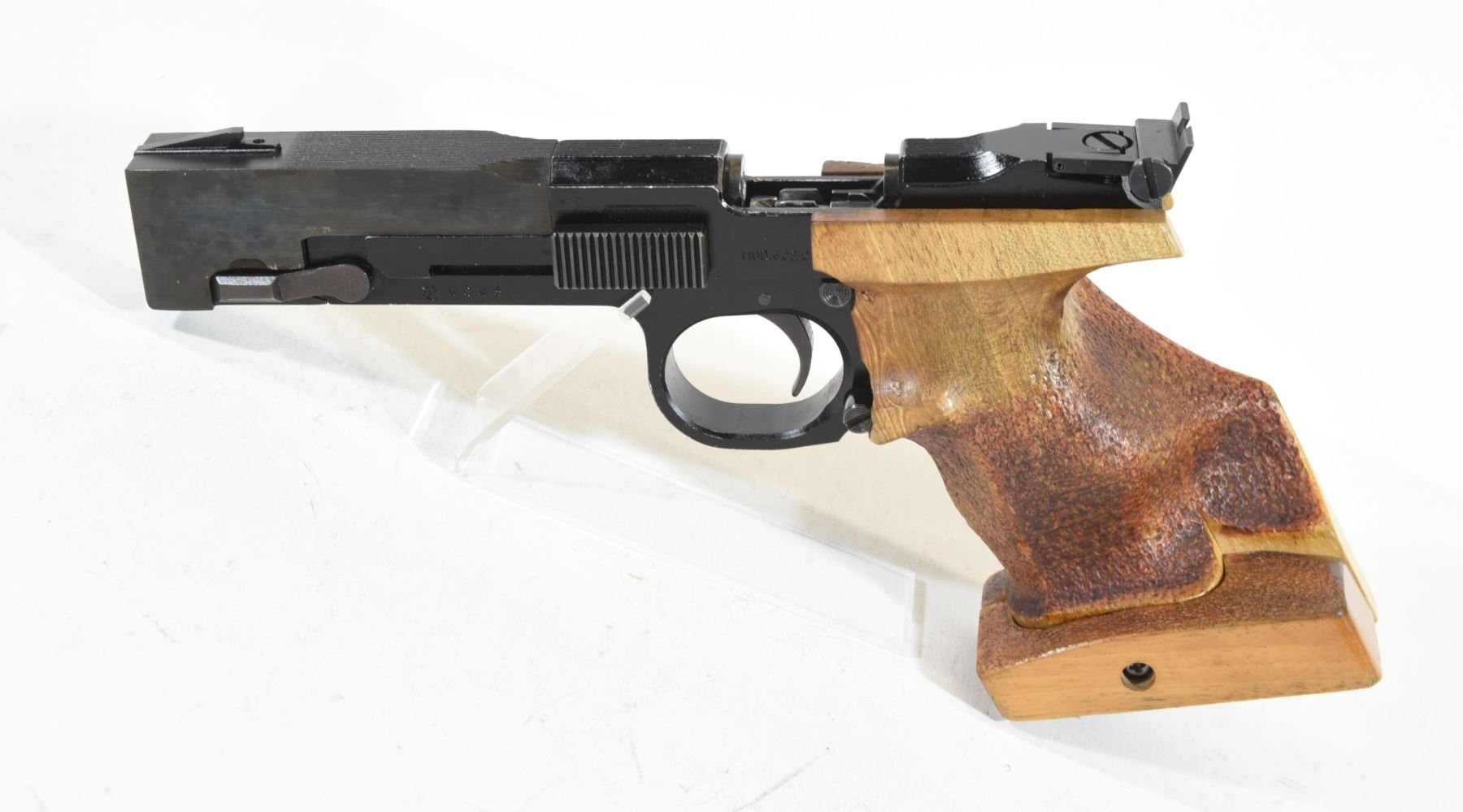Restricted, semi auto, 22 LR, 140mm barrel, SN 0645. Left handed wood pistol has some scratches, bluing has some marks, bore excellent.
