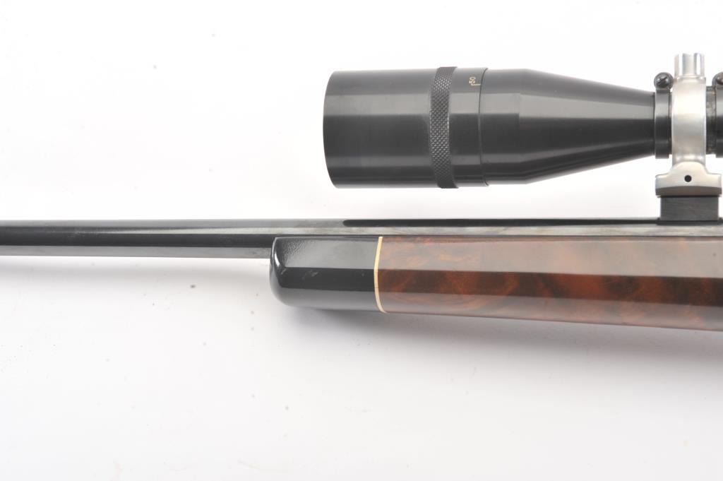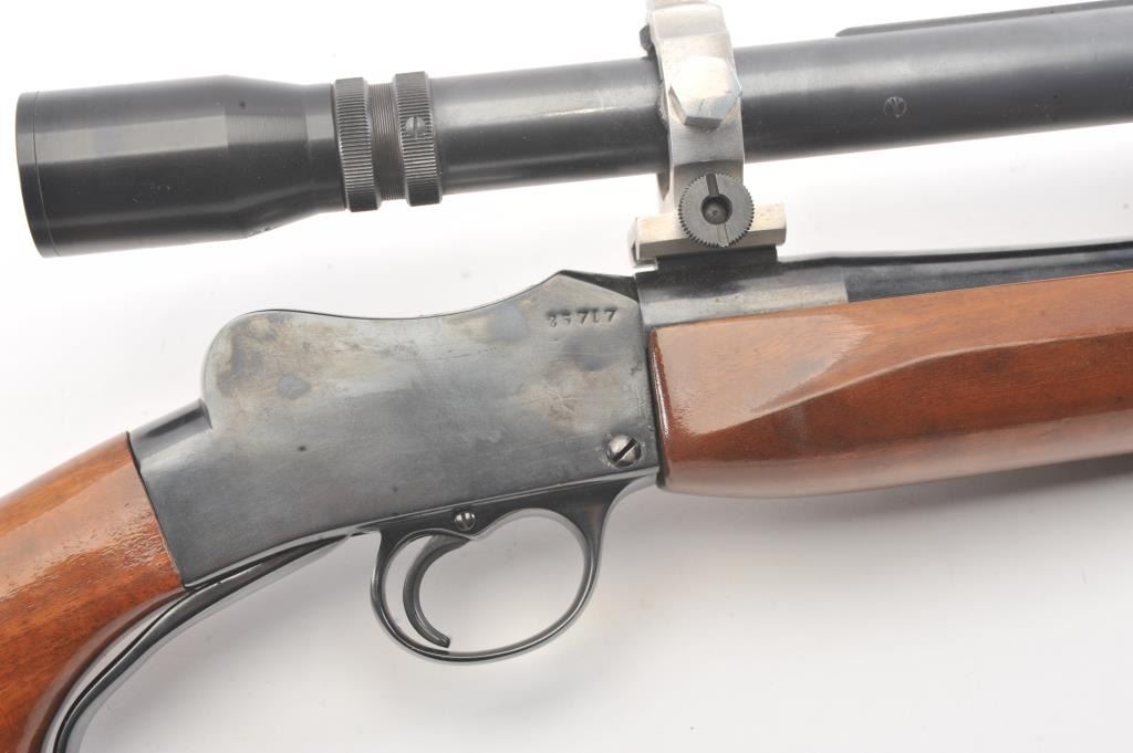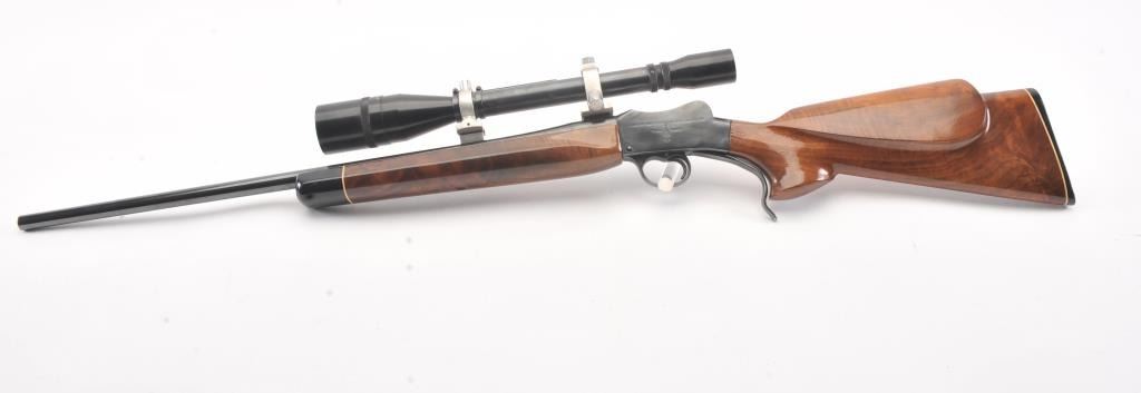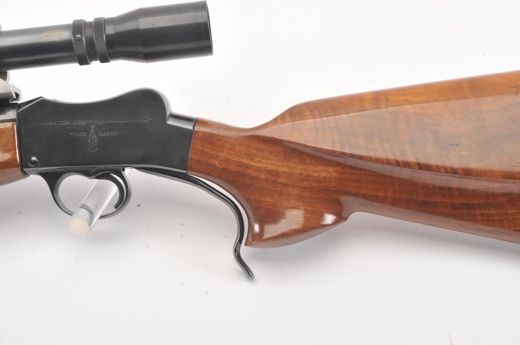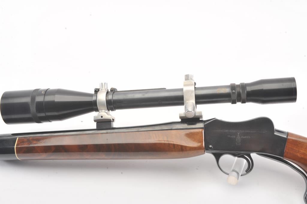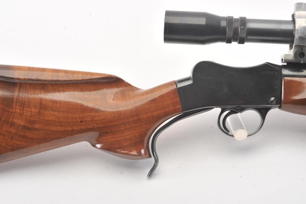 BSA single shot rifle, 219 Zipper Imp caliber, 24” barrel, blued finish, custom wood stocks, S/N 25717, mounted with a Unertl scope displaying sharp optics; overall very good condition with a very good bore, crispaction, good markings and very good wood showing fine graining to butt stock. (C&R). Est.: $300-$600.
