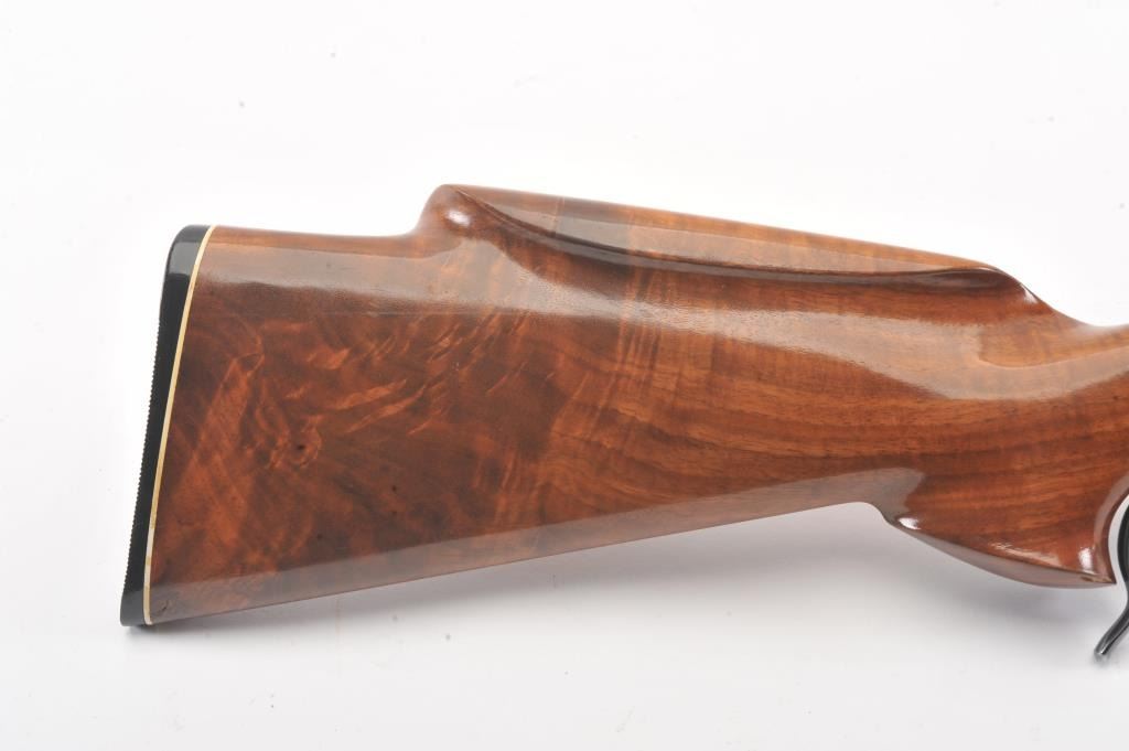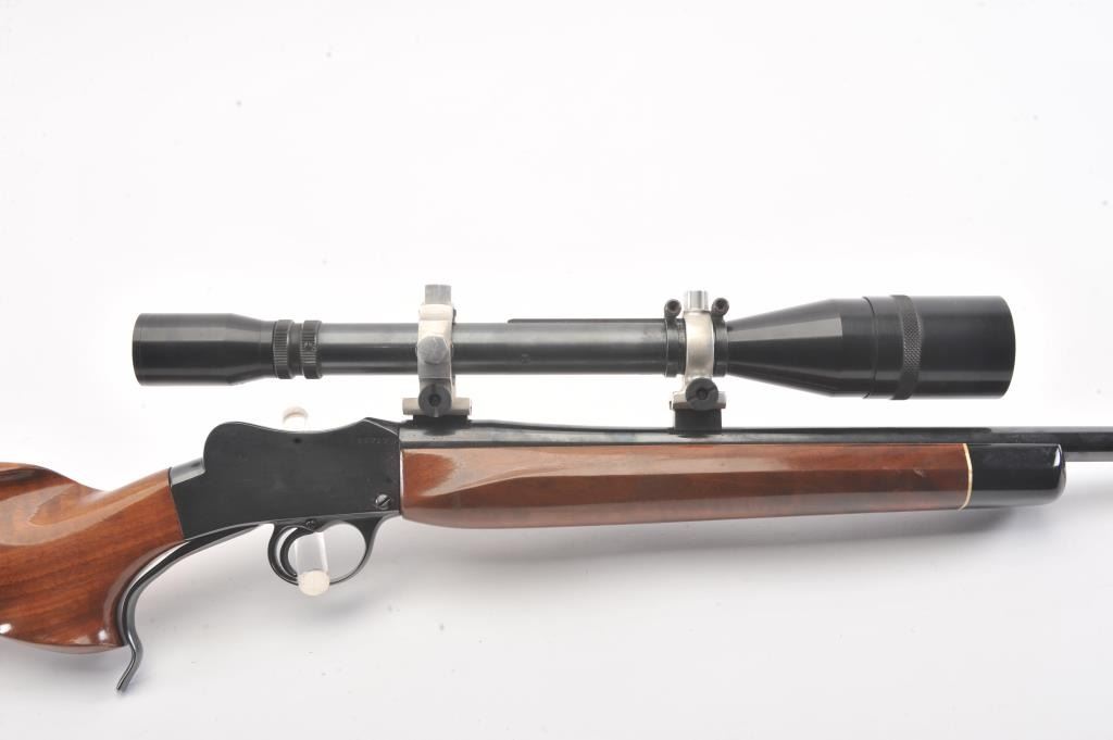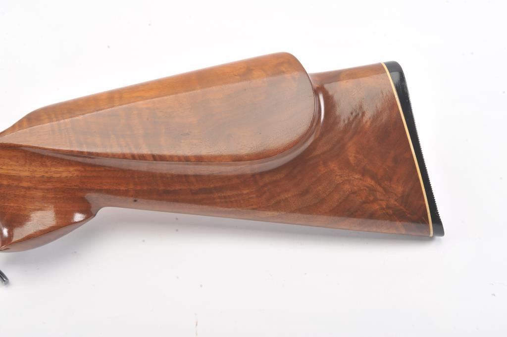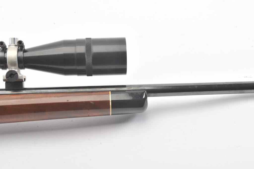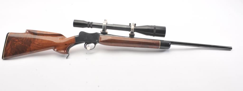 BSA single shot rifle, 219 Zipper Imp caliber, 24” barrel, blued finish, custom wood stocks, S/N 25717, mounted with a Unertl scope displaying sharp optics; overall very good condition with a very good bore, crispaction, good markings and very good wood showing fine graining to butt stock. (C&R). Est.: $300-$600.