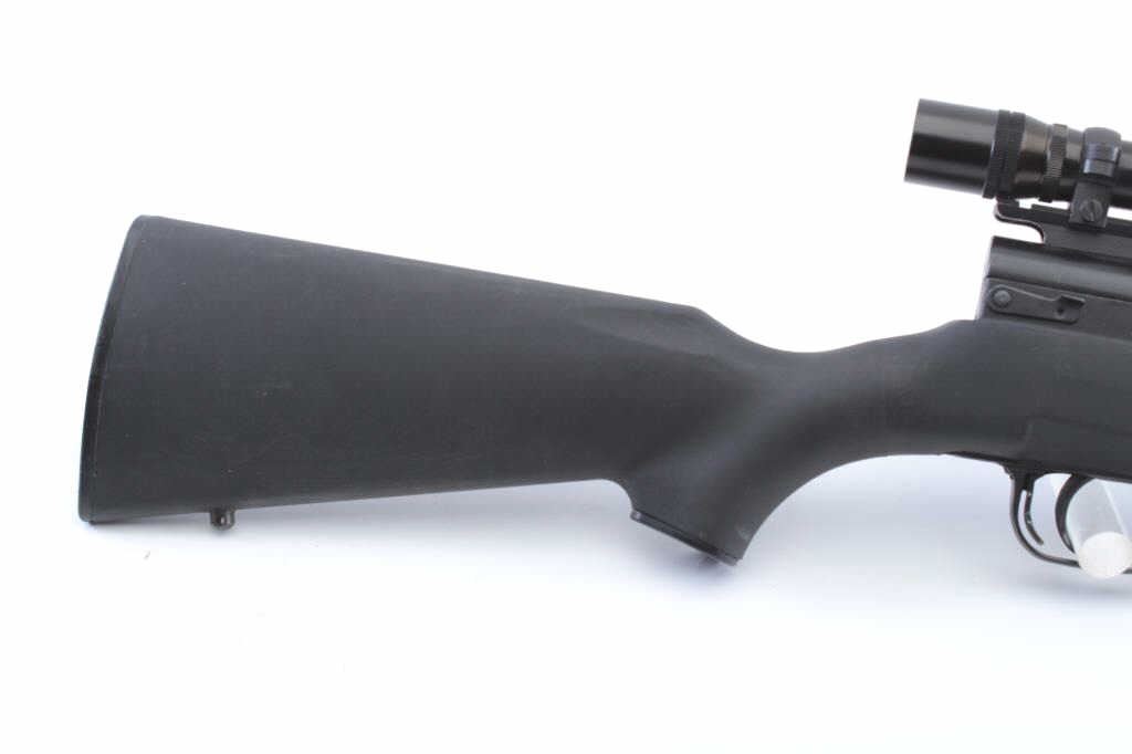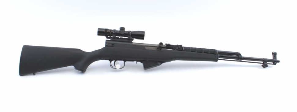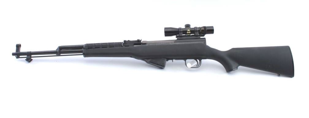 Chinese SKS semi-automatic rifle, 7.62 x 39mm caliber, 20” barrel, blued finish, neoprene stock, S/N 101678; mounted with a 4 X 28 scope displaying good optics; overall very good to fine condition with a very good +bore, crisp action, sharp markings and fine stock. (Modern). Est.: $200-$400.