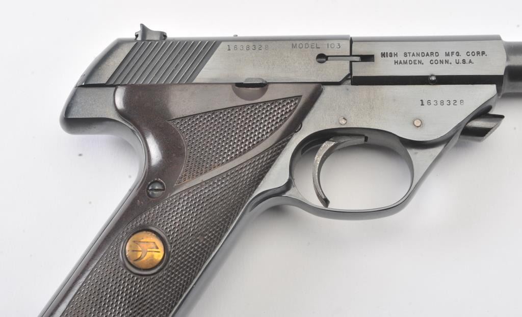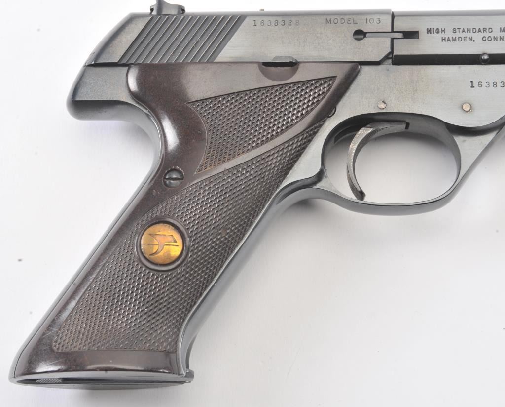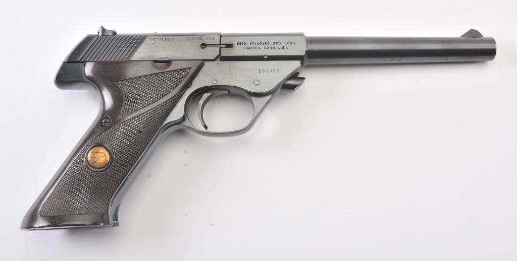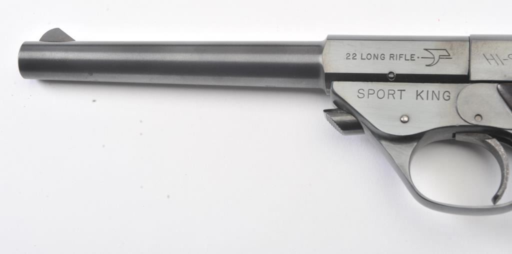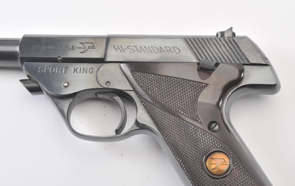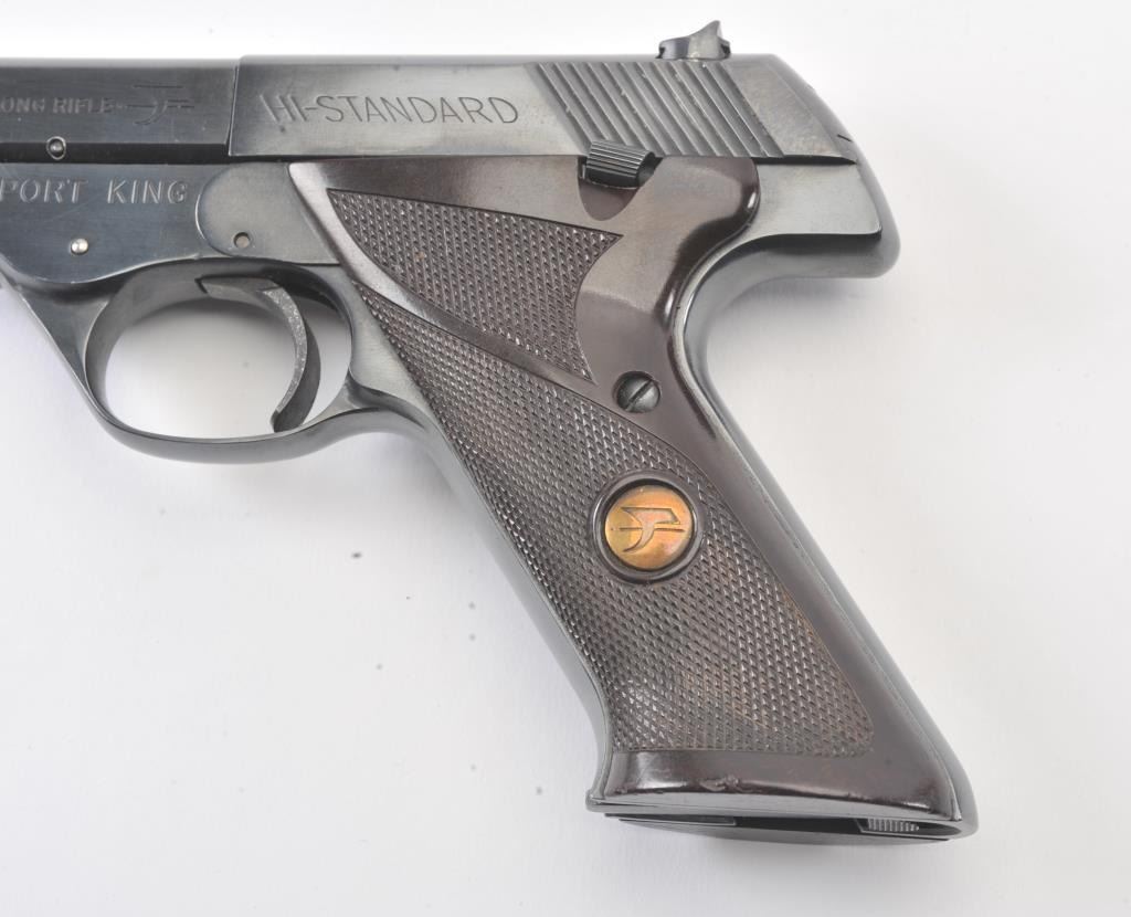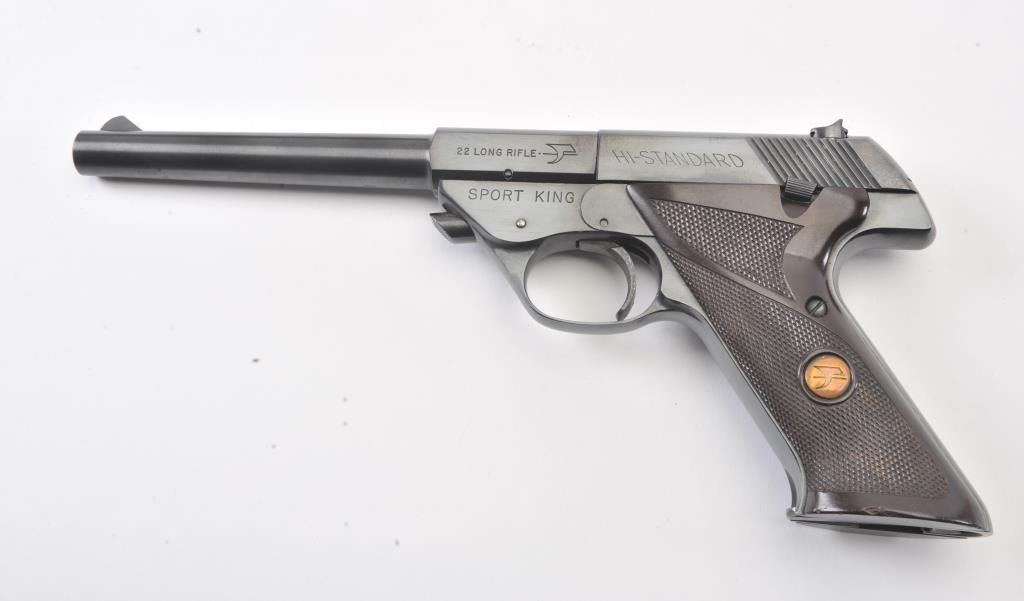 Hi-Standard Sport King Model semi-automatic pistol, .22LR caliber, 6.75” barrel, blued finish, checkered maroon plastic medallion grips, S/N 1638328; overall fine condition showing majority of blued finish remaining,fine bore, crisp action, sharp markings and fine grips. (Modern/PPT). Est.: $200-$400.