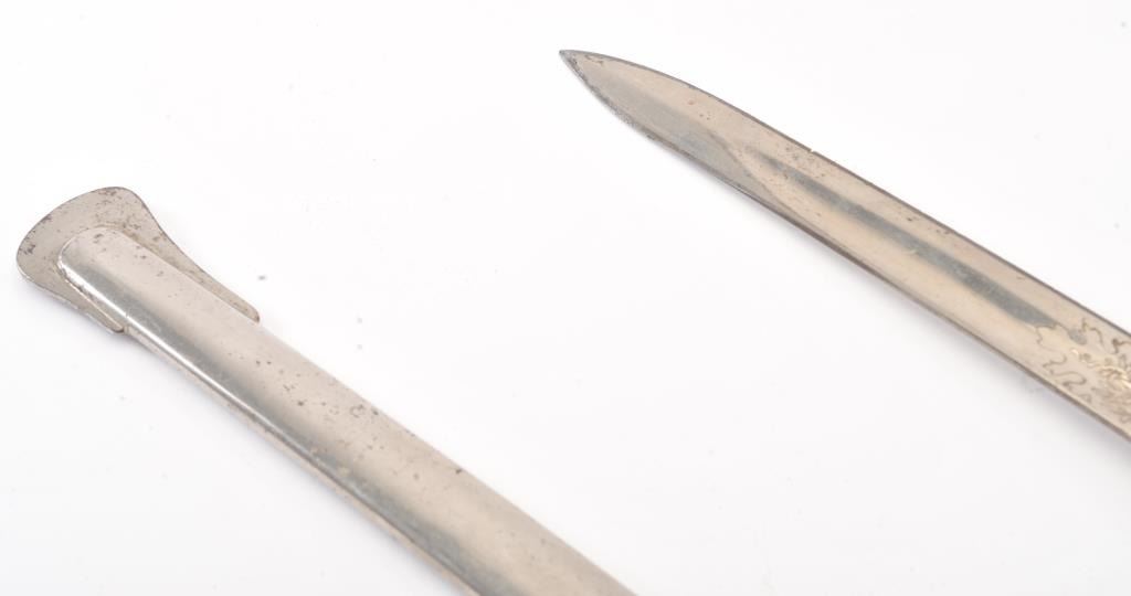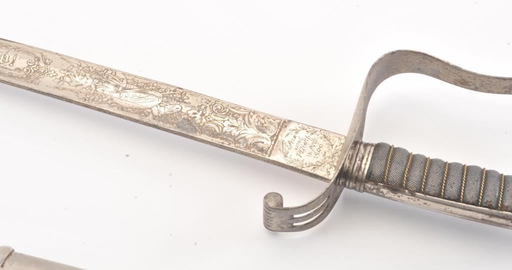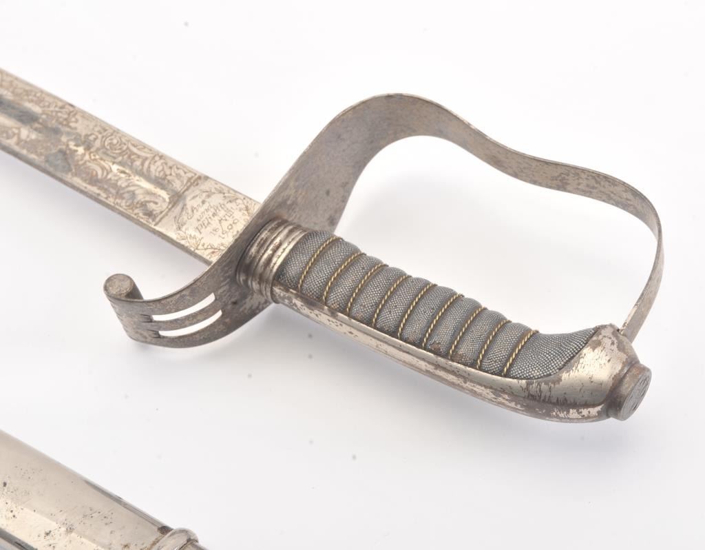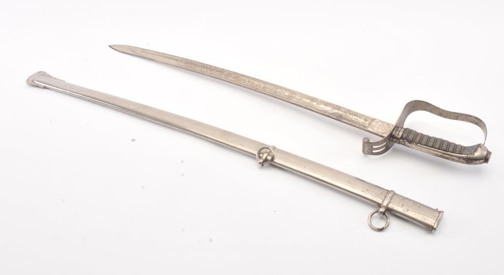 Austrian inf. Officer Saber of model 1850 or 1861. Semi-straight nickeled blade has been shortened to 25”, but is nicely triple etched. On obverse is “Treu bis in den Tod!” [Loyal unto Death!], with panoply of armsand is stamped “Ehre und Pflicht//18/VIII//1906 [Honor and Obligation, August 18, 1906] on the ricasso. On the reverse is the royal cipher of Franz Joseph with panoply of arms motif, and stamped “EDJUNG//WEIN” on the ricasso. Blade shows some pitting and tarnishing, as does the B-guard. The sharkskin grip is slightly worn and has a single twisted wire. The tang button has an undecipherable stamp. Steel nickeledscabbard has two suspension rings. Overall 37-1/4”L. Est.: $175-$350
