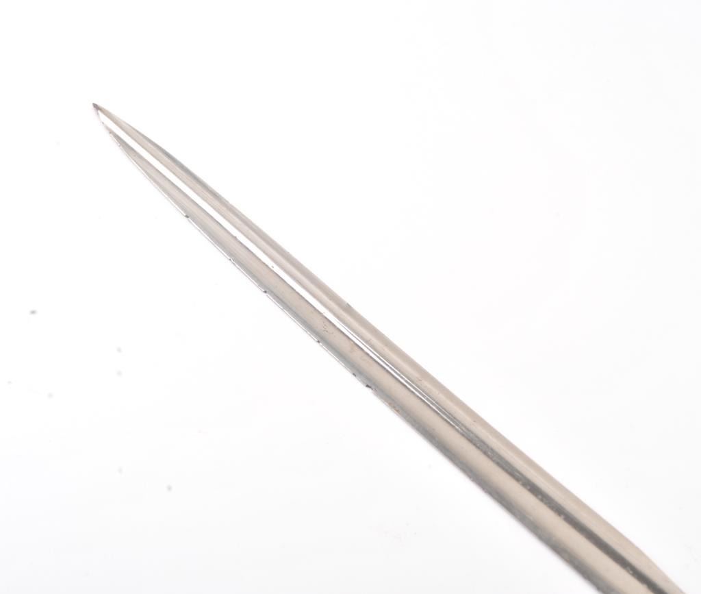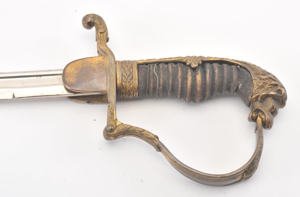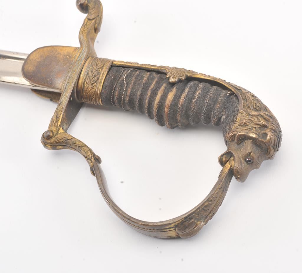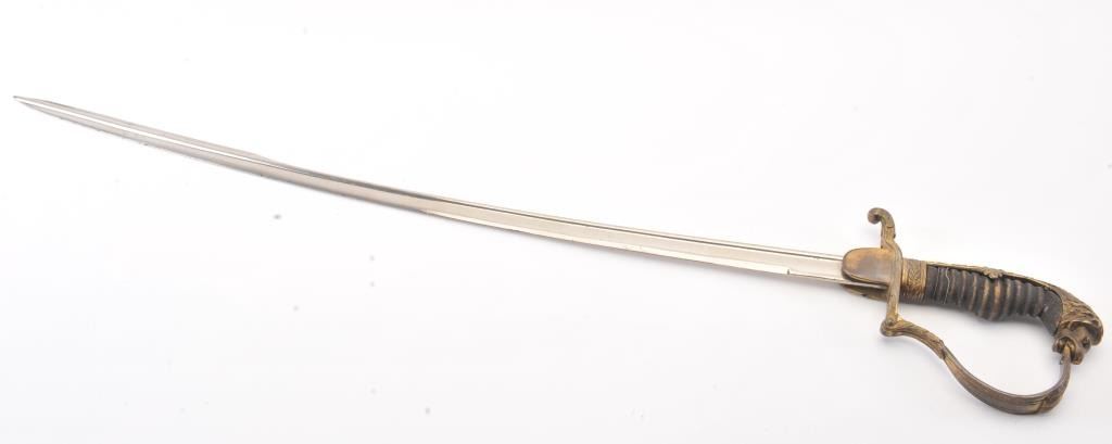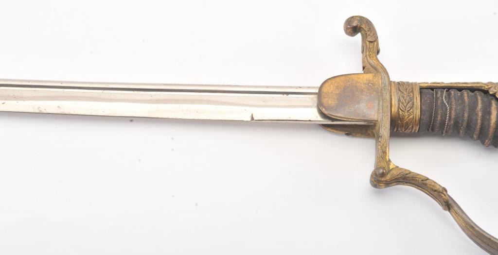 Imperial German Artillery Sword Circa 1890-1911, Eichorn Chrome blade with Quill-back (pipe-back), and Kilij style false cutback, extending 1/3 of upper side of the 33-1/8” blade. Blade is etched “Eisenhauer”. Spine of blade is etched “M. Neumann, Berlin//Hoflieferant” (supplier). Gilt bronze hilt with full lion head set with red stone eyes. P-Shaped knuckle bow with stylized leaf design. Back of Grip isscrolled leaf and floral motif. Sharkskin covered wood grip is missing the twisted wire wrap. Gilt brass ferrule has a laurel leaf pattern. Languet with crossed cannon. Scrolled leaf quillon has been re-bent and is partially cracked. No scabbard. Overall 38½”L and 7/8” at ricasso. Est.: $200-$400