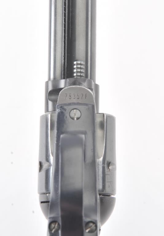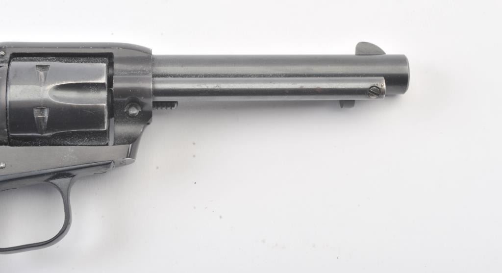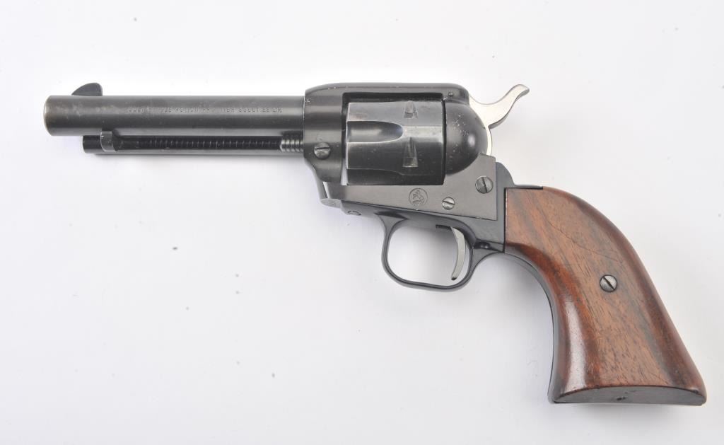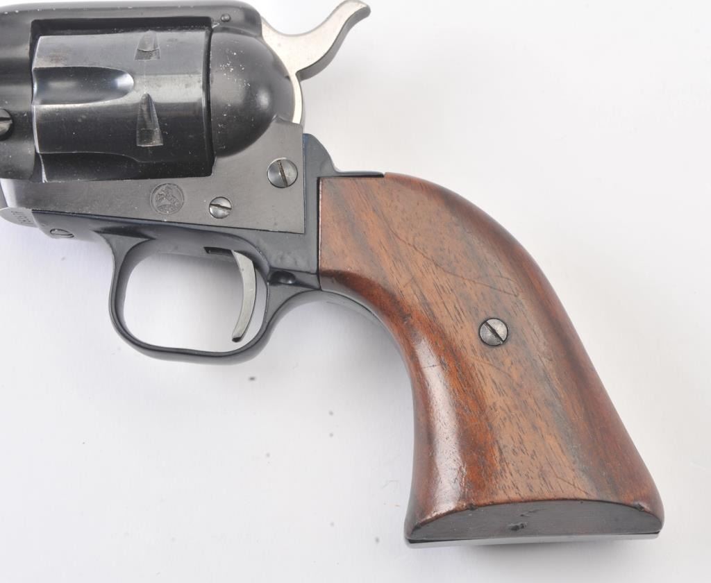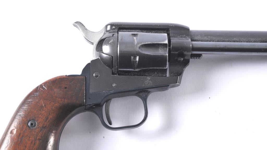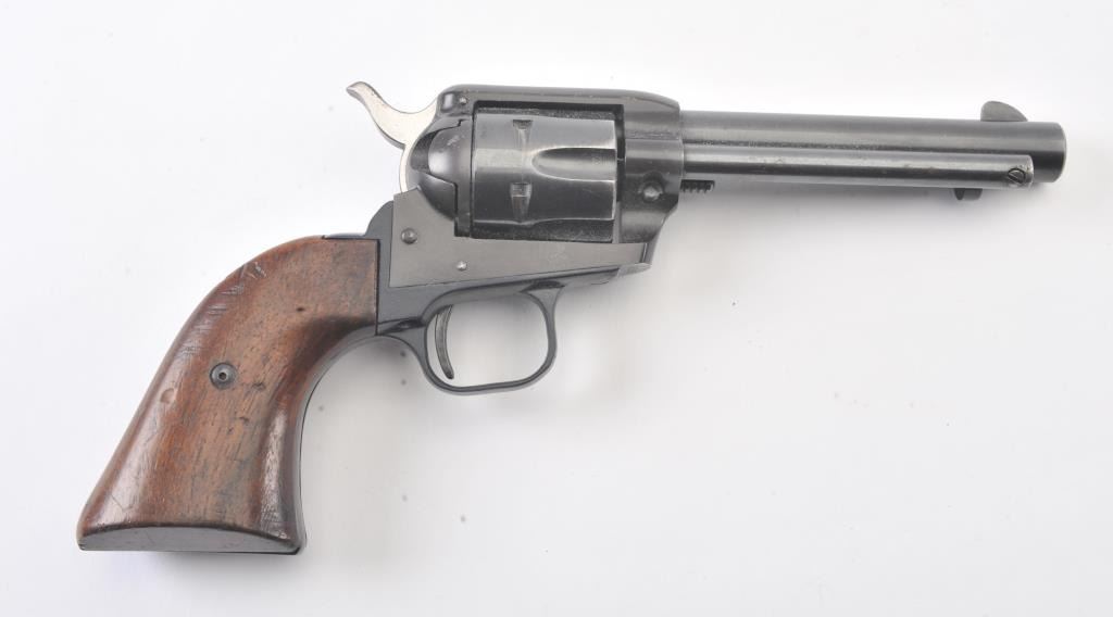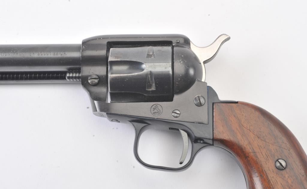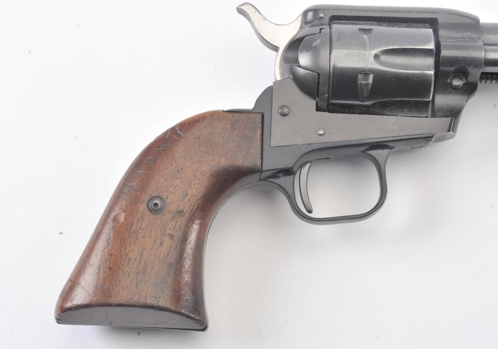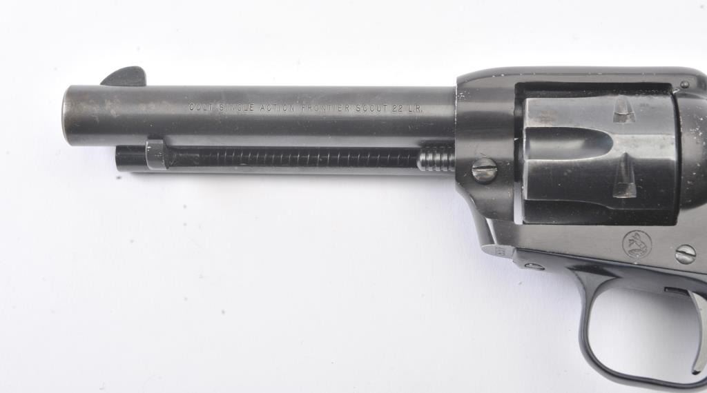 Early Colt Frontier Scout single-action revolver, .22 Long Rifle caliber, Serial #75357F. The pistol is in very good to nearly fine overall condition with a 4 5/8” barrel. The pistol retains 85%-90% of itsblue finish with light scratches and holster wear at the muzzle. The smooth wood grips are in good condition with mars and compressions consistent with carry and use. The bore is good, the action is crisp and the markings are sharp. This pistol was manufactured in 1959, the third year of production. Est.: $300-$600. (C+R/PPT).