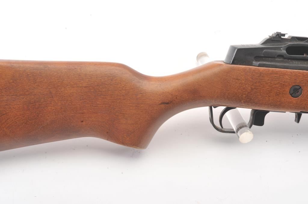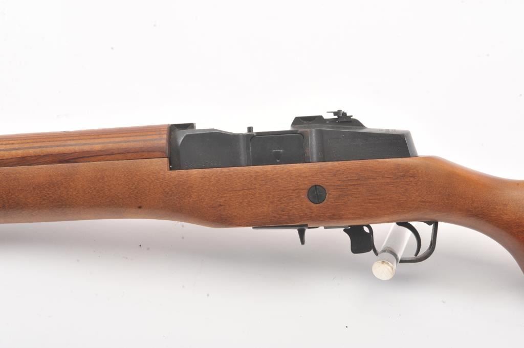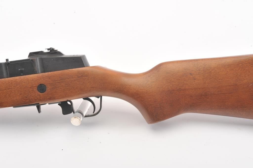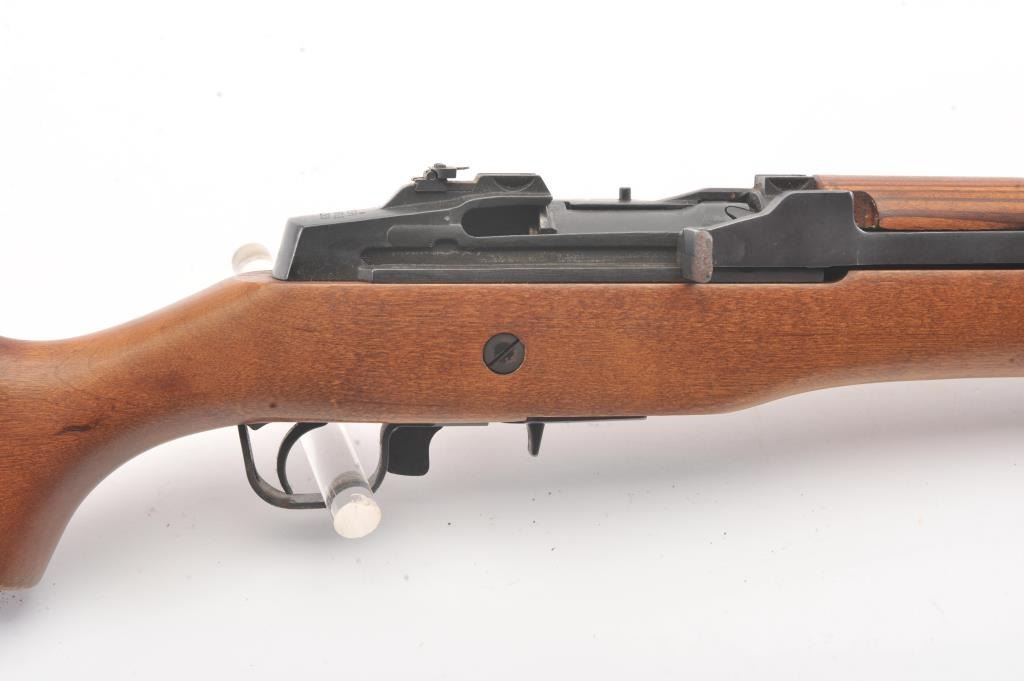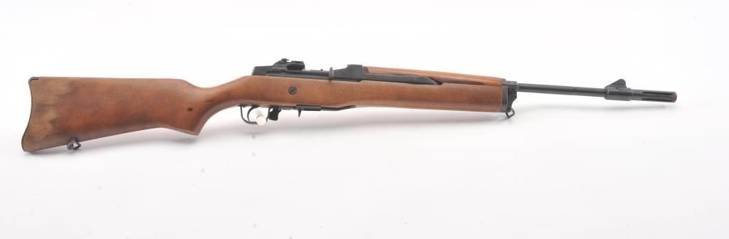 Ruger Ranch Rifle model semi-automatic rifle, .223 caliber, 21” barrel including muzzle break, blued finish, wood stock, no magazine, S/N 188-17888; overall good condition with majority of finish remaining on metal, somescattered minor surface rust from storage, un-cleaned bore, crisp action, sharp markings; wood stock shows old loss of finish at base of butt stock apparently from contact with moisture. (Modern).Est.: $350-$700.