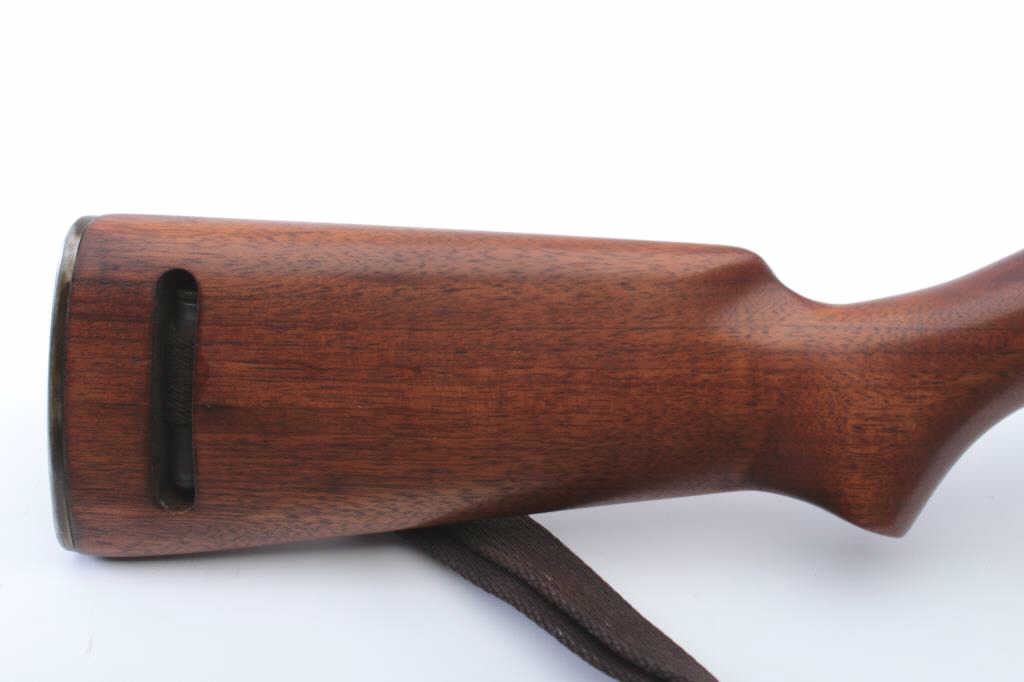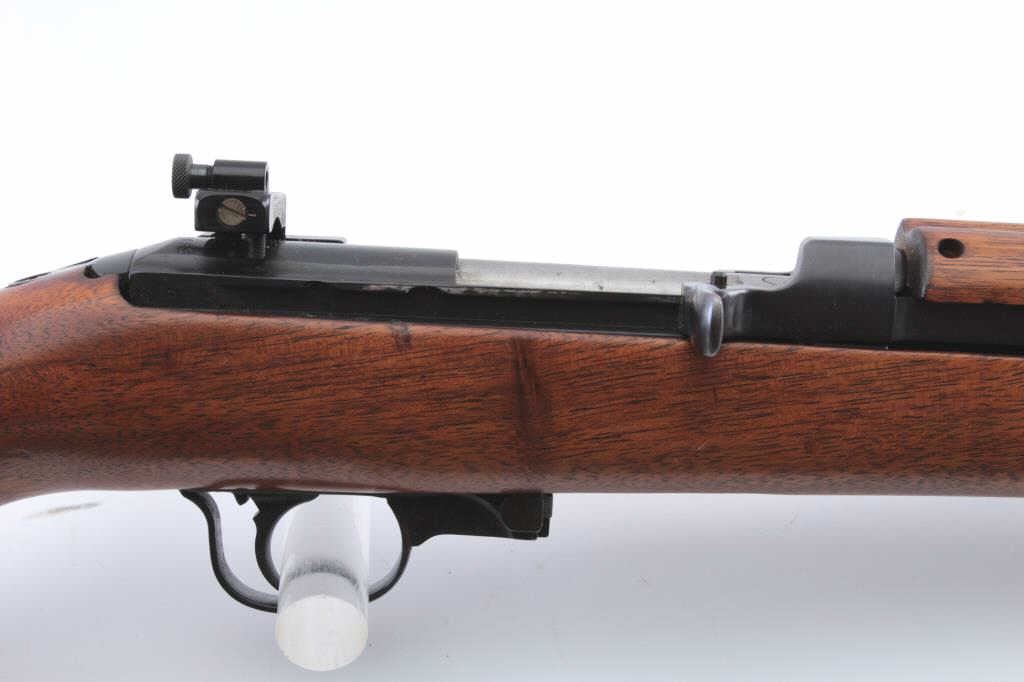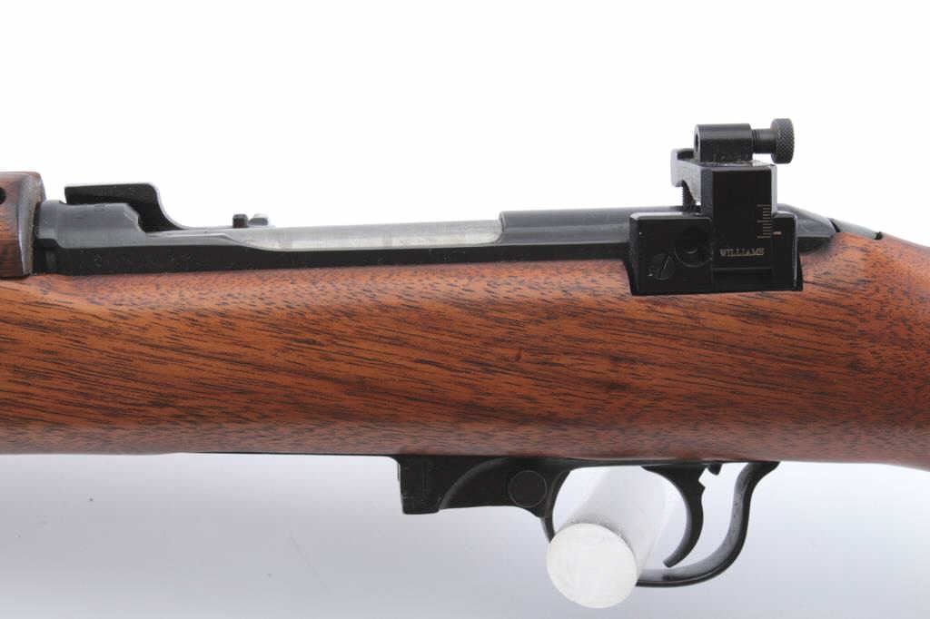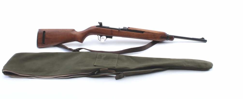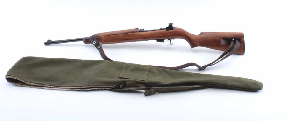 Customized M1 semi-automatic carbine, .30 caliber, 18” barrel with added commercial front sight, re-blued finish, added Williams adjustable receiver-mounted rear sight, wood stock with woven sling and oiler, S/N3890483; accompanied by a green U.S. marked canvas carry boot; overall good to very good as customized; good bore, crisp action, good wood stock. (Modern). Est.: $300-$600.