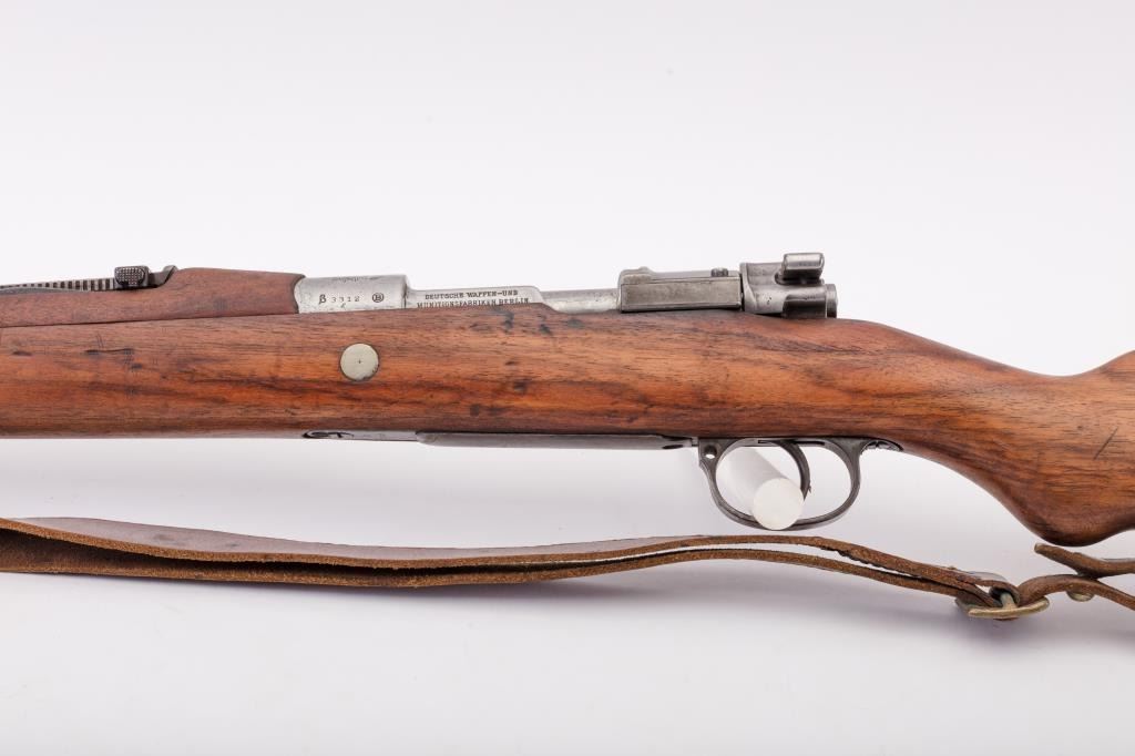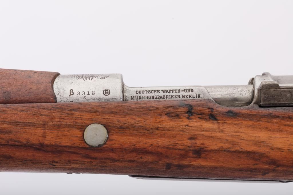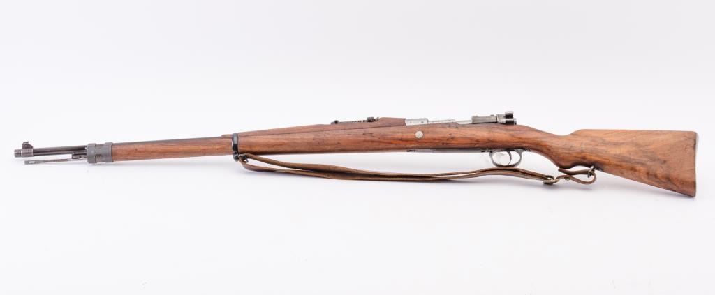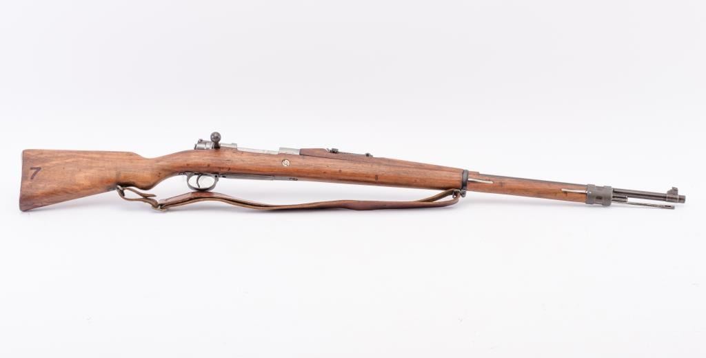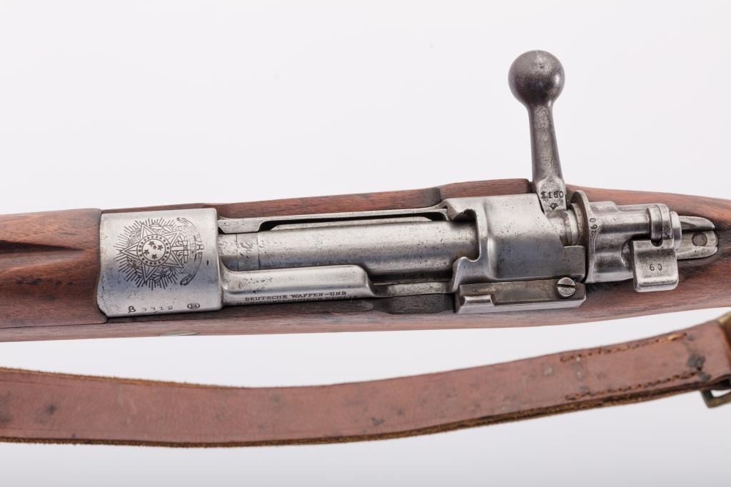 Brazilian Model 1908 DWM Mauser M98 bolt action rifle, 7 x 57 caliber, Serial #3312b. The rifle is in good overall condition with a 29” import marked barrel with a ramped blade front and military tangent style rearsights. The barrel retains a significant amount of the original blue finish while the receiver remains in the white. The front ring shows a crisp Brazilian crest. The smooth wood stock is in good condition withmars and dents consistent with service use. The butt stock retains the ram rod, sling swivels and ends with a smooth steel butt plate. The lot includes the original leather rifle sling. The bore is fair, the actionis crisp and the markings are sharp. Est.: $300-$600. (C+R).