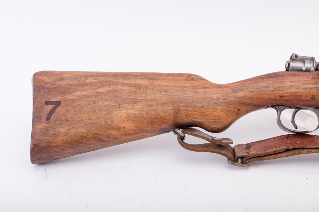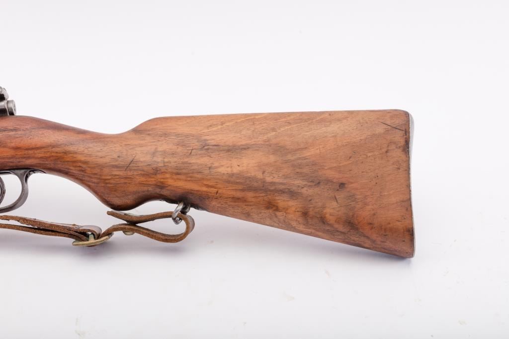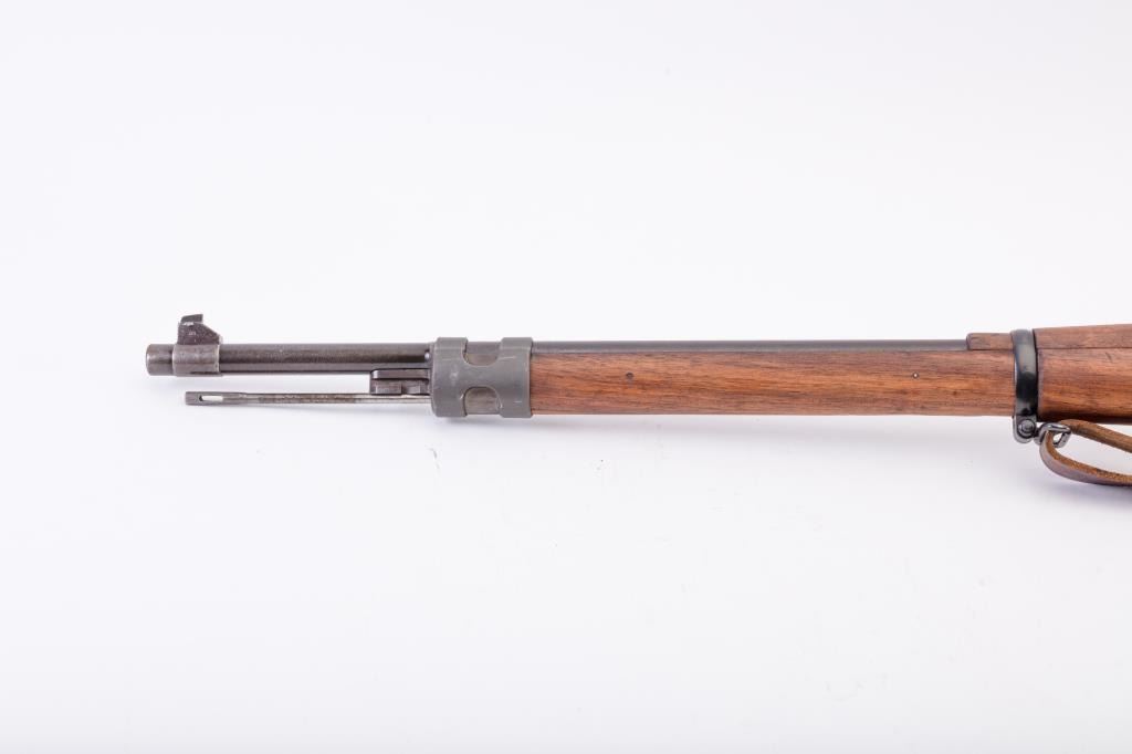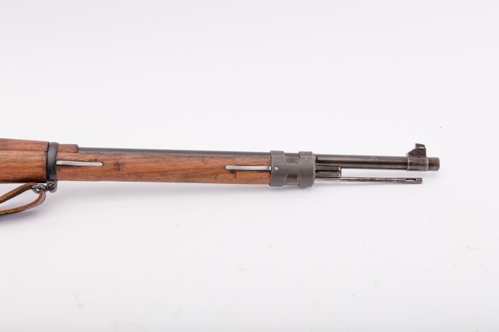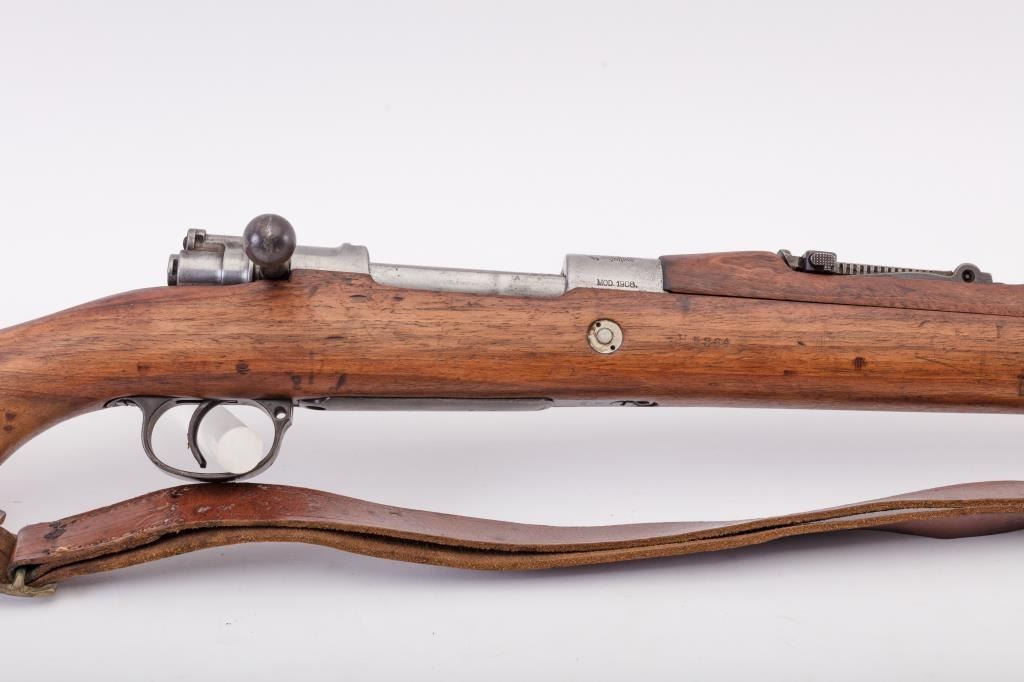 Brazilian Model 1908 DWM Mauser M98 bolt action rifle, 7 x 57 caliber, Serial #3312b. The rifle is in good overall condition with a 29” import marked barrel with a ramped blade front and military tangent style rearsights. The barrel retains a significant amount of the original blue finish while the receiver remains in the white. The front ring shows a crisp Brazilian crest. The smooth wood stock is in good condition withmars and dents consistent with service use. The butt stock retains the ram rod, sling swivels and ends with a smooth steel butt plate. The lot includes the original leather rifle sling. The bore is fair, the actionis crisp and the markings are sharp. Est.: $300-$600. (C+R).
