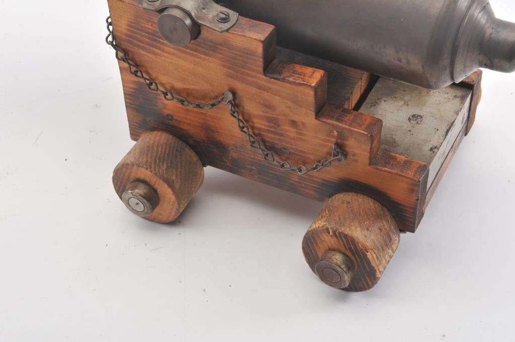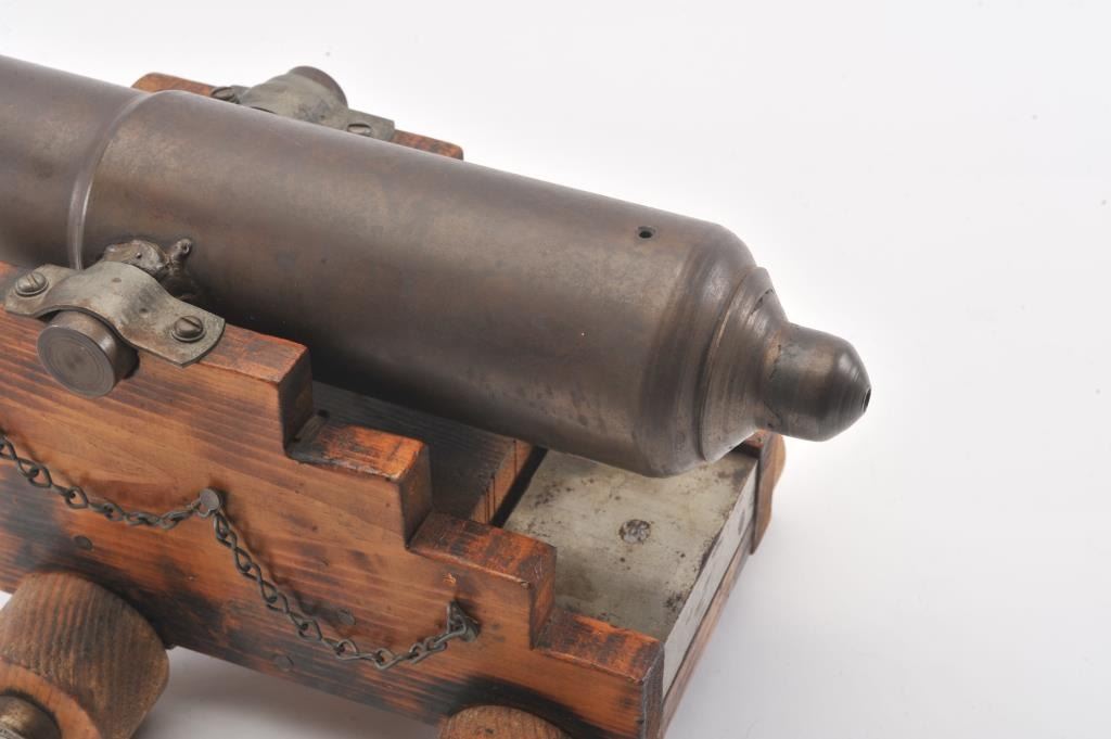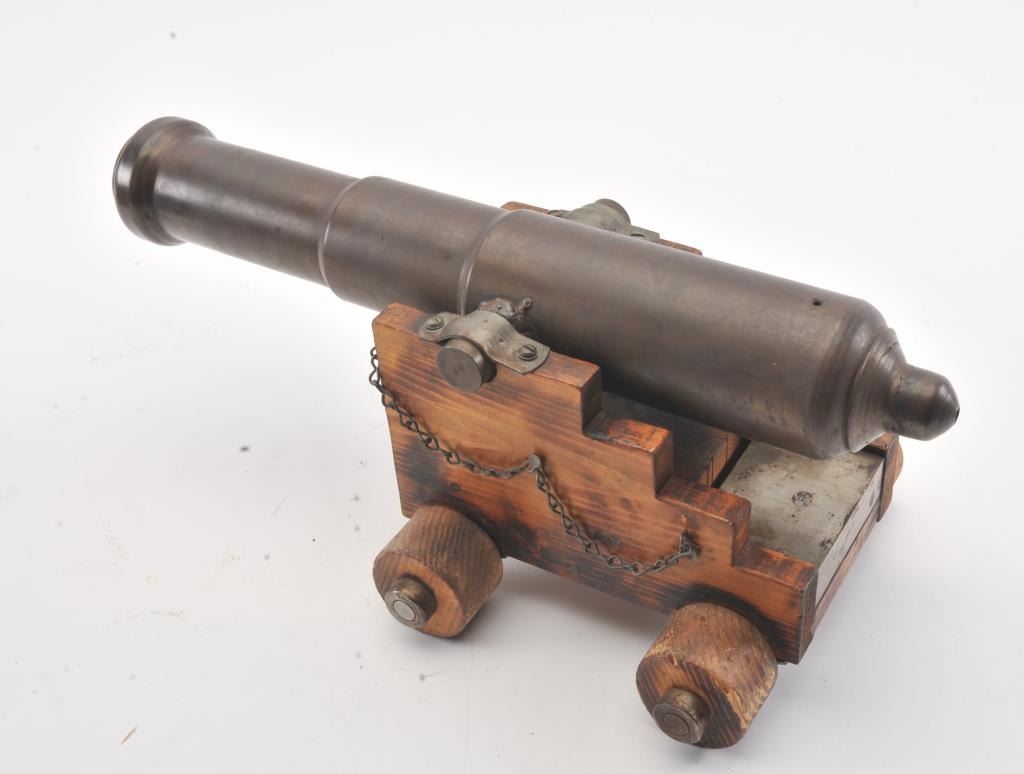 Miniature brass cannon on wood carriage; approximately 18” long un-cleaned barrel with beautiful dark patina, 8” in height and 9.5” wide wheel to wheel. Est.: $350-$700.