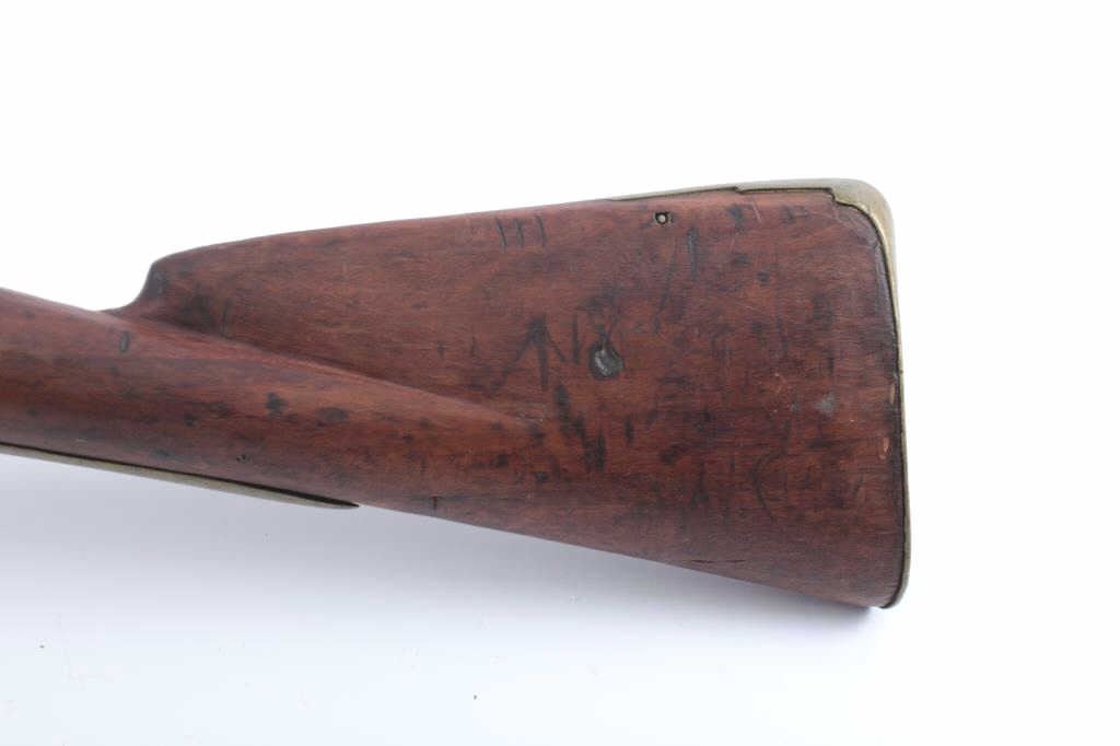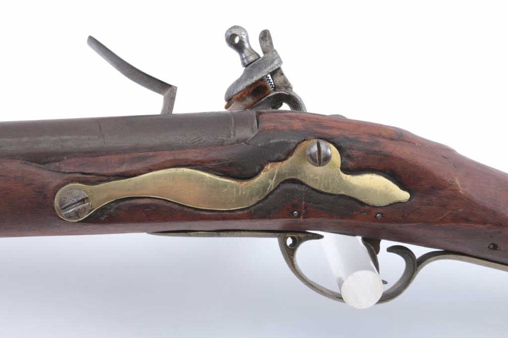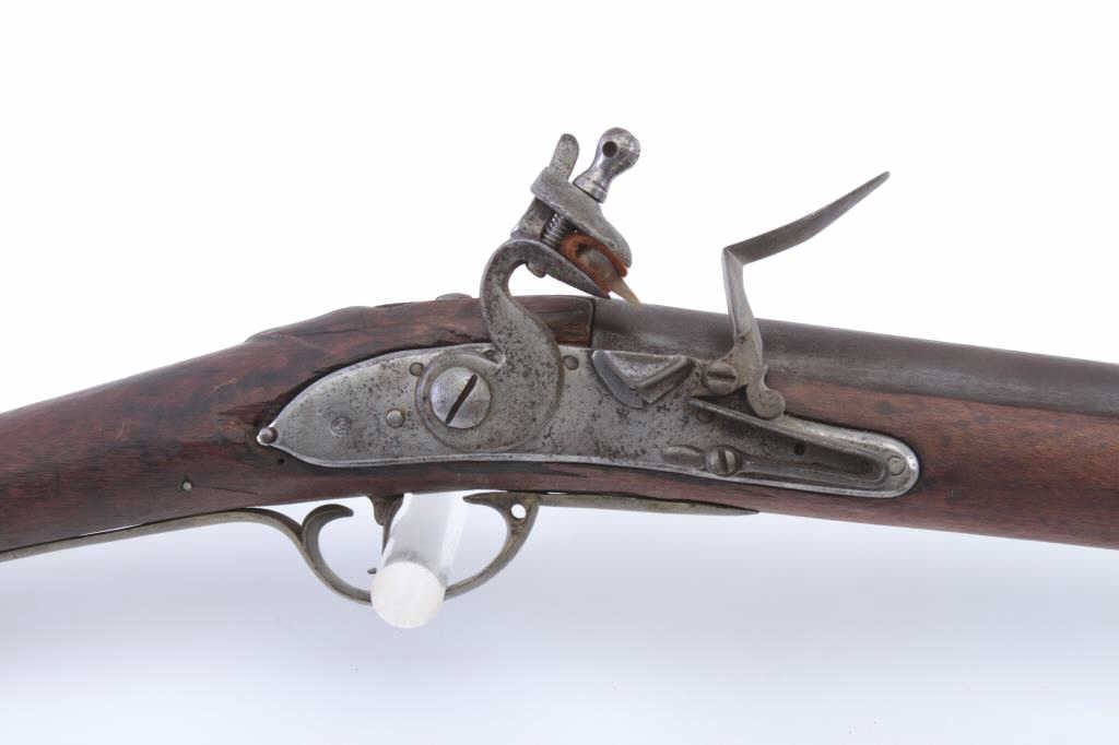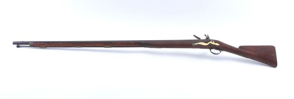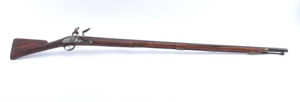 Revolutionary War era flintlock musket showing crown over I.R. proof beneath the pan and two sets of indistinguishable proofs on the left side of the barrel at the breach. The 46” barrel has #109 stamped at the rearand is approximately .75 caliber. There are brass mounts at the front end of the stock with period repairs using Tiger Striped wood, the fore end shows many losses and slivers missing along the top edge. The stocking iscrude and possibly hand hewn. The condition is fair overall and the lock works well. The brass mounts are crude and the rear ramrod Ferrell where it meets the stock has a long flat tail which is worth researching, as ithas the Revolutionary War look. Est.: $750-$1,500. (Antique).