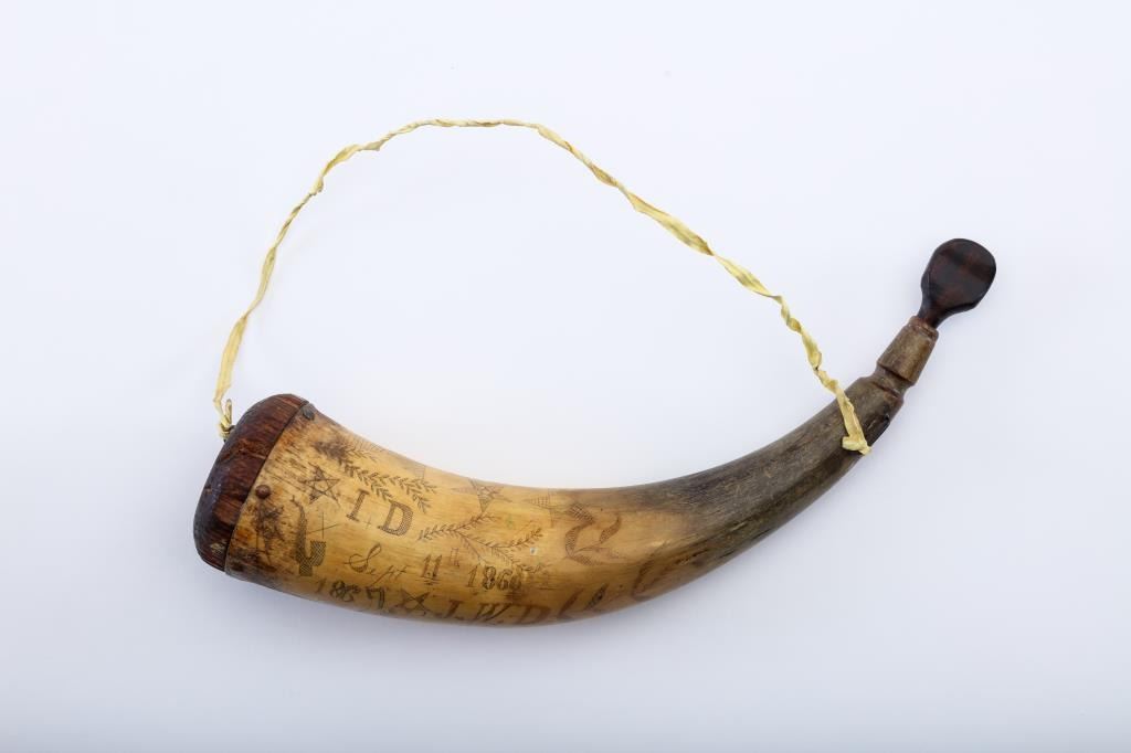 Carved Powder Horn in Native American motif stars, foliate borders and I’D Sept 11, 1866 1st line 1867 (Star) J.W.D. Measures 9” across curve of small to medium size metal staple style front hanger with rawhidetwisted cord. Good condition with minor chip and losses. Found in Northern California by old collector. Est.: $175-$350