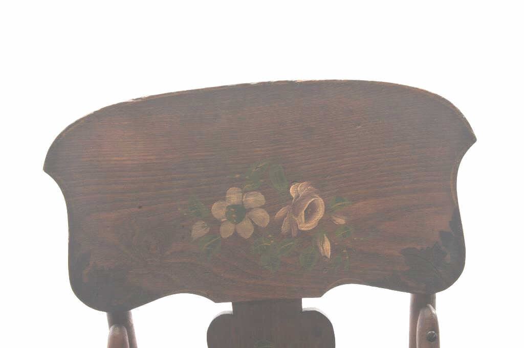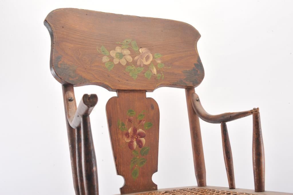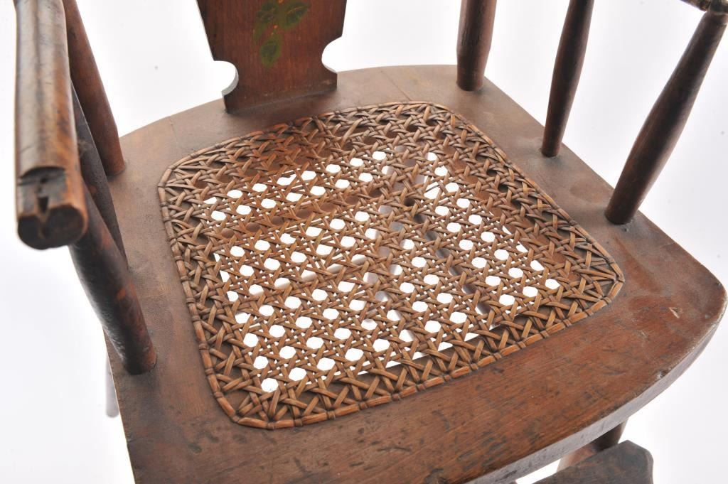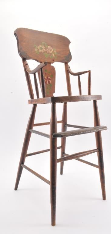Antique oak child’s high chair with caned seat and painted flowers on back supports; left arm rest shows old loss at front spindle; approximately 40” in height, 15” wide and 20” deep. Est.: $100-$175.