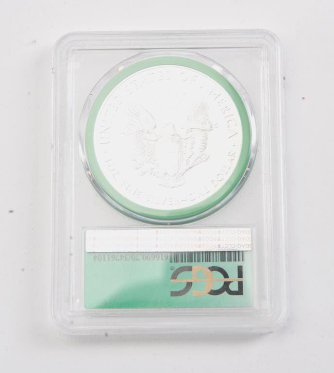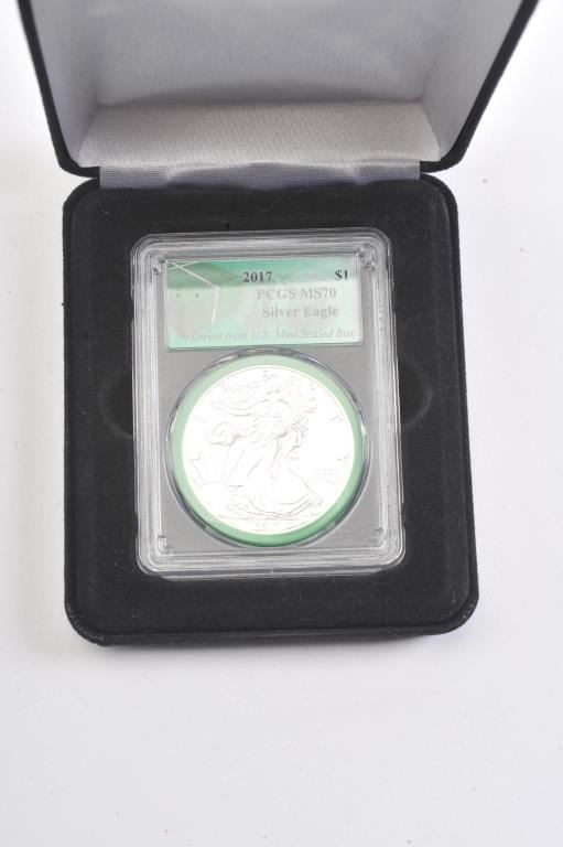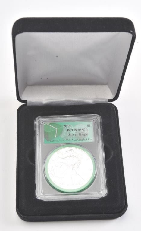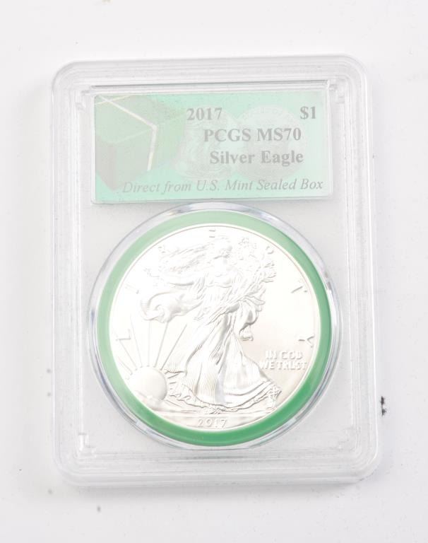 2017 Silver Eagle $1 coin graded PCGS MS70. The coin is marked “Direct from U.S. Mint Sealed Box”. Est.: $50-$100.