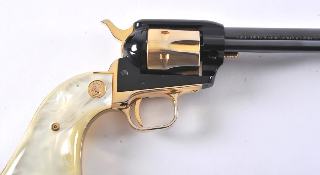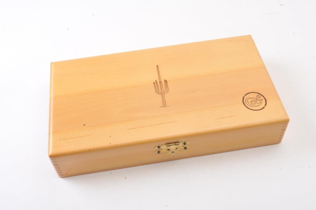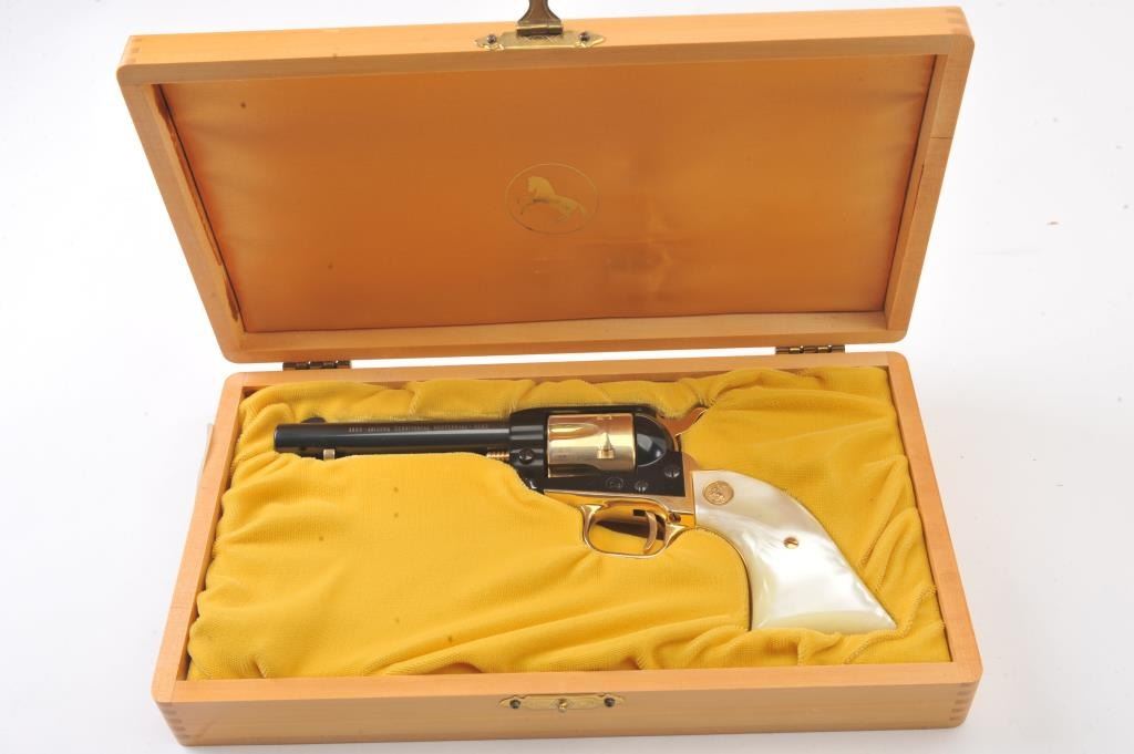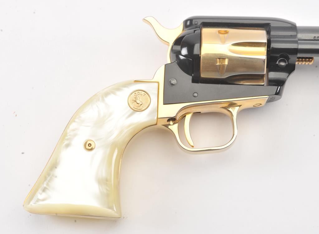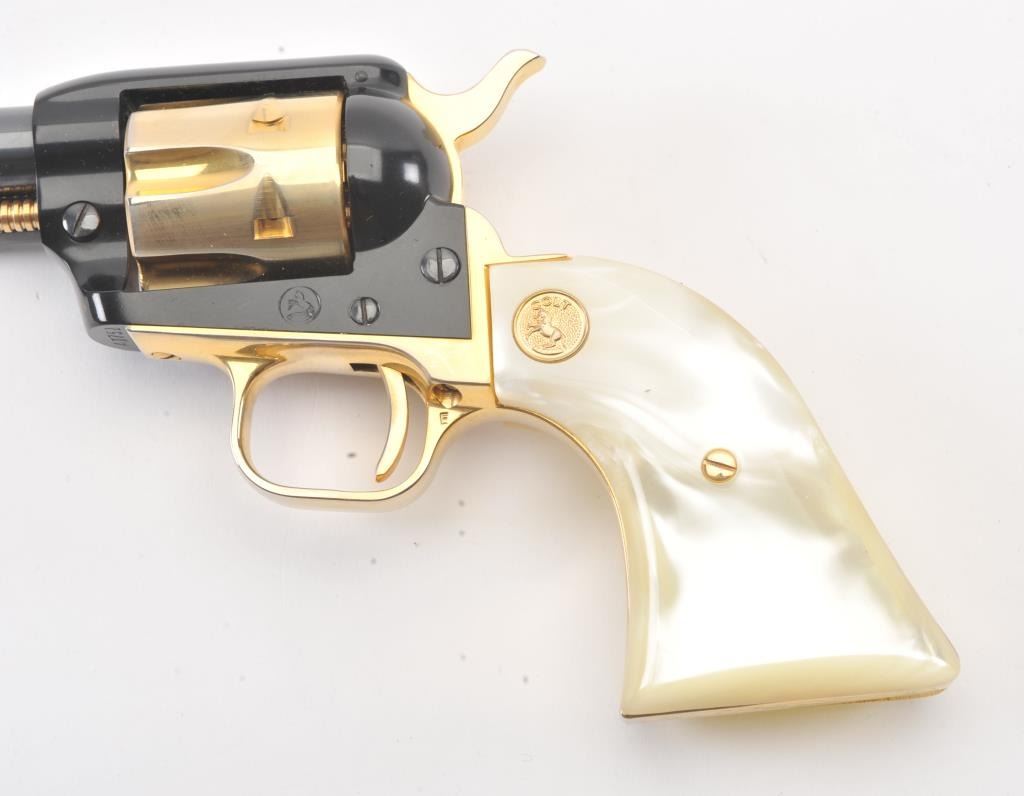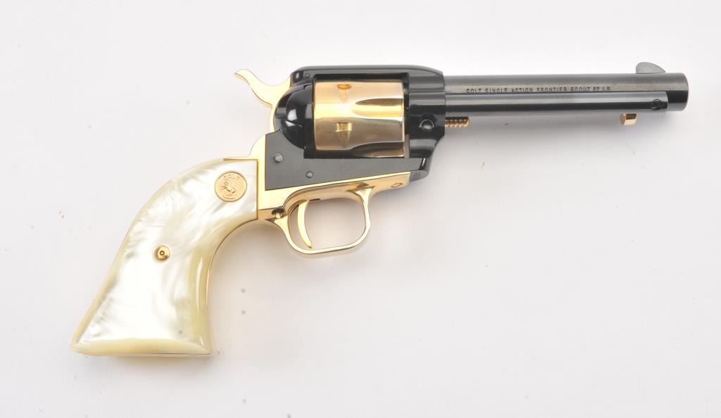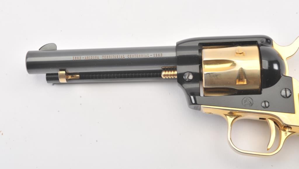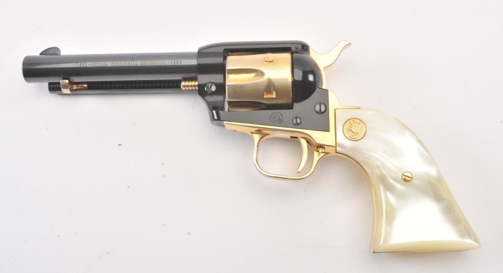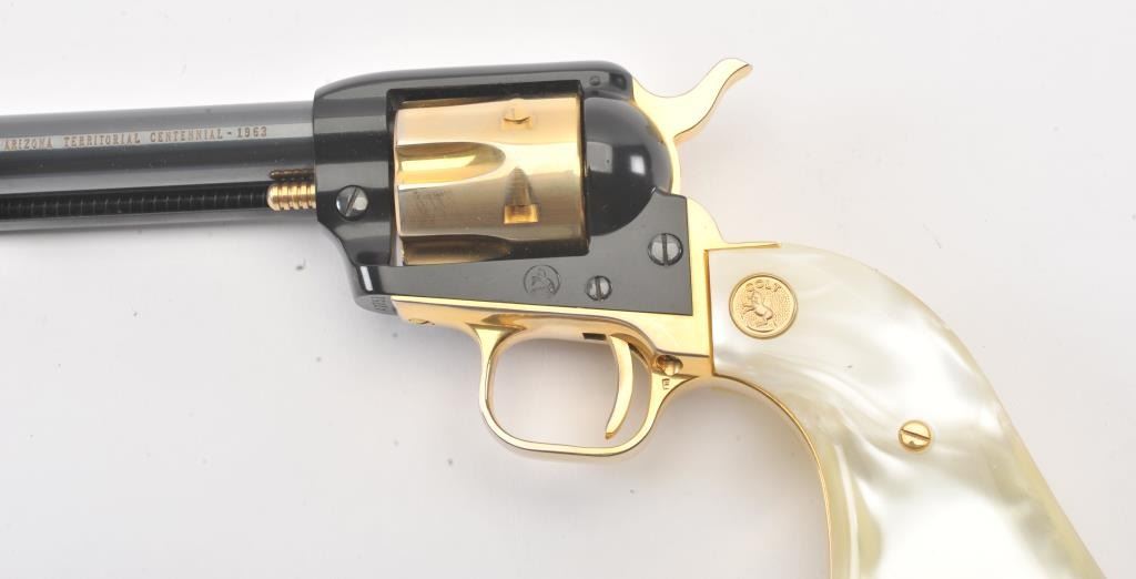 Colt Arizona Territorial Centennial (1863-1963) Frontier Scout Model SAA revolver, .22LR caliber, 4.75” barrel, blued finish with gold accent straps, cylinder, hammer, cylinder pin and ejector housingactuator, faux pearl Colt medallion grips, S/N AT751; like new condition in factory lined wood presentation case. (C&R/PPT). Est.: $300-$600.