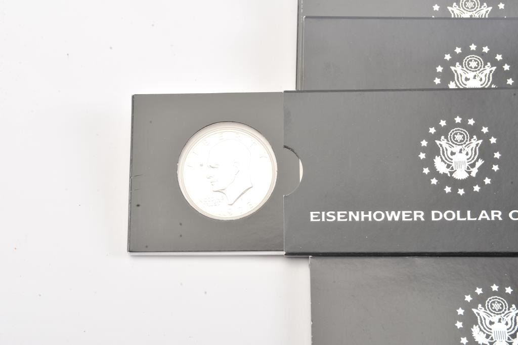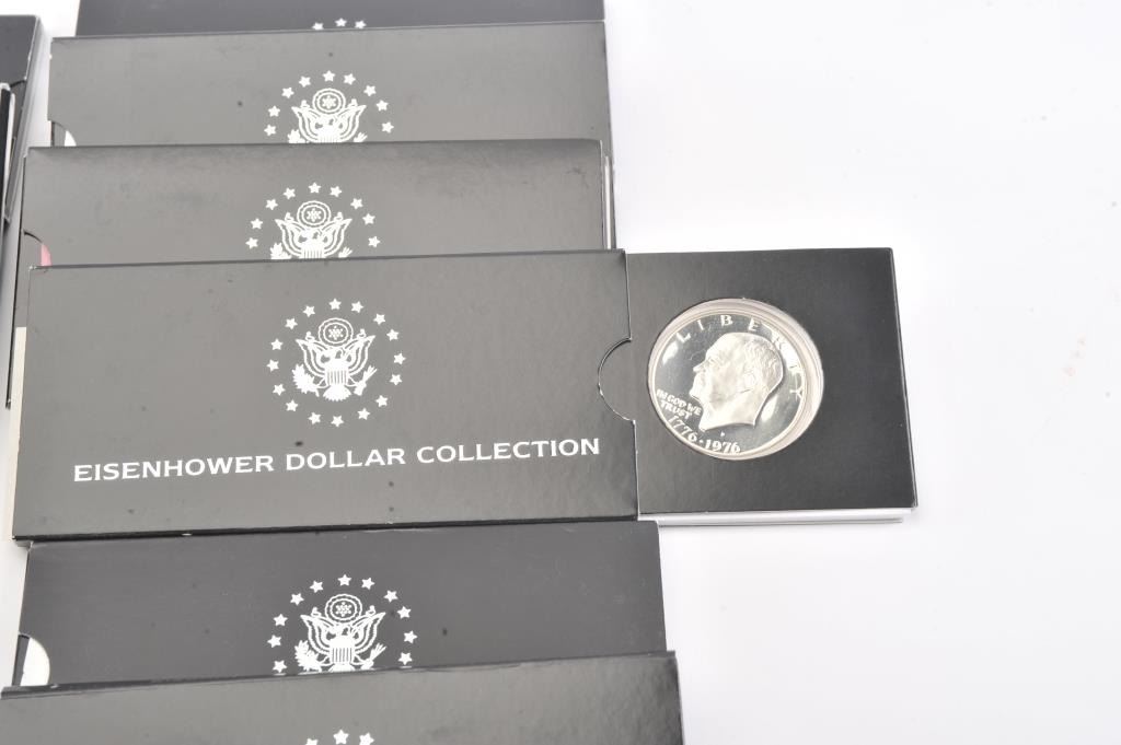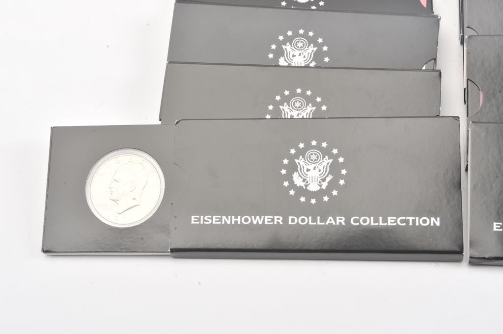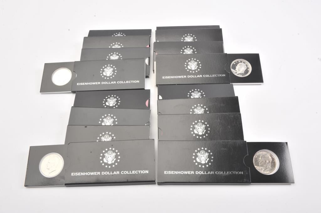 Lot of 16 First Commemorative Mint Eisenhower Dollar Collection two coin sets from 1971 through 1978. The lot includes sixteen two coin sets with four bi-centennial sets included. All sets are in as new conditionin the FC Mint packaging with certificates of authenticity. Est.: $150-$300.