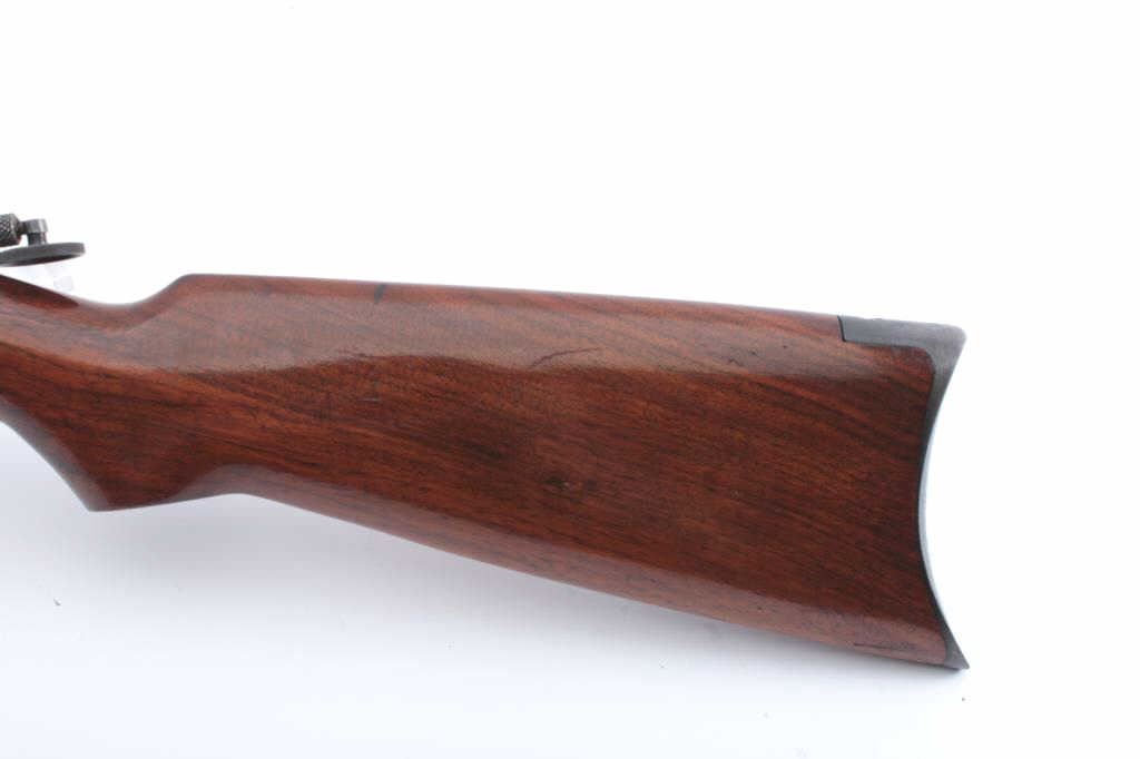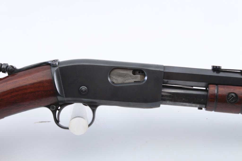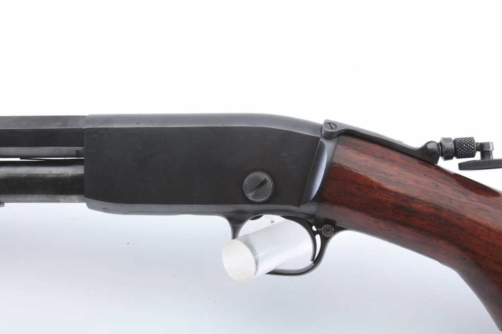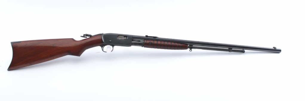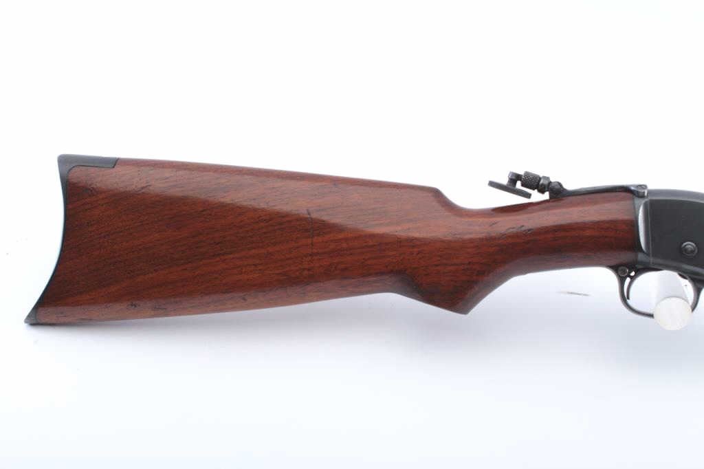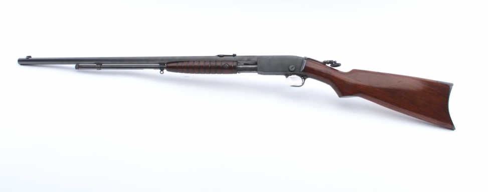 Remington Target Model 12-C NRA takedown pump rifle, .22 Short, Long or Long Rifle caliber, Serial #479897. The rifle is in fine overall condition with a 23” octagon barrel with a ¾ length magazine. The frontsight is a Marbles blade and the rear is a Marbles folding leaf. The rifle retains approximately 95%+ of the original blue finish with sharp edges and light handling marks. A period Lyman tang sight has beenadded during the period of use. The smooth wood stocks are in very good condition with light storage marks. The butt stock ends with a smooth steel crescent butt plate. The bore is good, the action is crisp and themarkings are sharp. Est.: $350-$700. (C+R).