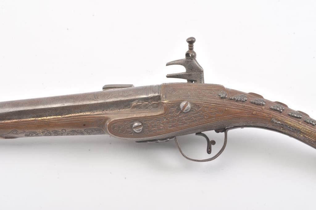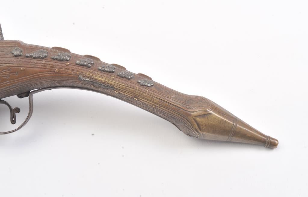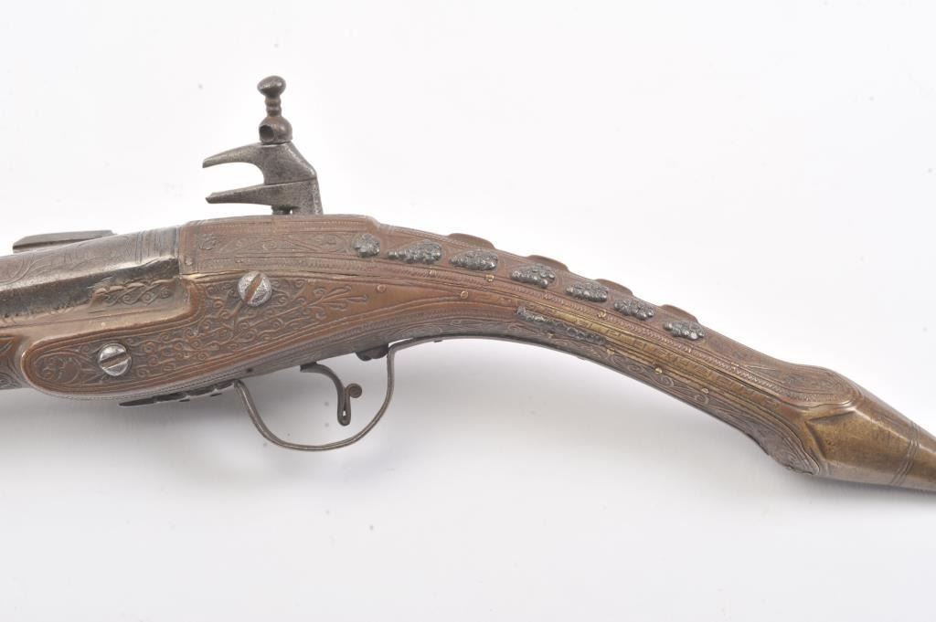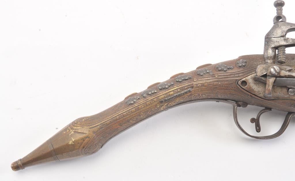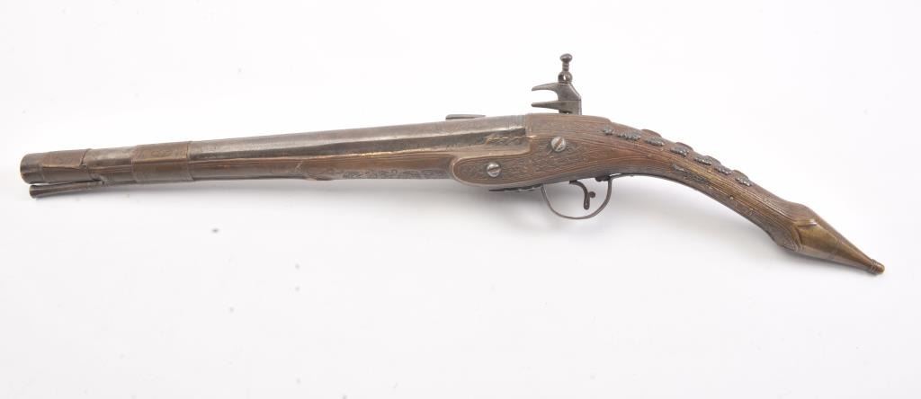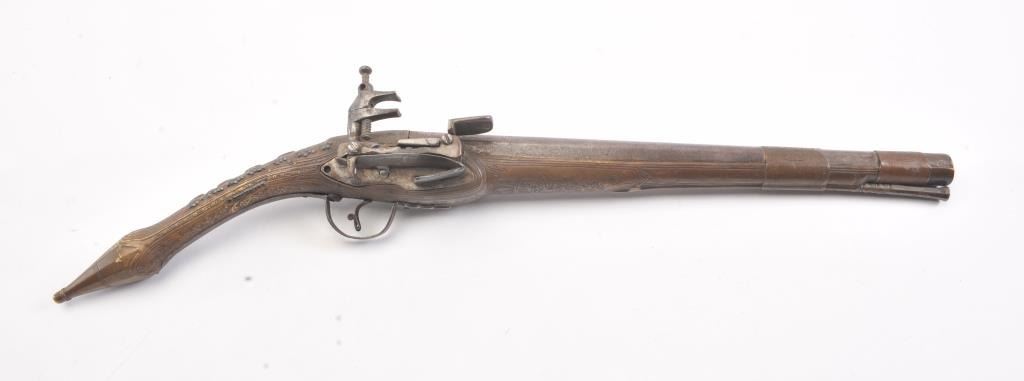 Mid-Eastern to Baltics miquelet flintlock pistol with barrel spuriously signed "Lazarino". Engraved brass stock with pewter overlays. Measures 20 1/4" overall with a 12" barrel. Approximately .60 caliber smoothbore. The lock is not releasing properly otherwise good overall. An authentic 19th century antique. (Antique) Est.: $300-$600