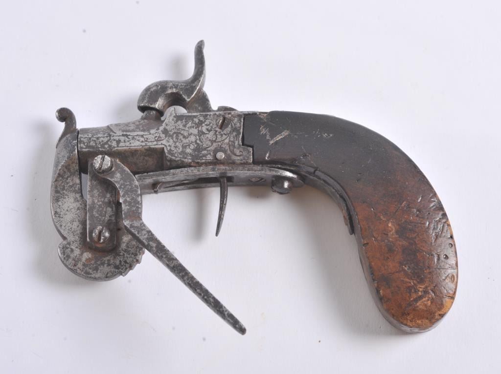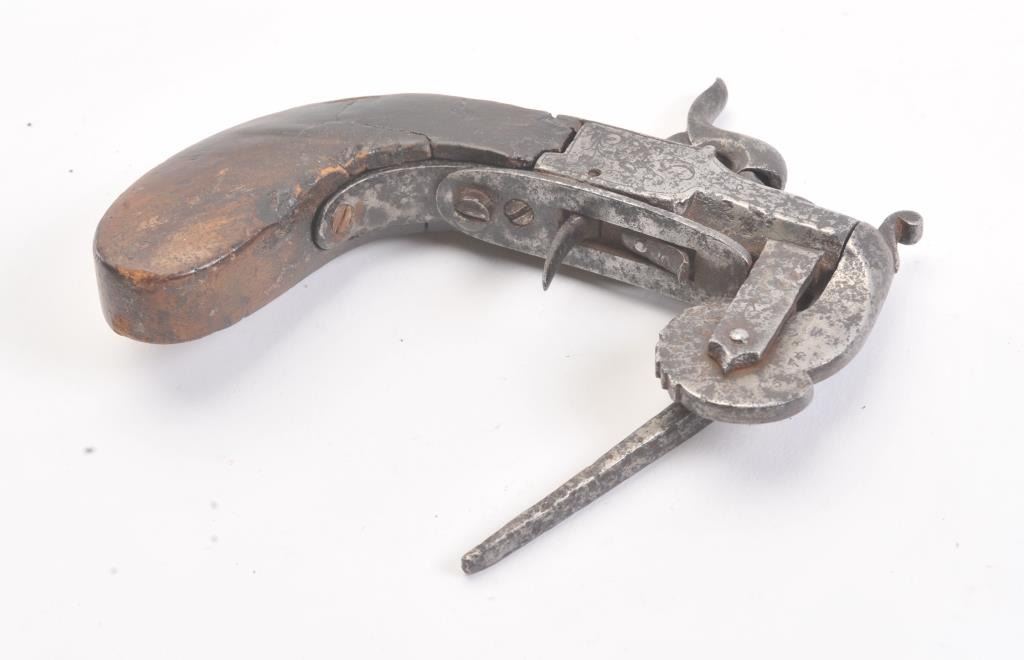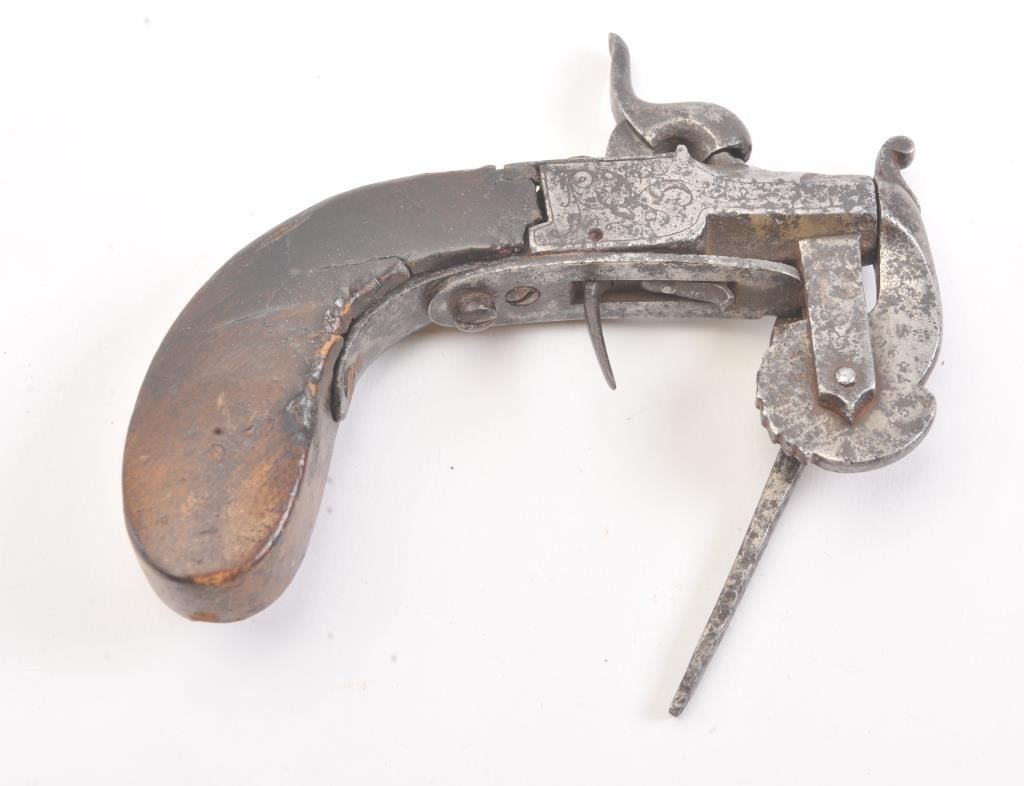 Central European powder tester circa about 1850. Good quality with engraving. Shows light to fairly heavy pitting overall. The stock is fair to good with small losses and honest wear from use. The owner must havebought a lot of powder or was a dealer! Measures 5 1/2". Est.: $250-$500