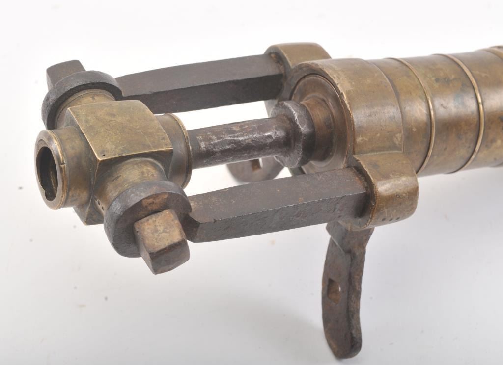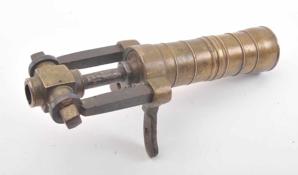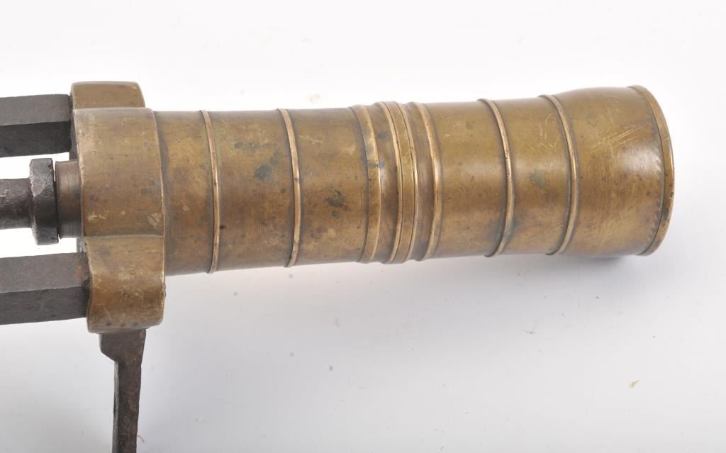 18th-19th century naval type flare gun with brass barrel and iron legs and mounts. The tube is ringed and measures 8" in length with approximately 1 1/2" bore. Breech unscrews and flips and the rear area tapped forattachment to rail or pole. Marked "5" and European military in styling but not exactly identified. These were used to set sails on fire as well as signal. Good condition with deep patinas and some pitting on iron mounts. (Antique) Est.: $350-$700