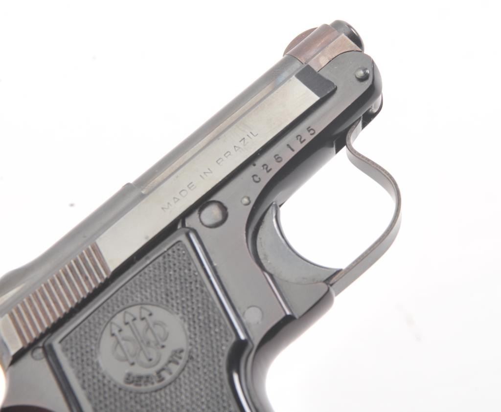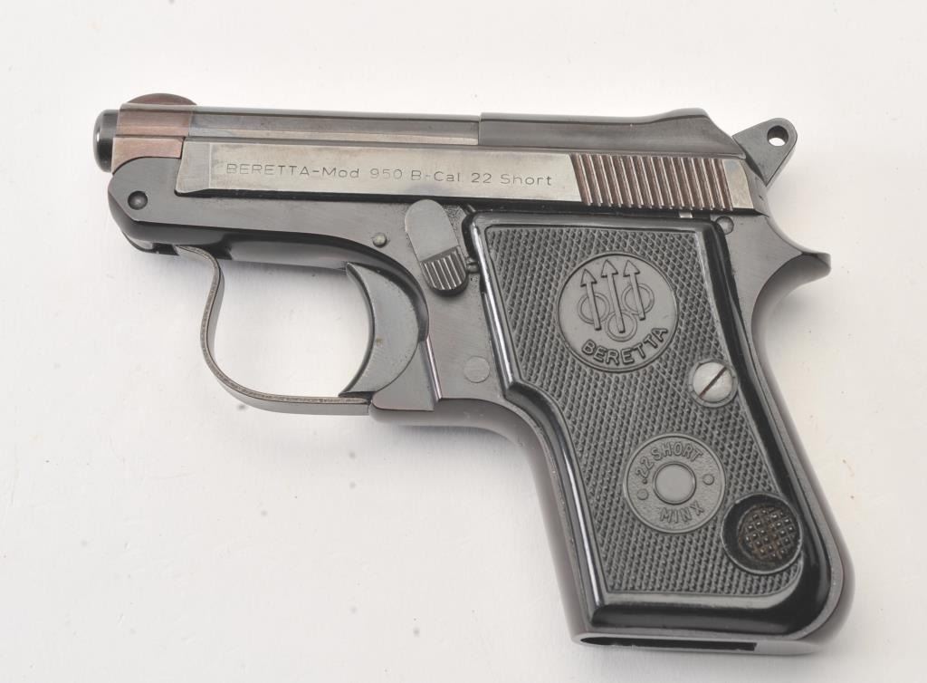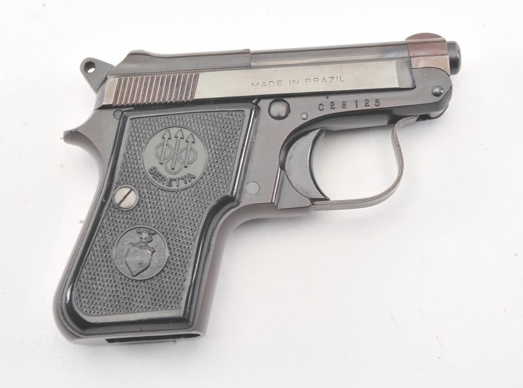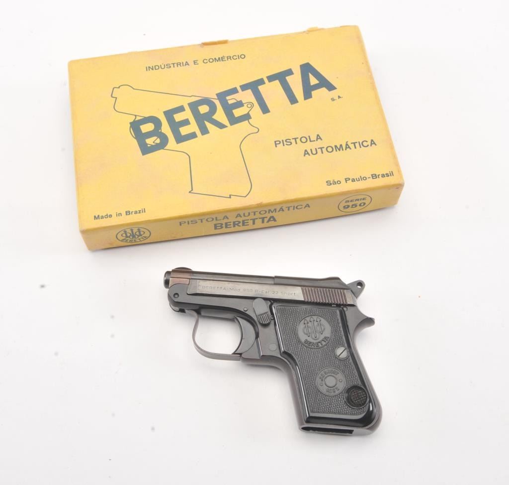 Beretta 950B semi-automatic pistol, .22 Short caliber, Serial #C26125. The pistol is as new in the factory box with a 2 ¼” barrel. The pistol retains nearly all of the blue finish. The frame is marked, “MADE INBRAZIL”. The bore is good, the action is crisp and the markings are sharp. The lot includes the factory cardboard box but no magazine. Est.: $200-$400. (Modern/PPT).