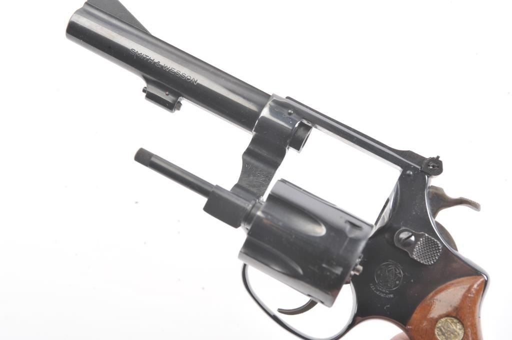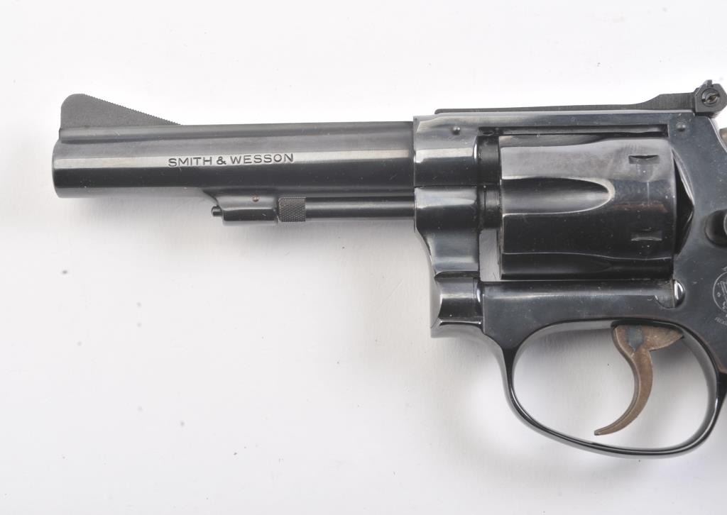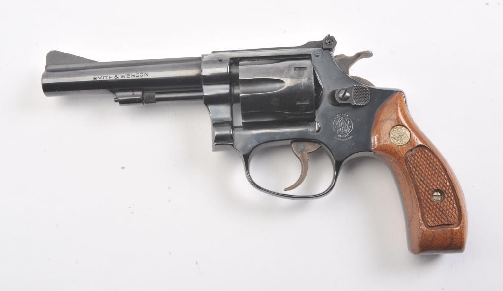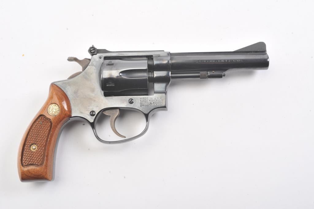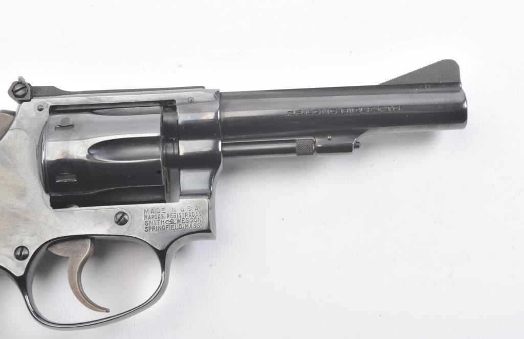 Smith & Wesson Model 34-1 double action revolver, .22 Long Rifle caliber, Serial #M65970. The pistol is in excellent overall condition with a 4” barrel. The pistol retains 98%-99% of the blue finish with vivid case colors on the hammer and the trigger. The checkered wood medallion grips are in excellent condition with sharp checkering showing little use. The bore is good, the action is crisp and the markings are sharp.Est.: $300-$600. (C+R/PPT).