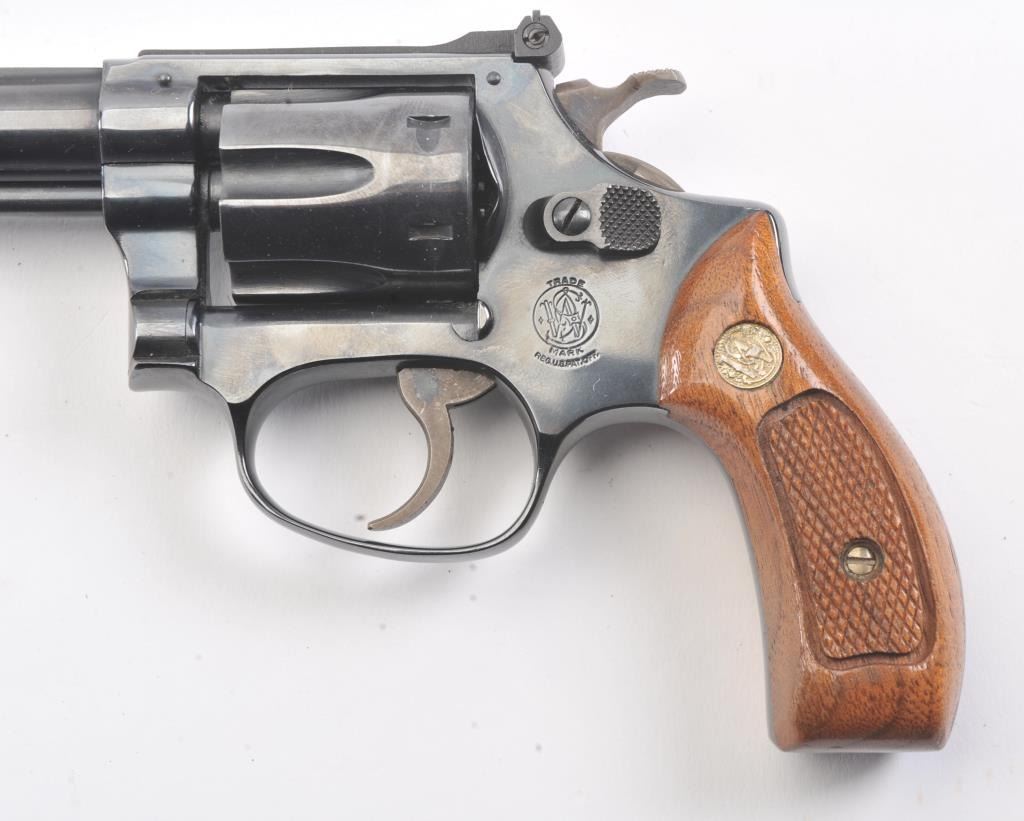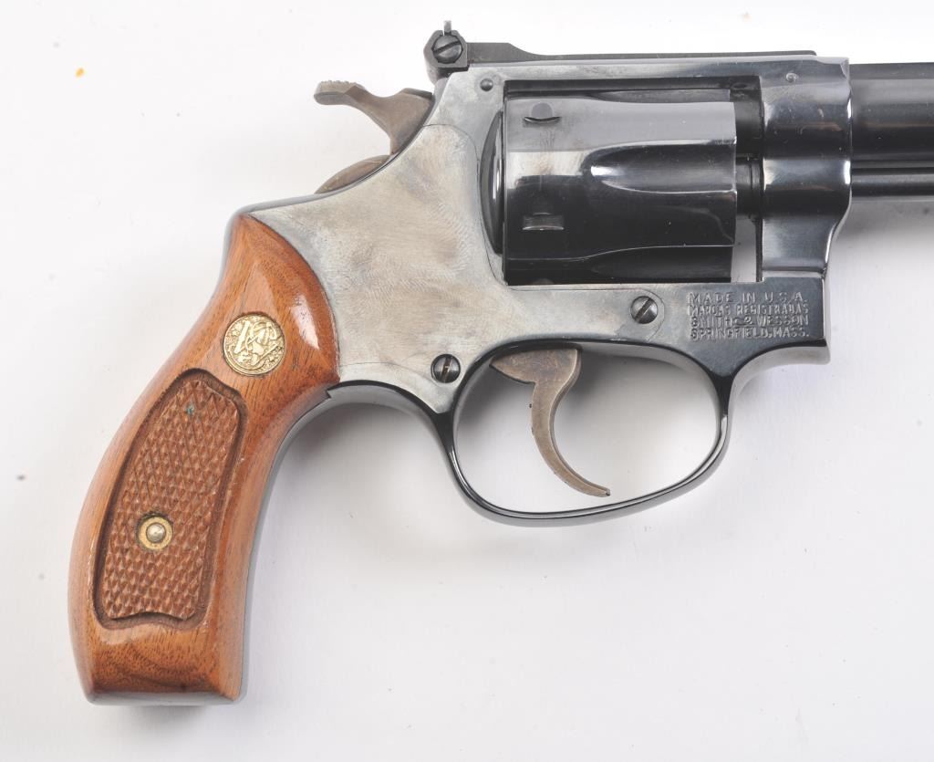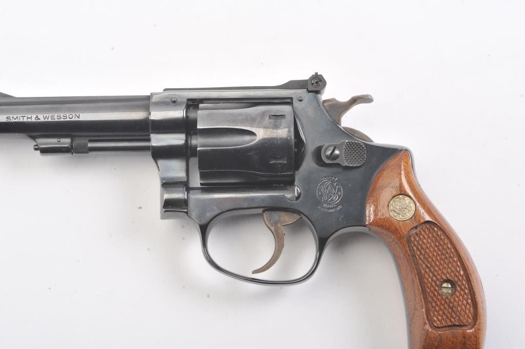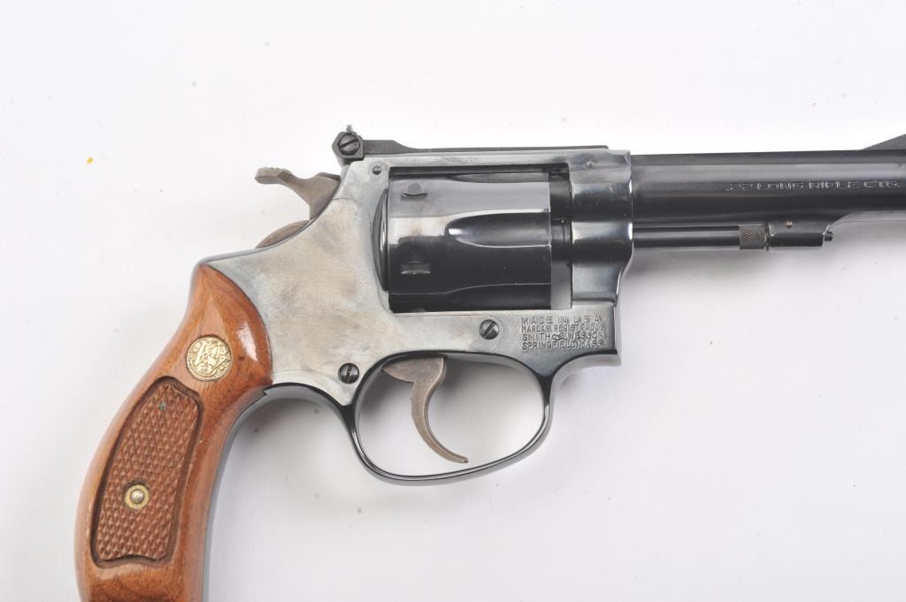 Smith & Wesson Model 34-1 double action revolver, .22 Long Rifle caliber, Serial #M65970. The pistol is in excellent overall condition with a 4” barrel. The pistol retains 98%-99% of the blue finish with vivid case colors on the hammer and the trigger. The checkered wood medallion grips are in excellent condition with sharp checkering showing little use. The bore is good, the action is crisp and the markings are sharp.Est.: $300-$600. (C+R/PPT).