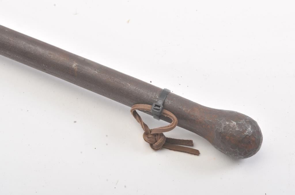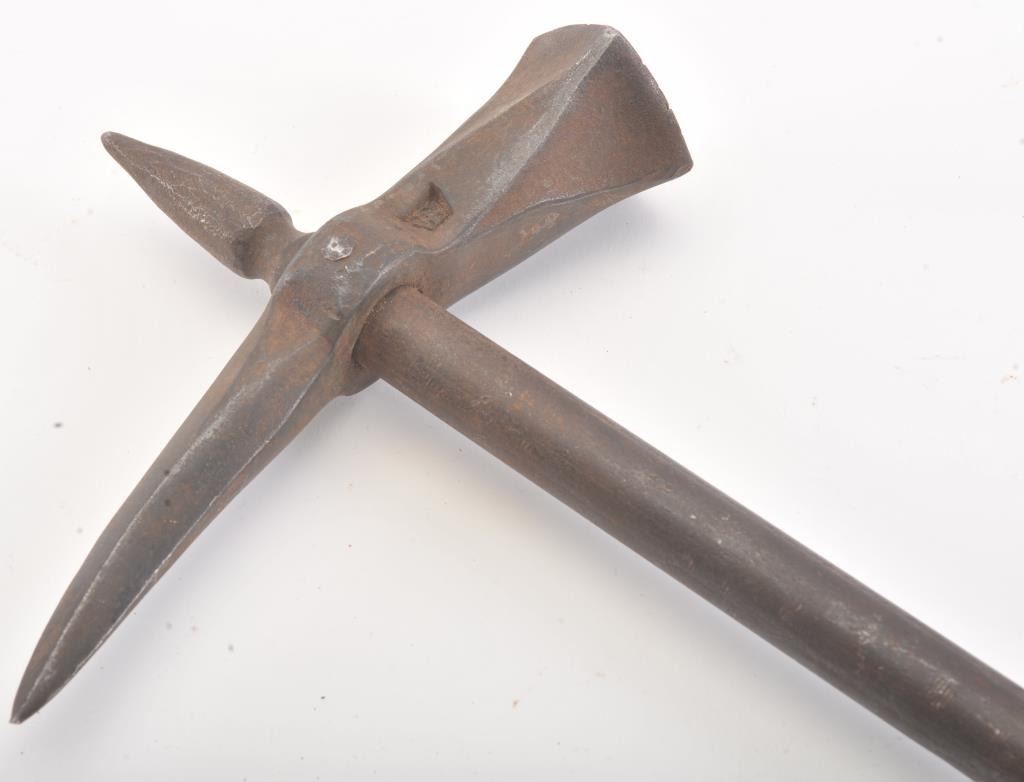 Eastern European war hammer with deep armorer’s style stamp which appears to be a 3 pointed crown over OO. Measures 22 1/2" in length and 8 1/2" from front to rear of spike. Forged and not cast. Weighs 4 lbs.absolutely antique over 100 years old and possibly period of 1600s. It is from an old collection and we have had disserting "Experts" on the age as whether Victorian or 17th century. Est.: $500-$1000