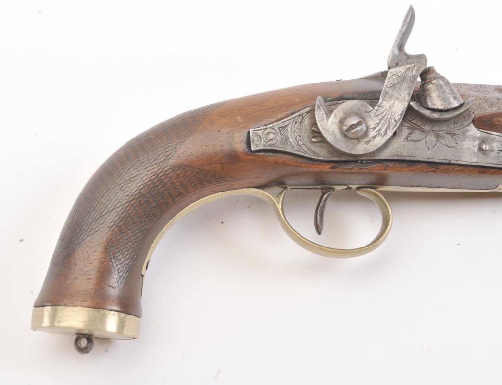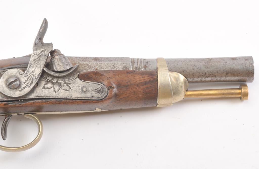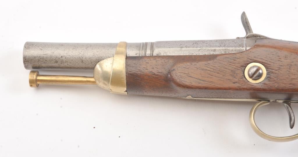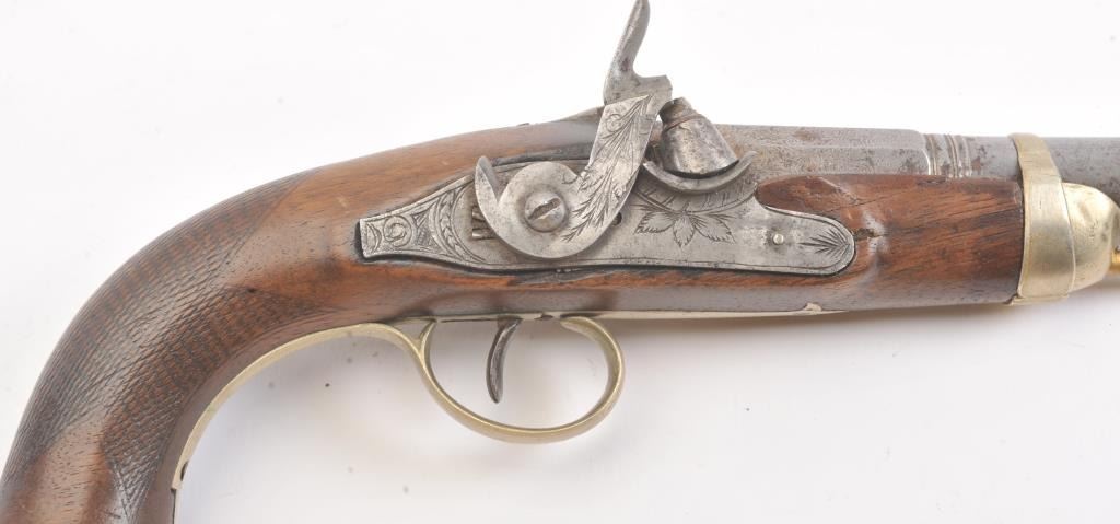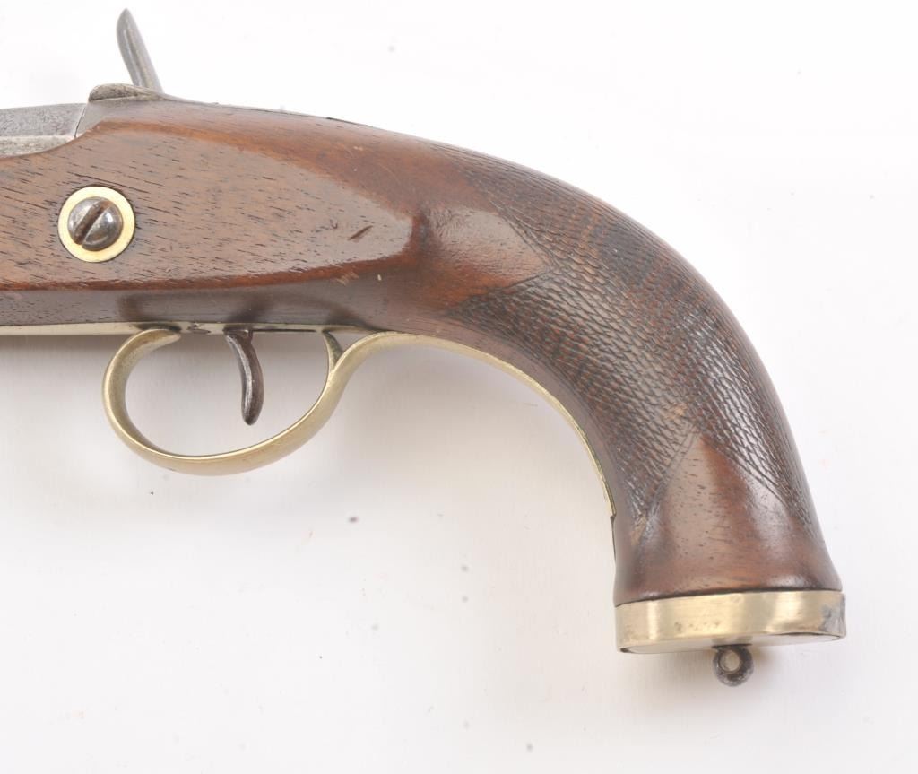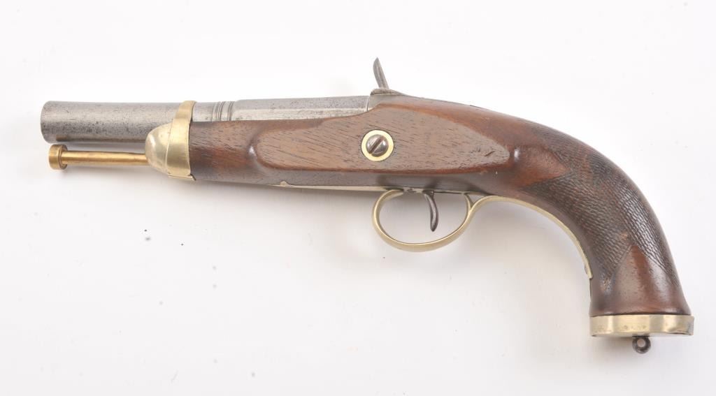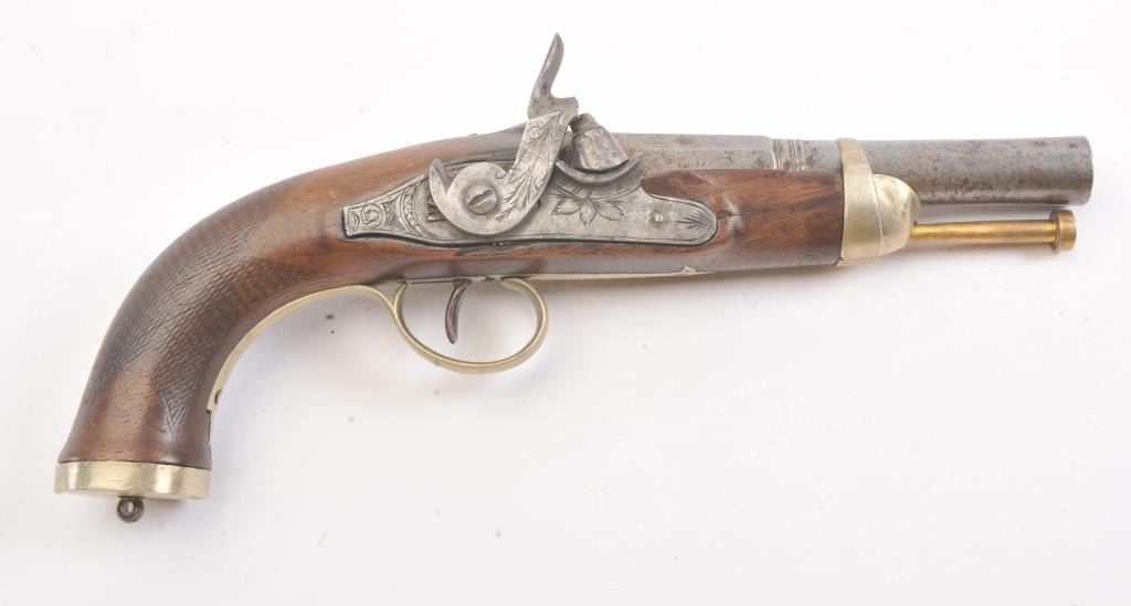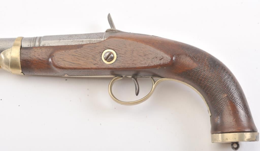 Interesting Spanish style percussion pistol with silver or German silver mountings. Measures 11" overall with a 5 1/4" barrel of approximately .60 caliber smoothbore. Front of the hammer sheared off otherwise good andaction working. (Antique) Est.: $175-350