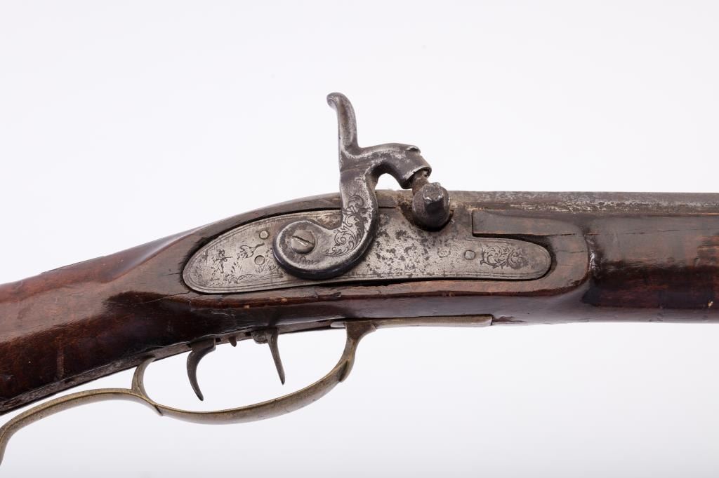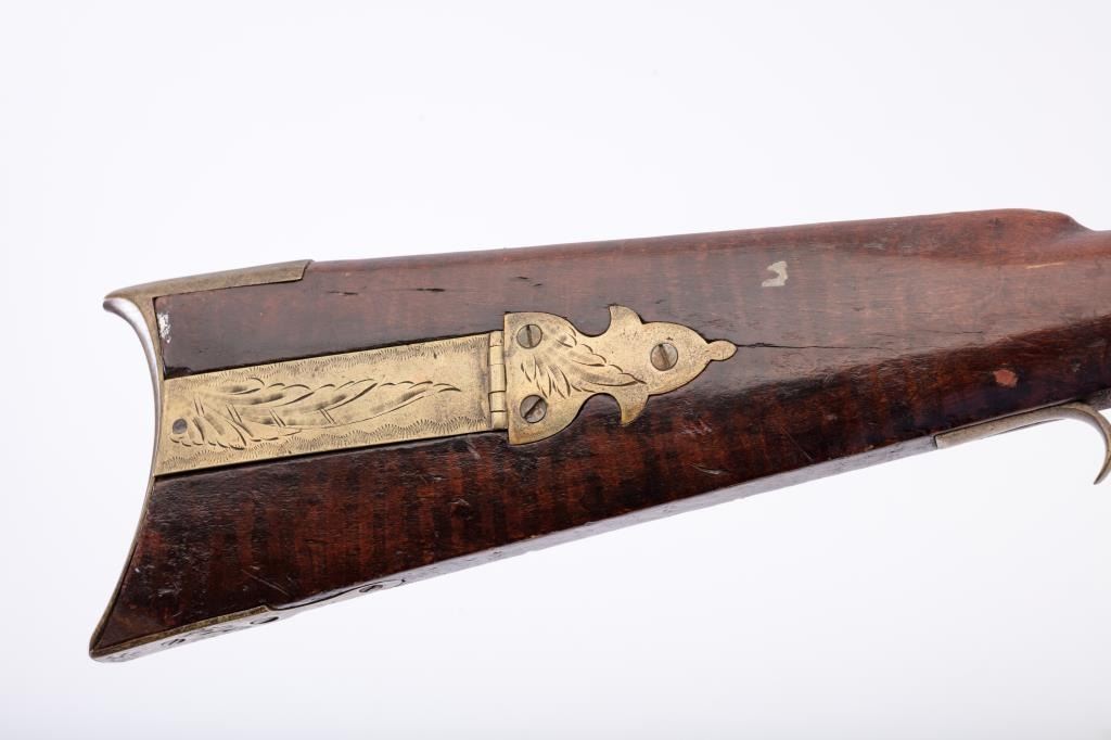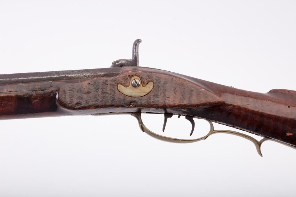 Full stock Kentucky rifle signed in fancy script on the barrel but not legible. Artificially striped wood with simple engraved patch box and set trigger. Measures 59 ½” overall with a 43 ½” barrel ofapproximately .36 caliber rifled and of medium weight. Gray to brown patina with light to slightly heavy scattered pitting. The heavier pitting is located at firing areas and the breech. The stock shows oldcoating of thin varnish or shellac. The stock is good to very good with a couple minor losses at the top edge and other minor imperfections. The lock does not hold on cocking. From an old Northern Californiacollection. (Antique) Est.: $600-$1200