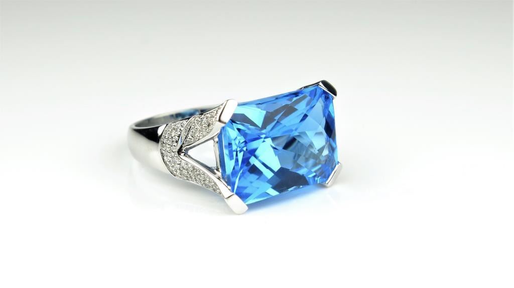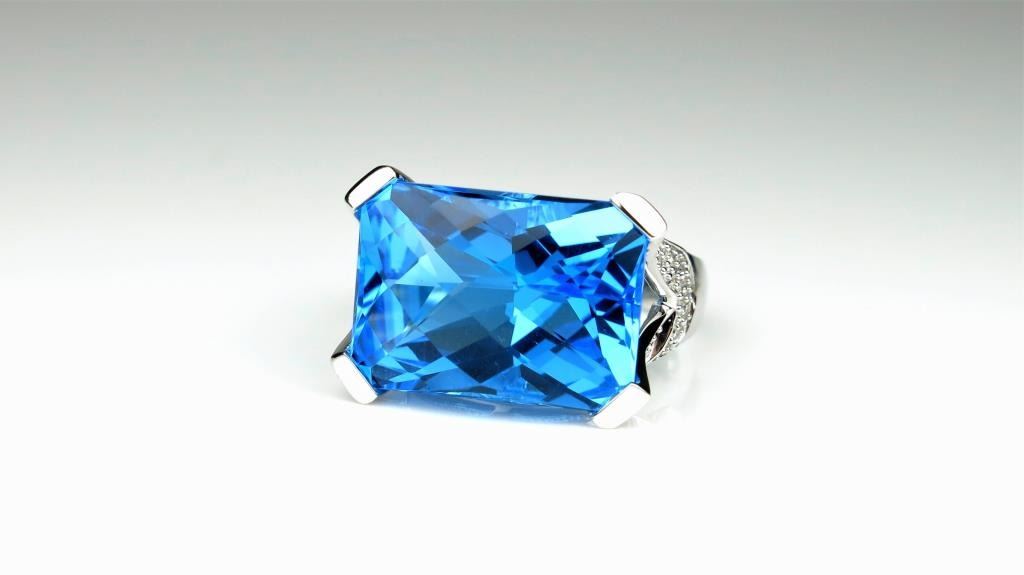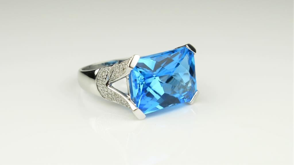 46. Amazing Swiss Blue Topaz and Diamond Ring weighing approx. 22.00 carats and pave set with 24 round Diamonds with F-G colors and VS clarity set in a heavy designer style 14 karat white gold setting. Retail$3,000-$4,000 Estimates $1,500-$2,000