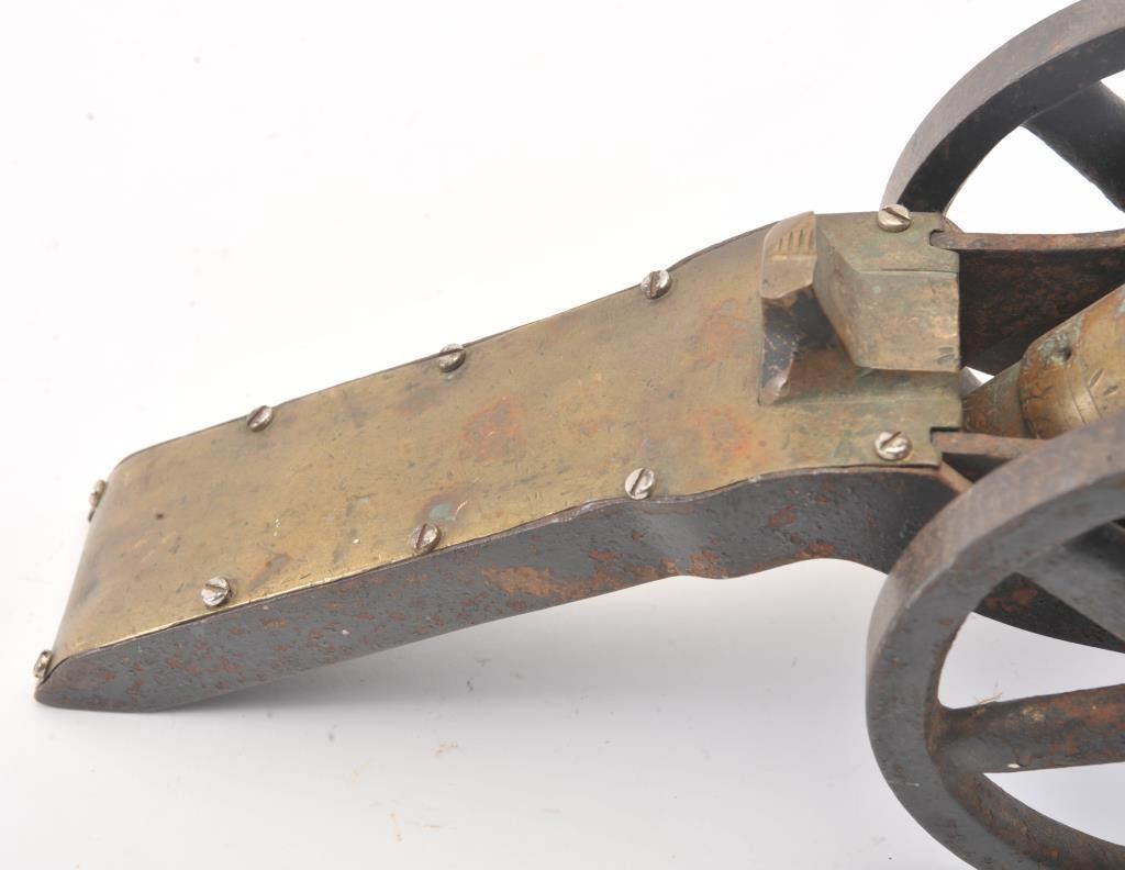 Interesting antique salute or signal cannon with bronze tube and iron wheels and brackets circa 19th to 20th century. Measures approximately 16" from tip to end with an 8" tube. Weighs 13.8 lbs. and approximately .70bore. Deep patina with rust and pitting on iron. Est.: $175-$350