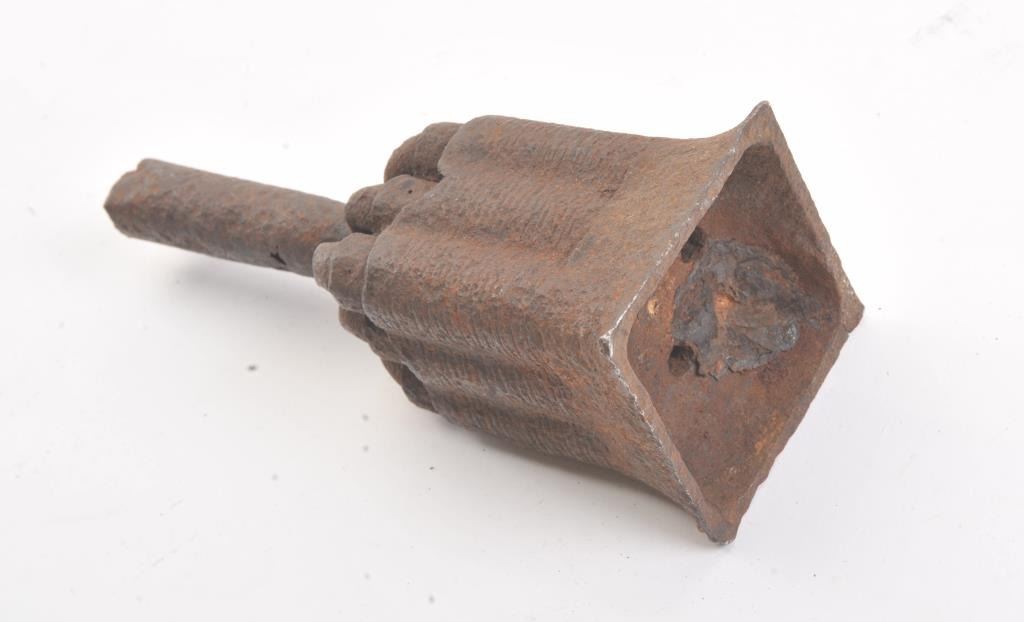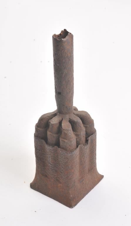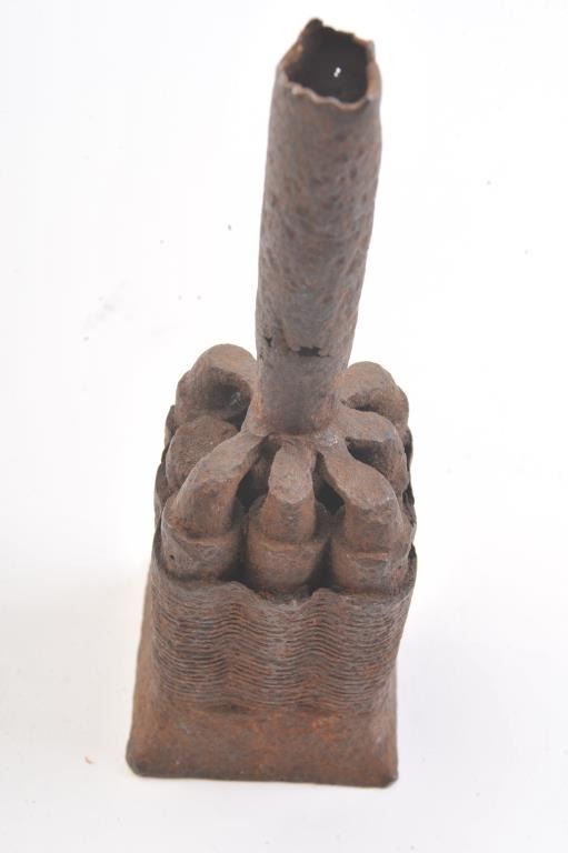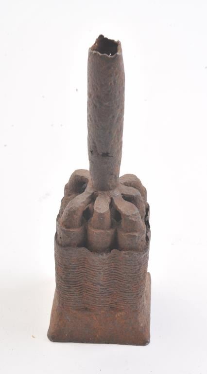 Antique Chinese hand cannon 9 shot with 1 plugged at the muzzle. 9" x 3 1/8" across squared muzzle. Circa 15th to 18th century. Heavy rusted and authentic. Good for display of earliest type ignition and multi-shotarms. Est.: $175-$350